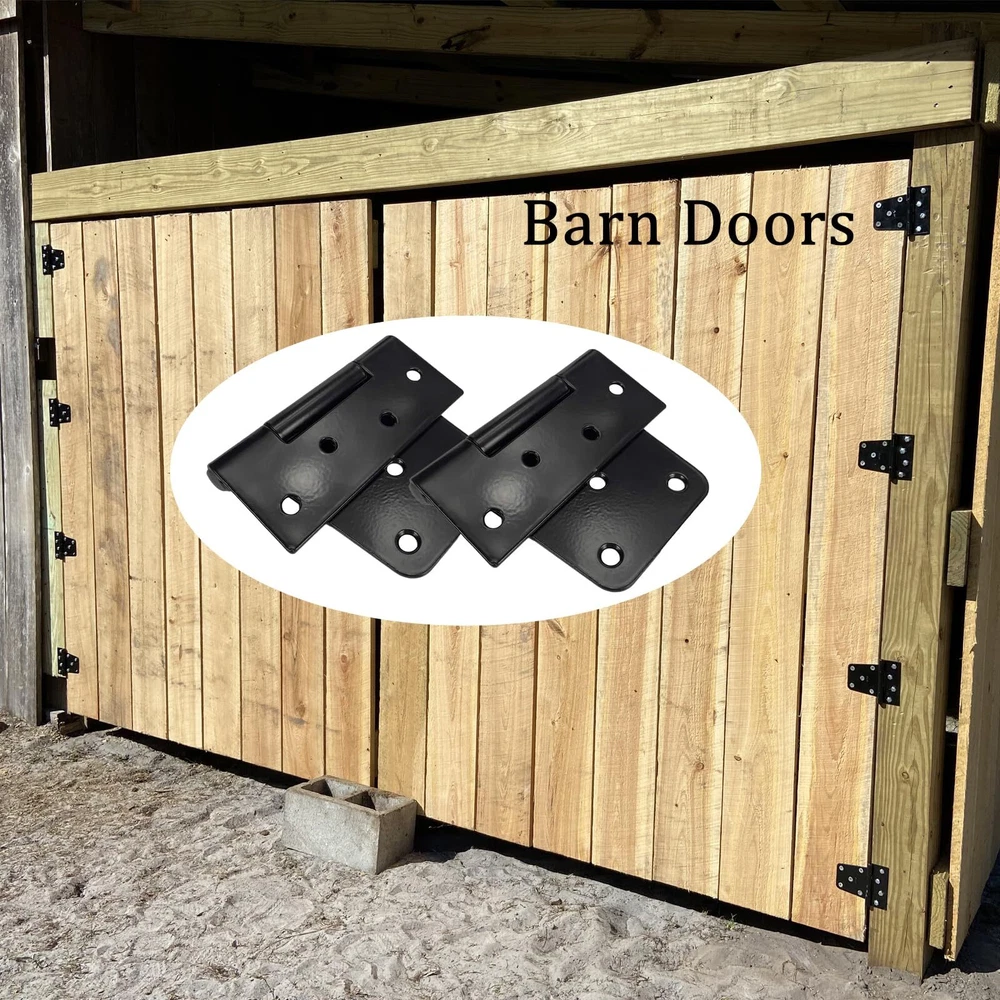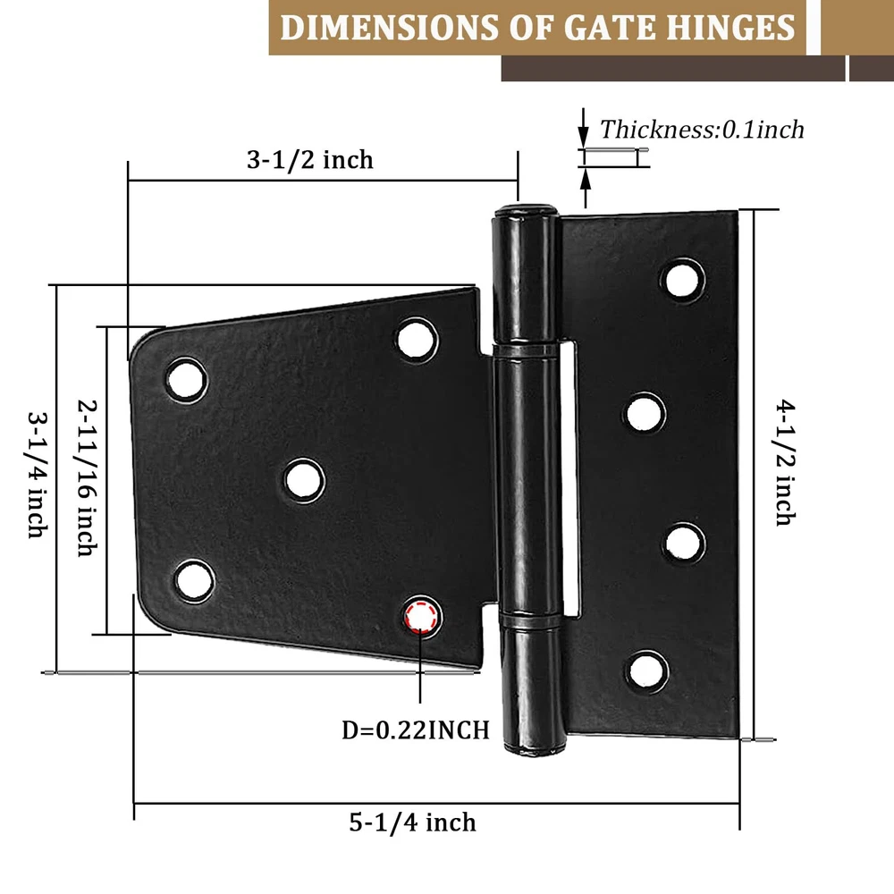 AYAYGD 3.5 Inch Heavy Duty Gate Hinges, 2 Pack Black Iron Door Hinges for Wood Sheds, Barns, Fences, and Swing Doors, Rustproof and Easy Installation with Screws Included GATE HINGE OF FEATURES - Black coated finish, Anti-corrosion and rustproof , durable and long last design. - The hinge's damping oil feature ensures quiet and creak-free opening and closing. - Easy to install: door hinges black matte includes mounting screw attachment and can be rotated 270 degrees. - Suitable for most doors and windows, such as gates, barn doors and shed doors, wooden fences, storage boxes, etc. BARN DOOR HINGES OF SPECIFICATIONS Type: swinging door hinge Size: 3.5 inches Material: Steel Finish: Black Coating RUSTPROOF GATE HINGES OF PACKAGE 2 x Wood Fence Gate Hinges 18 x M4 self-tapping screws PREMIUM MATERIALS: Made of 0.1" thickness solid steel, these 3.5 Inch Gate Hinges offer maximum capacity of 60 lbs, preventing gate doors from sagging. DIMENSION OF GATE HINGES :3.5 inches x 3.2 inches for swing part and 1.8 inches x 4.5 inches for fix part, with a thickness of 0.1 inches, suitable for various gate types. RUST-RESISTANT: With a matte black coating finish, these Black Iron Door Hinges are designed to withstand outdoor conditions, ensuring long-lasting use. Easy Installation: The Wood Fence Gate Hinges come with all necessary screws and offset screw holes for simple and strong installation, preventing wood from splitting. VERSATILE USE: Wrought Iron Gate Hinges suitable for both indoor and outdoor applications, including barns, fences, farm gates, playhouses, sheds, deck boxes, and cabinets.