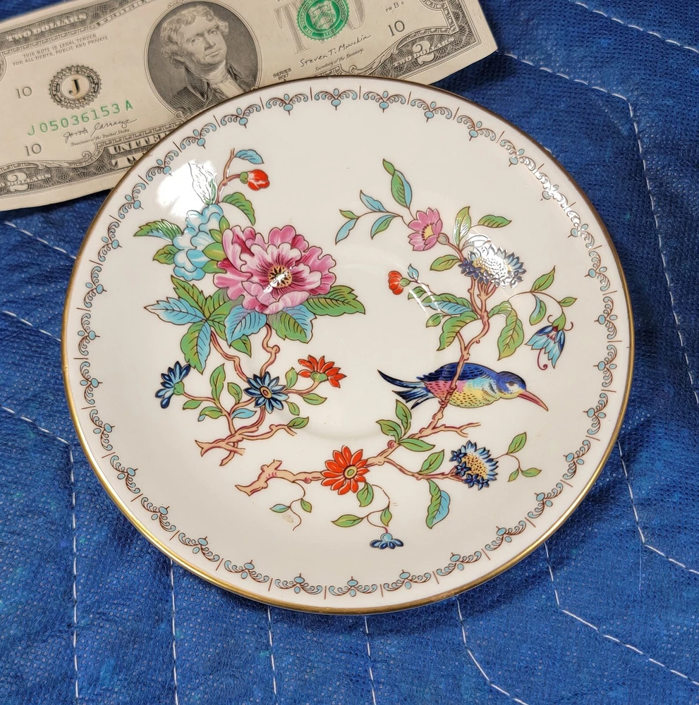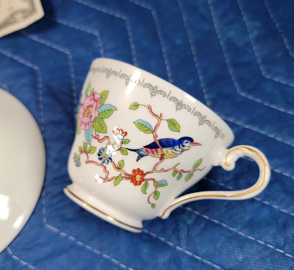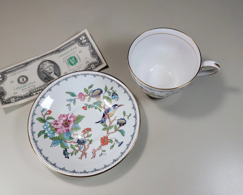 AYNSLEY Pembroke (Gold Trim) Cup & Saucer DIMENSIONS: Saucer: 5 1/2" diam. Cup: 2 1/2" tall x 4 1/4" x 3 1/4". Total weight: 10 ounces. DESCRIPTION: 1 vintage cup and saucer. By AYNSLEY. Pattern: Pembroke. Bone china. Multicolored birds and flowers on white with gold rim accent. Back stamp: green crown mark "Aynsley - Est. 1775 - Made in England - Fine English Bone China"; "Pembroke - Reproduction of an Eighteenth Century Aynsley design". 1985-2015. CONDITION: Excellent gently used condition. No damage and no significant wear. No restoration. Condition is consistent with seldom gentle use and careful handling. Most of these pieces appear unused or barely used. No nicks, fleabites, chips, cracks. No significant scratches or rubs. No crazing. No residues, scale, stains or discolorations. No wear to the floral decoration. Clean, bright, shiny. On very close inspection in glancing light you may detect some very light, typical use-related surface wear which may include: scattered small utensil scratches to the glaze; scattered minute wear to the gold rim accent. Nothing at all significant or conspicuous.