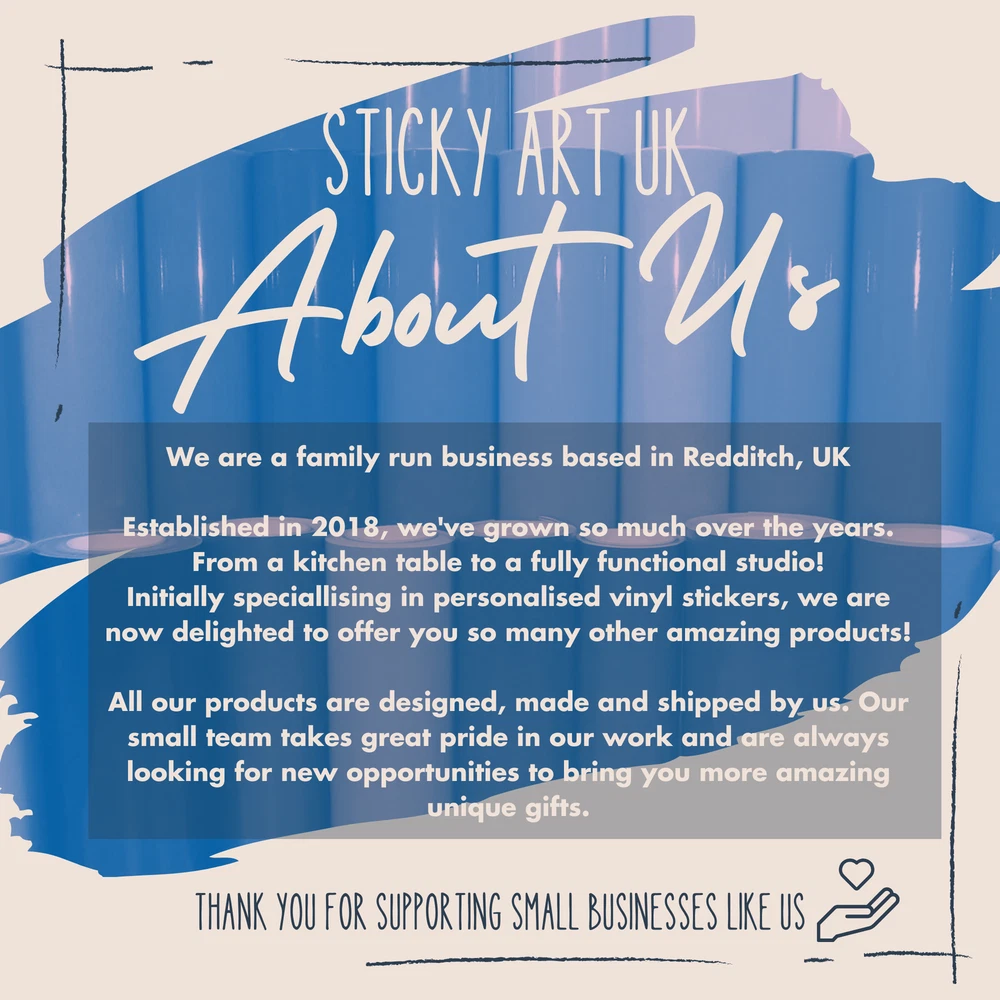 Keep your vinyl records organised with these beautiful dividers! With letters A-Z, you can store your LPs in alphabetical order, helping you find that golden album quicker. With multiple finishes available and quick handling time, these make the perfect gift for vinyl record collectors. We aim make and dispatch these the same day. • Dimensions: 15cm Width x 4cm Height x 0.3cm Depth • Available Finishes: Birchwood, MDF, & MDF covered with coloured vinyl. (Wide range of beautiful colours to choose from) • Set Type: Full alphabet (A-Z) - 26 letter dividers. *Double sided, can read from the left or the right* • About Sticky Art UK Everything we sell is unique and handmade in the UK by either myself or my wife. Occasionally our 2 beautiful children decide to “help” us so you will receive your product with a lot of love and care taken to ensure it’s perfect for you. We always aim to dispatch your item the same day but occasionally it will be sent the following day. We hope you enjoy your purchase and please send us pictures of your fabulous creations as we love to see them. H O M E R E V I E W S C O N T A C T A L L G I F T S S E A S O N A L C E L E B R A T I O N S H O M E O T H E R A-Z Dividers For Vinyl Records - Alphabetical Order, LP Organiser, Separator Keep your vinyl records organised with these beautiful dividers! With letters A-Z, you can store your LPs in alphabetical order, helping you find that golden album quicker. With multiple finishes available and quick handling time, these make the perfect gift for vinyl record collectors. We aim make and dispatch these the same day. • Dimensions: 15cm Width x 4cm Height x 0.3cm Depth • Available Finishes: Birchwood, MDF, & MDF covered with coloured vinyl. (Wide range of beautiful colours to choose from) • Set Type: Full alphabet (A-Z) - 26 letter dividers. *Double sided, can read from the left or the right* • About Sticky Art UK Everything we sell is unique and handmade in the UK by either myself or my wife. Occasionally our 2 beautiful children decide to “help” us so you will receive your product with a lot of love and care taken to ensure it’s perfect for you. We always aim to dispatch your item the same day but occasionally it will be sent the following day. We hope you enjoy your purchase and please send us pictures of your fabulous creations as we love to see them. CHECK OUT OUR OTHER AMAZING PRODUCTS! Space Cats Wall Sticker Pack - Cute Funny Cat Themed Home Decor - Space Decal SHOP NOW! Personalised Christmas Jumper Ornament - Custom Name, Rustic Wooden Bauble SHOP NOW! Funny Wedding Welcome Sign - Personalised Sticker For DIY Welcome Sign SHOP NOW! Personalised Rose Gold Chrome Name Sticker Vinyl Decal Bottle Wine Glass Box Hen SHOP NOW! Thank You For Helping Me Grow Plant Tag - Cute Thoughtful Gift For Teacher SHOP NOW! Passenger Princess Car Mirror Decor Sun Visor Mirror Princess crown - 13cm width SHOP NOW! Tears Of My Staff Mug - Joke Mug Gift For Boss, Funny Work Mug SHOP NOW! Personalised Metal Pen - High Quality Laser Engraved - Perfect Gift Birthday SHOP NOW! Shipping Returns Contact Us Applying Our Stickers About Us Shipping Shipping Returns Contact Us Applying Our Stickers About Us Shipping Shipping We strive to provide same-day shipping for orders placed before 2 p.m. Any orders placed after 3 p.m. will be shipped the following day. You can opt for the delivery option that best fits your needs. Royal Mail delivery times guide: 1st Class: 1-10 days 2nd Class: 2-10 days Special Delivery: 1-2 days guaranteed. To ensure timely delivery, kindly review any personalisation details for accuracy. Any errors in the details could result in delays in shipment. Shipping Returns Contact Us Applying Our Stickers About Us Returns Shipping Returns Contact Us Applying Our Stickers About Us Returns Returns Our company offers a 7-day return policy on all items except custom-made or personalised ones. However, if there are any issues, snap a photo, contact our team for assistance, and we'll work to resolve any manufacturing mishaps. We take pride in our products and services and aim to ensure customer satisfaction. Shop with confidence, knowing we've got your back. Shipping Returns Contact Us Applying Our Stickers About Us Contact Us Shipping Returns Contact Us Applying Our Stickers About Us Contact Us Contact us If you have any questions, concerns, or feedback, please do not hesitate to contact us. We are always here to help and support you in any way we can. You can reach us by phone or email. A member of our dedicated team will be available to assist you with any inquiries you may have. We value your input and strive to provide the best possible experience for our customers. Thank you for choosing to reach out to us, and we look forward to hearing from you soon. Shipping Returns Contact Us Applying Our Stickers About Us Applying Our Stickers Shipping Returns Contact Us Applying Our Stickers About Us Applying Our Stickers Applying Our Stickers Our stickers are suitable for smooth surfaces such as walls, glass, plastic, and wood. Not suitable for clothing or fiber materials. Textured / Rough / Bumpy surfaces are not suitable for stickers. Our stickers are not suitable for balloons as there are far too many issues with the application process! Use a clean dry cloth with warm water to fully clean the surface you are applying the decal to. Please make sure the surface is FULLY dry and clean before applying the decal. Turn the decal over and rub back and forth a few times with a dry clean cloth to ensure the decal transfers to the application tape. Now SLOWLY peel the application tape off which will bring the decal with it. If any part of the decal doesn’t transfer then stop and slowly rub the reverse of the decal and continue to remove the application tape at the same time. Now apply the decal to the area you cleaned and ensure it’s straight before applying it fully. Now rub all over with the clean cloth to make su