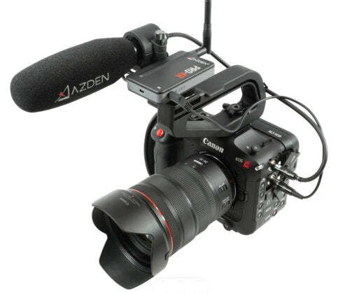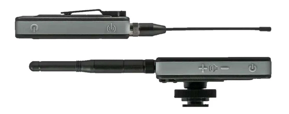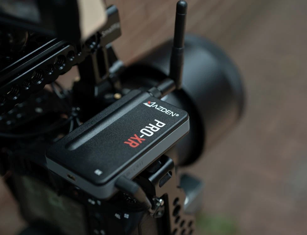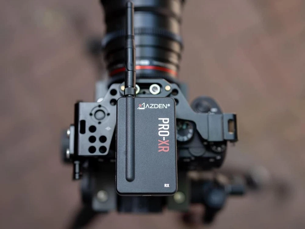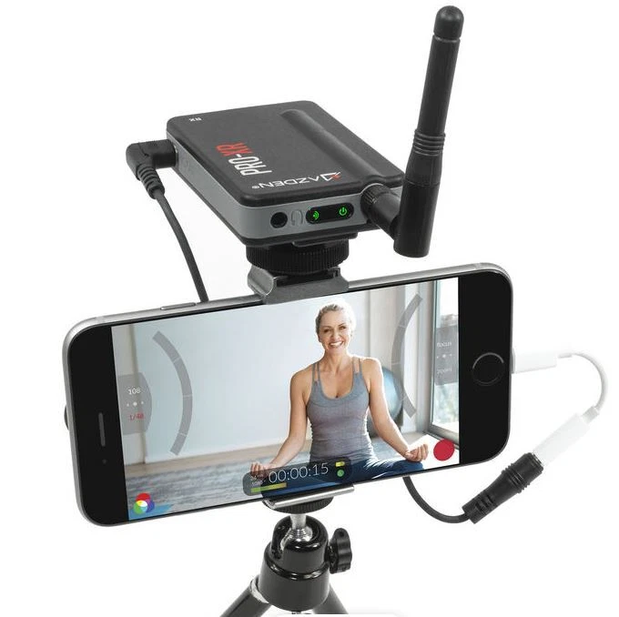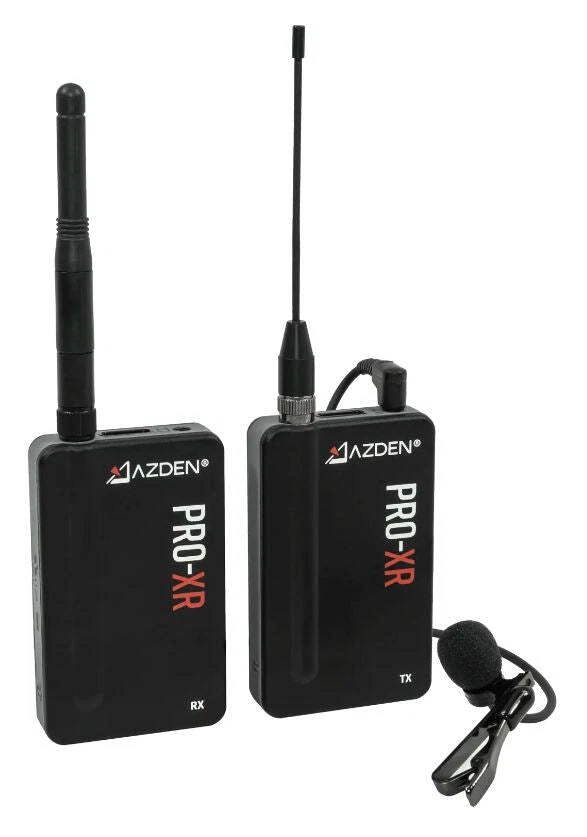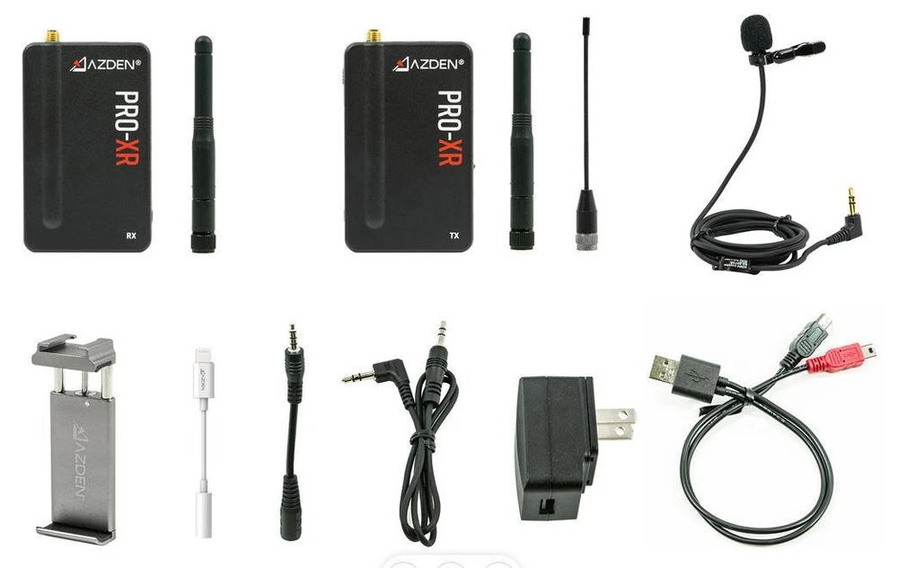 Dual channel digital communication provides total interference-free audio up to 300 feet 2.4 GHz digital wireless receiver with shoe mount, transmitter includes belt clip Includes TRS cord for connection to DSLRs and other cameras Includes TRRS audio adapter cable for smartphones Includes adapter cords for all iPhones 4, 5, 6, 7 -12), works with Android phones including SAMSUNG Galaxy, LG and most others Transmitter and receiver include internal Li-ion rechargeable batteries and provide more than 8 hours of continuous service depending on transmitter power setting. This wireless digital communication system is totally free of interference and noise and surpasses all other FM modulation wireless devices. The AZDEN PRO-XR digital wireless Lav microphone kit is ideal for all talking head and interview video production work. Includes 3.5mm cord for connection to DSLRs. When connecting to the XLR inputs of some camcorders, a 3.5 mm mini-phone to XLR adapter cord accessory is required (see accessories below). Further fortifying the system’s resistance to interference, PRO-XR employs Azden’s proprietary Signal Redundancy Technology, in which the transmitter sends two copies of its signal to the receiver at all times, each on a different frequency. If the receiver predicts interference of the primary signal, it will instantly switch to using the secondary signal without any interruptions. The transmitter power output is adjustable. You can increase the transmission output power of the transmitter to adapt to challenging environments. Use the default 20 mW setting for optimal battery life and excellent performance in most situations. Optionally increase the output power to 50 mW or 100 mW for better performance at extreme distances, or to overcome line-of-sight obstructions and over-crowded Wi-Fi environments. Combining the 100 mW output with the use of the included high-gain transmitter antenna can extend the range of the system up to an incredible 500 feet. Increasing the transmitter power will reduce the battery. Utilizing digital wireless technology, the AZDEN PRO-XR operates in the 2.4GHz range which is completely free of TV and radio interference. The PRO-XR outperforms similarly priced VHF and UHF systems with better than CD quality digital audio. This system delivers dependable operation to a distance of 200 feet (and beyond with direct line of sight). Start up is quick and reliable with automatic syncing between receiver and transmitter. These units have internal Li-ion rechargeable batteries with a USB charging ports. The output of the wireless receiver is a stereo 3.5 mm mini-phone jack. The receiver includes a 3.5 mm mini-phone stereo headphone monitor jack. The included smartphone adapter cords allows direct connection to the headphone port on your smartphone, or the lightning port on iPhones. It also includes an charging AC adapter with dual charging cord and a smartphone mount with tripod thread. While many other digital wireless systems are moving to under-performing internal antennas, the PRO-XR system employs a more reliable external antenna design and comes with two interchangeable antenna options for the transmitter: a flexible antenna for comfortable and inconspicuous wearing of the transmitter, and a high-gain antenna for increased performance especially at long distances and with line-of-sight obstruction. This product does not include an iPhone or any camera. Specifications AZDEN PRO-XR SPECIFICATIONS Operating Freq.: 2.4 GHz ISM Band Signal-To-Noise: 86 dB (Max. input :-22dBv A-weighted) Dynamic Range: Mic: 90dB, Line: 87dB Operating Range: up to 350 feet in optimal conditions Freq. Response: Mic: 60 Hz – 20 kHz, Aux: 30 Hz – 20 kHz Bit Rate: 384 kbps System Latency: 4.5 ms Battery Life Span: 500 cycles with >70% of peak performance Battery Type: Lithium-ion polymer, 3.7 V, 1200 mAh, 4.44 Wh Power Supply: USB 5V RECEIVER Max Output Level: 1.5 dBV Mic Output: Φ3.5 mm dual-mono TRS Headphone Output: Φ3.5 mm stereo TRS Output Impedance: Mic: 2 kΩ; Headphone: 10 Ω Battery Life: 20 hrs Charge Time: 2.5 hours Dimensions: 48x79x14 mm (W/H/D) Weight: 76 g TRANSMITTER RF Output Power: 20/50/100 mW Mic Input: Φ3.5 mm dual-mono TRS Aux Input: Φ3.5 mm stereo, line level Input Impedance: Mic: 9.1 kΩ / Aux: 100 kΩ Max Input: Mic: -22 dBV / Aux: -2 dBV Battery Life: ≅14 hrs @ 20 mW / ≅12 hrs @ 50 mW / ≅10 hrs @ 100 mW Charge Time: 2.5 hours Dimensions: 48x79x14 mm (W/H/D) Weight: 65 g MICROPHONE Mic Element: Electret Condenser Polar Pattern: Omni-Directional Freq. Response: 20 Hz~20 kHz Sensitivity: -38 dB @1 kHz, 0 dB=1 V/Pa Impedance: 2.2 kΩ @1 kHz Power Requirement: Plug-in power DC 1-10 V Connector Type: Φ3.5 mm TRS Cord Length: 1.2 m