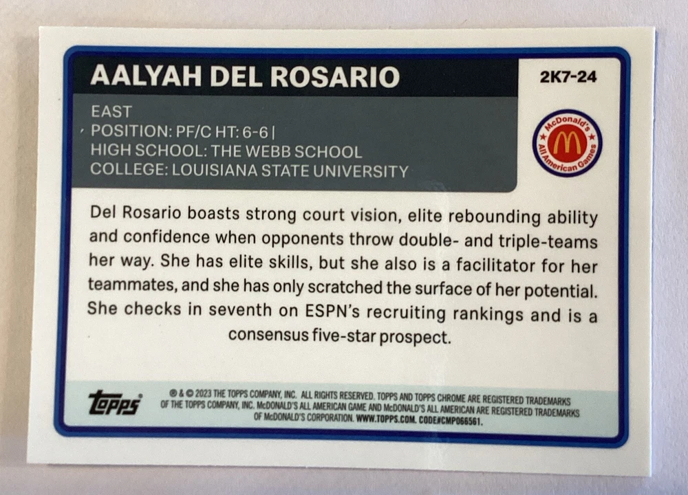Introducing the Aalyah Del Rosario 2023 Topps Chrome McDonald's All-American Refractor #2K7-24LSU basketball trading card. This limited-edition card is a must-have for collectors and fans alike. Featuring a stunning silver prizm refractor design and printed on high-quality card stock, this card is sure to be a prized addition to any collection. The card is part of the 2023 Topps Chrome set and is a short print with a chrome refractor parallel/variety. It features Aalyah Del Rosario, a rising star in the National Basketball Association (NBA), and commemorates her participation in the McDonald's All American event. This card is a great way to remember her performance during the event, without mentioning the condition of the card. Don't miss this opportunity to own a piece of basketball history!