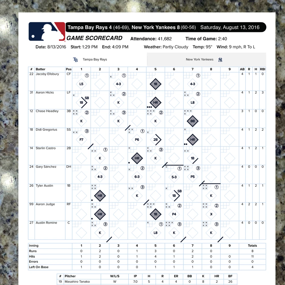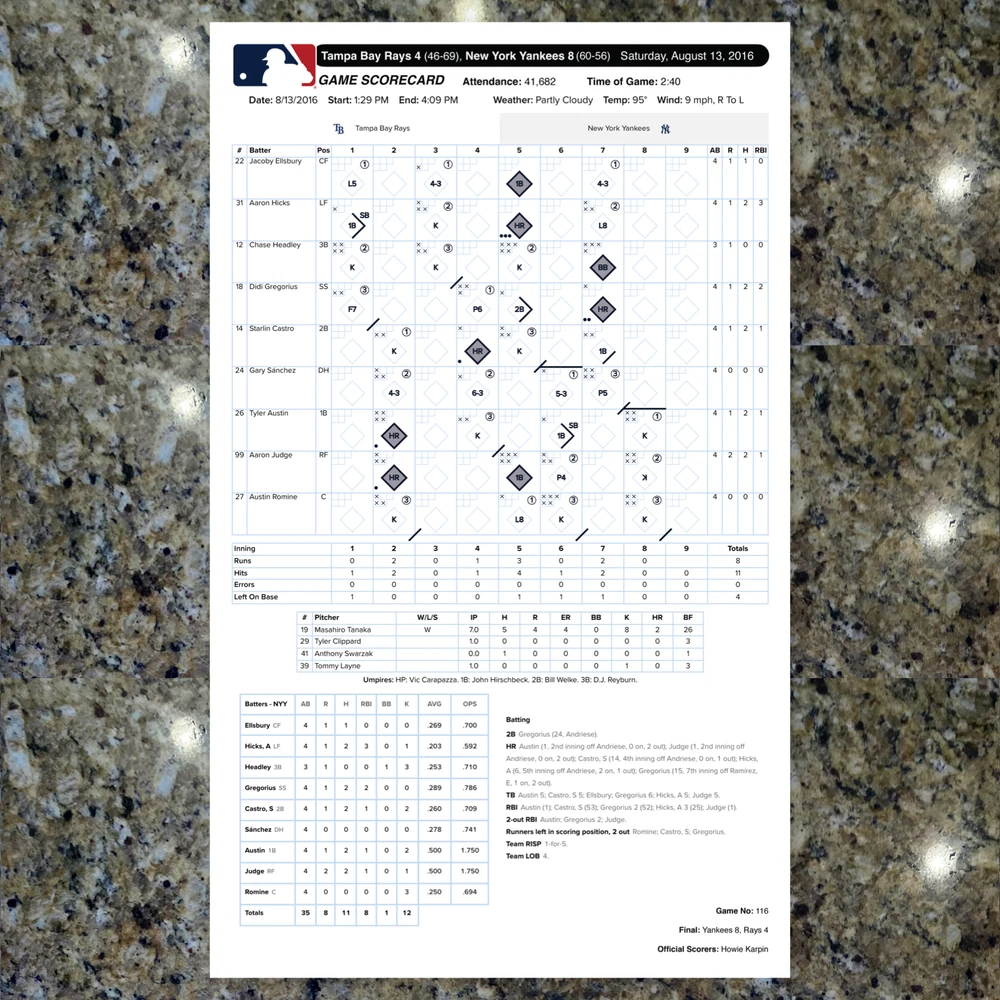 Gameday Media / Broadcast / Press / Team Game Sheet Lineup Card Item: Aaron Judge MLB Debut Date: August 13, 2016 Size: 8.5"x14" Teams: Yankees vs Rays Judge made his MLB debut on August 13, 2016, starting in right field against the Tampa Bay Rays. Hit a home run in his first at bat! Tyler Austin had done so on the at bat before.This marked the first time that two teammates hit home runs in their first MLB career at-bats in the same game. A piece of history! For the game day for the press, broadcasters and teams. Smoke and pet free home.