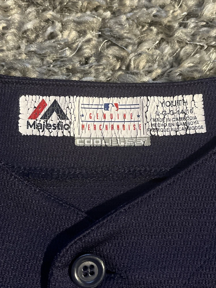 Show your love for the New York Yankees and Aaron Judge with this officially licensed Majestic button-down jersey. The blue jersey features Judge's number 99 and is perfect for any young fan in size L 14/16. Made in Cambodia, this unisex children's jersey is perfect for baseball enthusiasts who want to represent their favorite team during regular season games. Get ready to cheer on the Yankees and Aaron Judge with this stylish and comfortable jersey.
