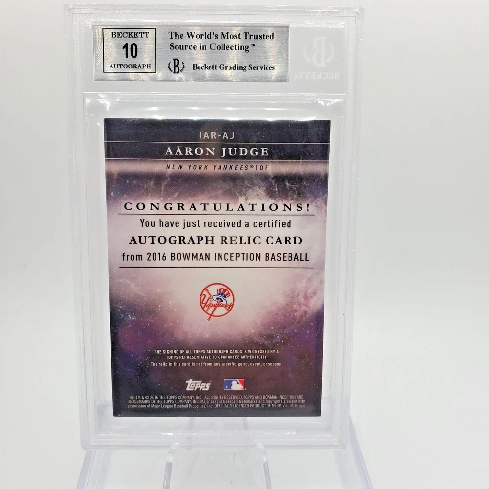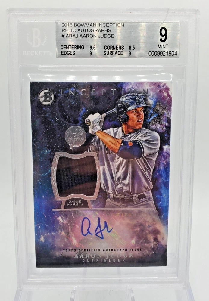 Elevate your baseball memorabilia collection with the Aaron Judge Relic Auto card from the 2016 Bowman Inception series. Graded BGS 9, this card features a authentic autograph from the New York Yankees' star, verified by Beckett Authentication Services. The Relic Autograph parallel variety adds an extra layer of exclusivity to this already coveted piece. In addition to the signature, the card boasts an insert feature and showcases a piece of memorabilia that celebrates Judge's impressive 2016 season. Whether you're a die-hard Yankees fan or a serious card collector, this card is a testament to Judge's potential and a prized asset for any collection. There is a crack in the slab above the grade but the slab where the card sits is untouched.