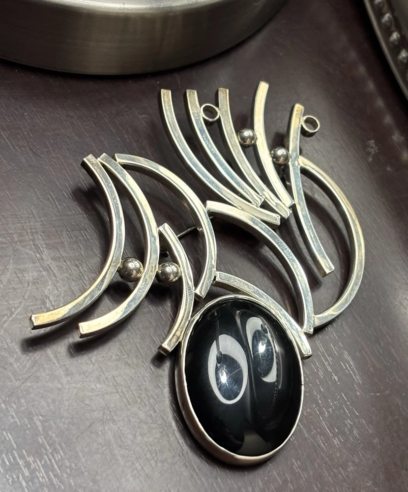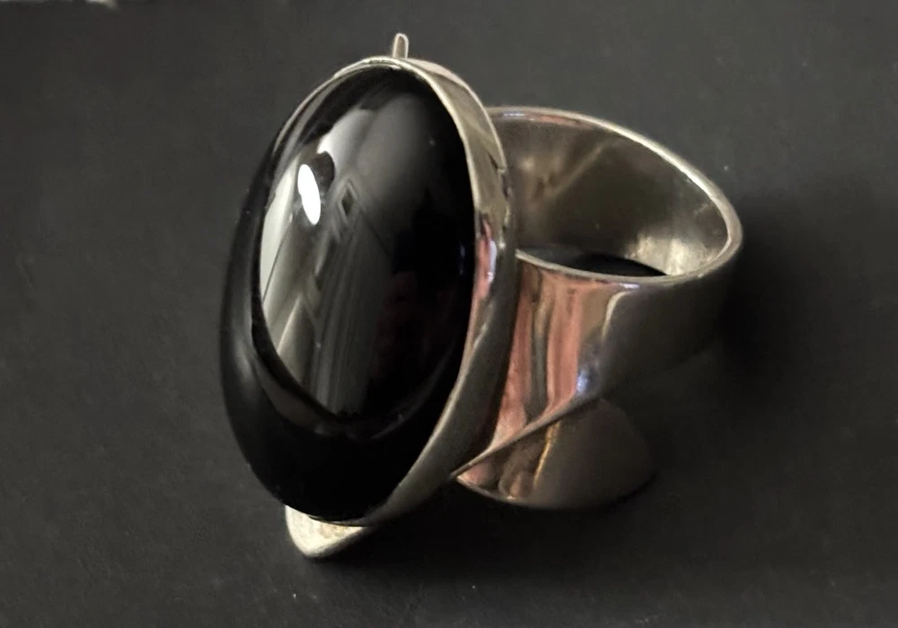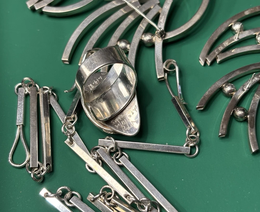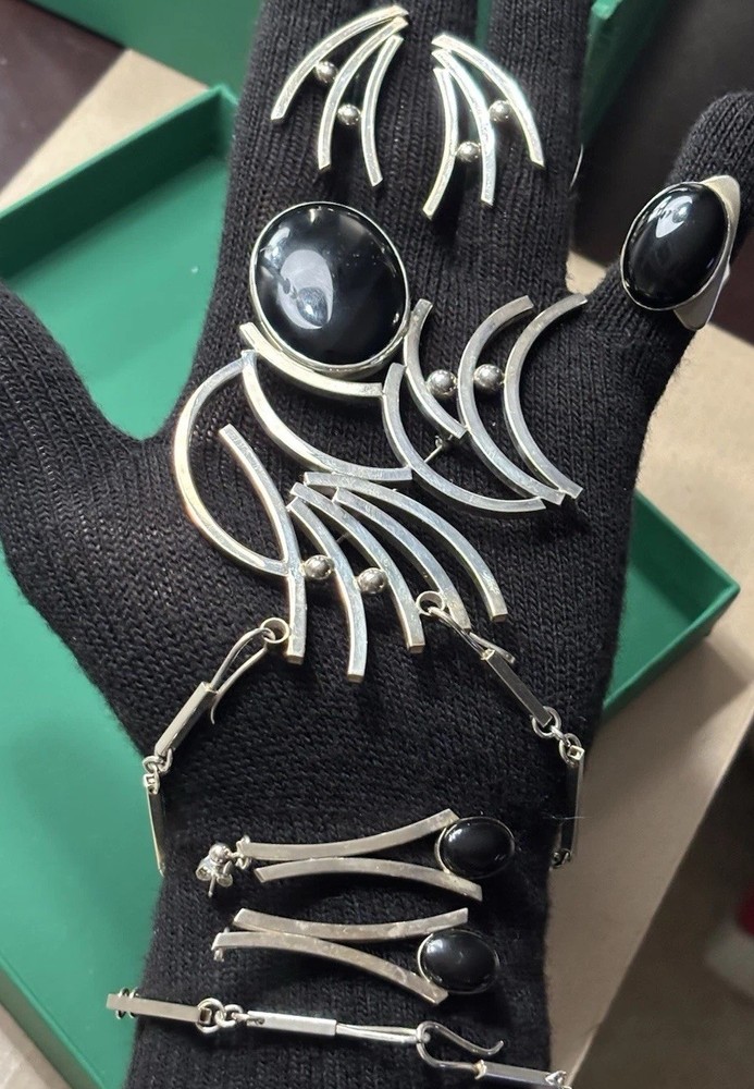 Aaron Rubinstein Sterling Silver Onyx Collection - Sterling Silver Pendant NECKLACE with an etched signature Aaron Rubinstein and is dated. -Black Onyx handcrafted sculptural sterling silver adjustable RING features a freeform black onyx cabochon (18 mm x 13 mm) -Pair of beautiful dangle EARRINGS created from sterling silver and Onyx. -Additional Pair of Modernest EARRINGS with artist etched initials. -Also included extension links for pendant. AS-PICTURED 🔹PRIVATE COLLECTION