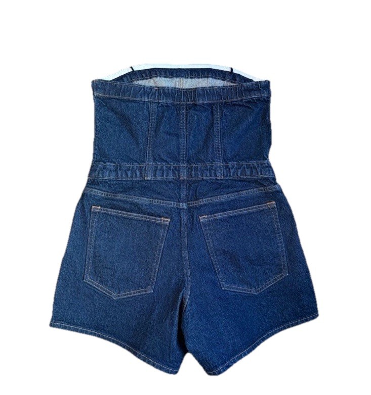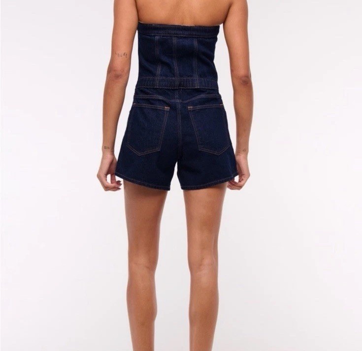 The product is a stylish Abercrombie & Fitch jean strapless short romper in size medium. This one-piece romper features a square neckline, sleeveless design, zip closure, and is made of denim fabric. It is suitable for various occasions including travel, parties, and casual wear. The romper comes in a classic blue color and has a regular fit. With features like easy care, comfort, and pockets, this romper is perfect for the summer and spring seasons, making it a versatile addition to any woman's wardrobe.