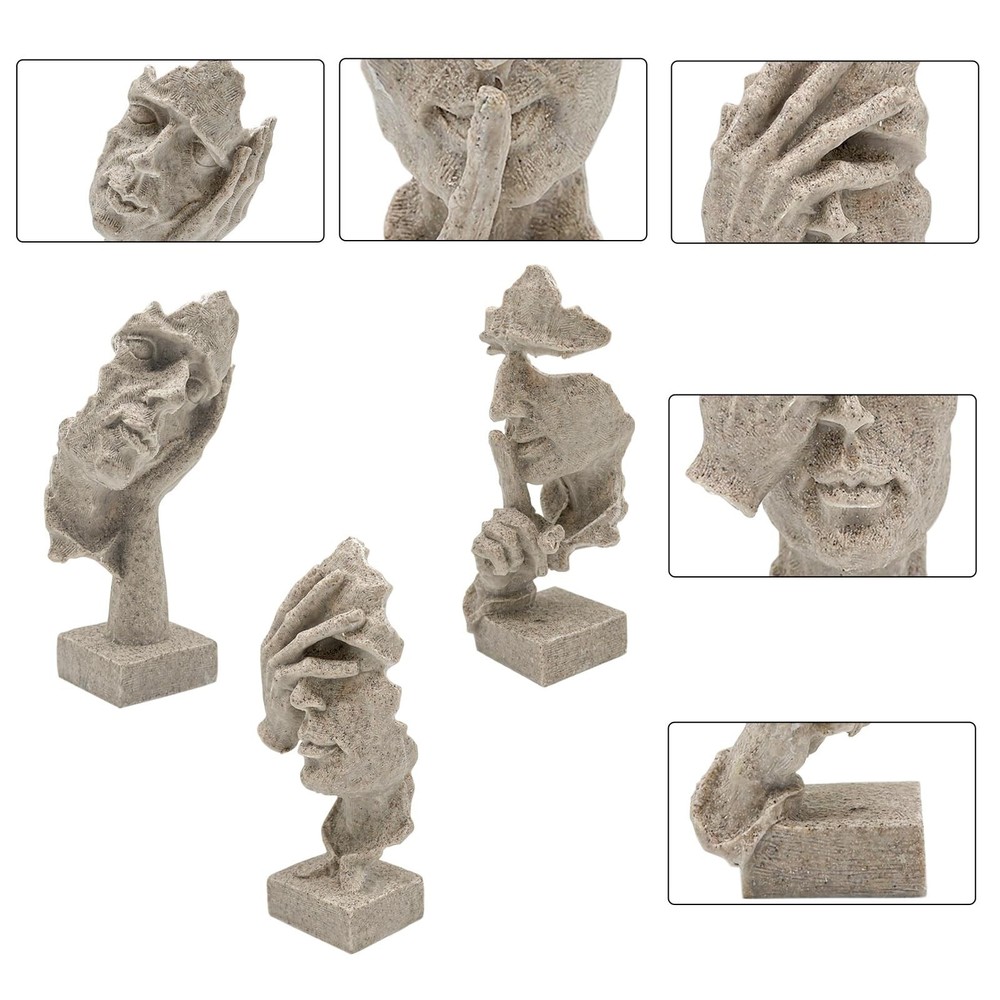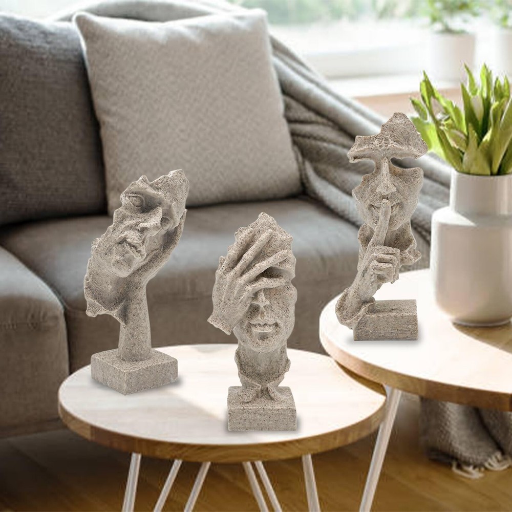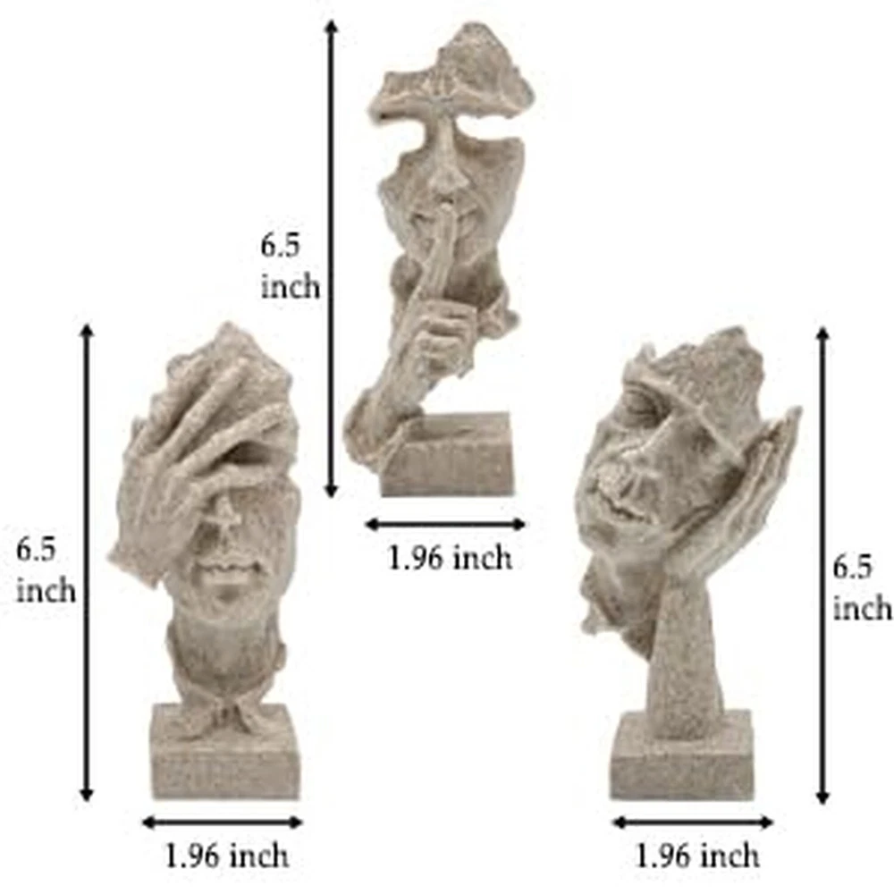aboxoo 3 Pcs Thinker Statue, Silence is Gold Abstract Art Figurine, No Hear No See No Speak Modern Home Resin Sculptures Decorative Objects Modern Decor for Creative Room Home, Office Study(Sandy) Product Details Size: Medium Color: Sandy Brand: aboxoo MPN: ZY2884 UPC: 758283799523 EAN: 0758283799523 Color: Sandy Brand: aboxoo Theme: Home Decor Material: Resin Style: Modern Color: Sandy Brand: aboxoo Theme: Home Decor Material: Resin Style: Modern Product Dimensions: 10.43"D x 3.54"W x 8.46"H Recommended Uses For Product: Home Mounting Type: Tabletop Cartoon Character: Abstract Special Feature: Handmade Product Care Instructions: Wipe Clean Collection Name: All Seasons: All Seasons UPC: 758283799523 Number of Items: 1 Item Weight: 1.78 pounds Manufacturer: aboxoo Country of Origin: China Item model number: ZY2884 Date First Available: January 30, 2024 Handmade Crafts&Beautiful Design: retro resin, abstract art, beautiful and vivid art. Vivid facial gesture modeling. Administrative levels are different, line outline is concise and clear, stereo feeling is strong, simple sense is strong, enjoy the beauty of life, let your home be simple individual character. The model of the thinker, silence is golden. It is the crystallization of human wisdom, fully embodies the creativity and artistry of human beings. Product Size: L/W/H:7.9"/7.9"/4.3" inches (20 * 20 * 11cm). Each product is individually carved by hand, the size may be a little wrong. Creative sculpture using high quality resin as the main raw material, after mold casting, 100% new, high quality. No odor, non-toxic and harmless. Design Concept: "Three No's": don't listen to what you shouldn't hear, don't look at what you shouldn't see, learn that silence is golden, avoid unnecessary mistakes, avoid disputes, and always follow a calm mind to walk, expressing the idea of not looking, not listening, and not talking. With black as the main color, the black decoration symbolizes solemnity and dignity.It is a symbolic sculptural ornament. Home Decor:Creative home decoration living room unique and interesting sculpture decoration design. Suitable for space, bookcase, bookcase, desk, table top, wainscoting, window, porch. Can be placed in the office, living room, counter, study, office or company, enhance the artistic atmosphere of the environment.Its perfect size makes it easy to adapt to a wide range of furniture. Rating Explanation: The customer's shopping experience is very important to us, and all the new batch of products have been upgraded and improved, and they are given to customers at a very affordable price. I hope this can enhance our reputation, and you will be very satisfied with the receipt of the goods. aboxoo 3 Pcs Thinker Statue, Silence is Gold Abstract Art Figurine, No Hear No See No Speak Modern Home Resin Sculptures Decorative Objects Modern Decor for Creative Room Home, Office Study(Sandy)
