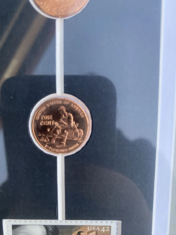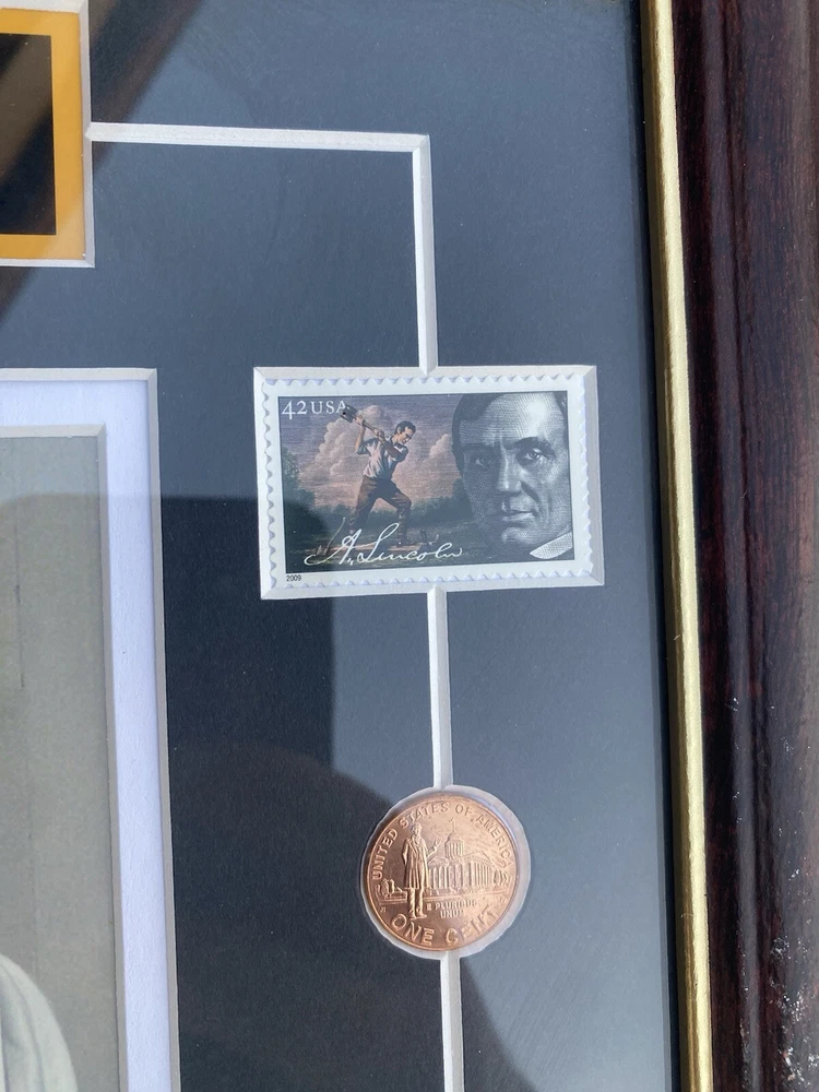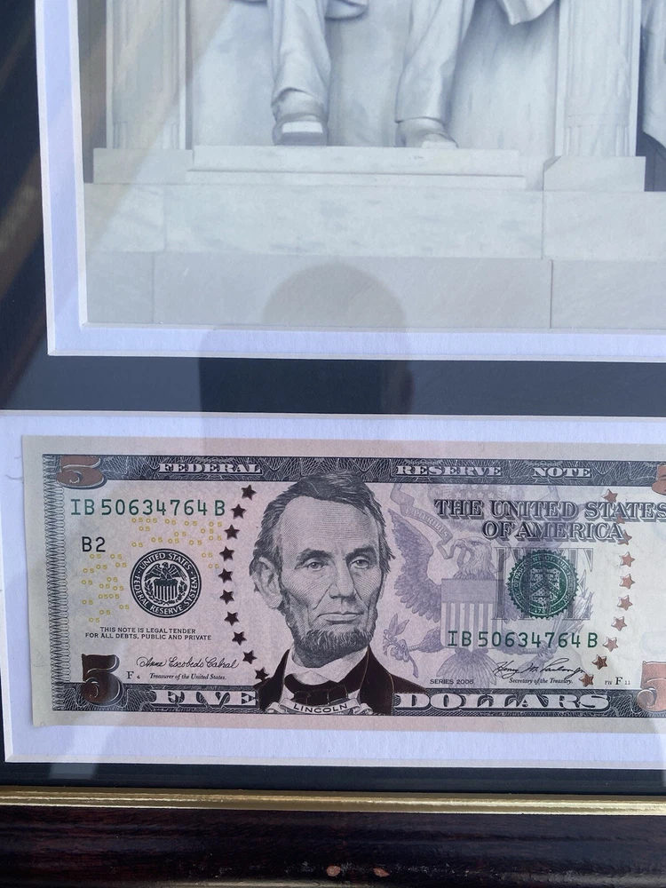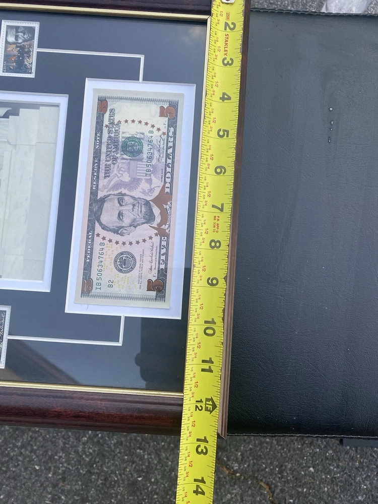 This Abraham Lincoln Coin 5 dollars Currency and Stamp Commemorative Collection is a must-have for any coin collector or history enthusiast. Made in the United States, this collection features a unique combination of coins, currency, and stamps, all highlighting the iconic figure of Abraham Lincoln. The collection is perfect for those interested in US history and culture, and would make a great addition to any collection or as a gift for a fellow collector. Don't miss out on this opportunity to own a piece of history. In a frame under the glass