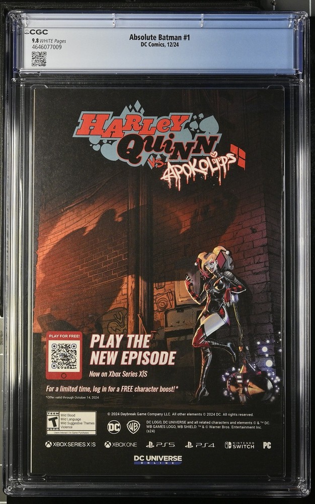 Welcome comic book community to the Destroyer of Worlds Comics store and our listing for Absolute Batman 1 CGC 9.8 We are a small shop and our focus is to bring the best buying experience to our customers. Destroyer of Worlds Comics is an authorized CGC Dealer which grants us access to the CGC database for all graded book details which are included in every listing along with the hi resolution scans taken by CGC. We know that buying comics online can be stressful so we proactively eliminate the most common sources of stress by packing our comics professionally using BCW Graded Comic Bags and then placing them into sturdy 200 lb test boxes to withstand any mishandling while in transit with the carrier. When we receive an order it becomes top priority and your order is immediately pulled from inventory and packaged properly to arrive in your hands as quickly as possible. Our goal is for you to not worry about your order arriving late or guessing when it will be shipped. When you buy from our store you will also receive hassle free 30 day returns and we will cover the shipping cost back to us if you decide to make a return. We hope our commitment to protecting comics and servicing our customers provides a trustworthy and pleasant experience and thank you for considering us. The images in the listing are the actual item you will receive after purchasing. If you have any questions prior to making a decision please reach out and we will answer promptly. We are located in southern Florida not far from CGC and add new listings regularly so please take a look at our other listings if you are looking for CGC graded books and favorite us as a seller if you enjoyed buying from us. CGC Certification Info Title: Absolute Batman Issue: 1 Grading Company: CGC Grade: 9.8 CGC Cert #: 4646077009 Page Quality: WHITE Issue Date: 12/24 Issue Year: 2024 Publisher: DC Comics Grade Category: Modern Total Graded By CGC: In 9.8: 3480 Grader Notes: None CGC Census Report CGC Database Query Time: 2026-02-07 14:21:30 Mint 10.0: 0 Mint 9.9: 3 Near Mint/Mint 9.8: 3480 Near Mint+ 9.6: 121 Near Mint 9.4: 35 Near Mint- 9.2: 23 Very Fine/Near Mint 9.0: 15 Very Fine+ 8.5: 14 Very Fine 8.0: 5 Very Fine- 7.5: 0 Fine/Very Fine 7.0: 3 Fine+ 6.5: 1 Fine 6.0: 0 Fine- 5.5: 0 Very Good/Fine 5.0: 0 Very Good+ 4.5: 0 Very Good 4.0: 0 Very Good- 3.5: 0 Good/Very Good 3.0: 0 Good+ 2.5: 0 Good 2.0: 0 Good- 1.8: 0 Fair/Good 1.5: 0 Fair 1.0: 0 Poor 0.5: 0 Case Condition We understand every collector has a unique set of standards when it comes to condition of the case and we often receive entire submissions with defects therefore we make every effort to note those conditions in the listing since they are often not visible in the scanned images. Nearly every case we receive from CGC has at least one of the following defects: grade on label not centered, label mounted crooked, newton rings, scuffing, scratches, case stress from the sealing process or inner well movement. To keep you informed before making a purchase decision we note major defects like cracks, newton rings, heavy scratches, and major scuffing in the listing but do not list the minor ones. If there are any flaws you dislike in particular please message us and we would be happy to review any of our listings and get back with you with every flaw we can find on the case. In the event the case arrives and is not to your satisfaction please reach out and we will offer to replace it if we have one available in better condition or a return can be opened at no cost within 30 days to receive a full refund. Pricing All fixed price listings are firm. We price our books at fair value according to recently sold listings but do realize prices fluctuate frequently when auctions are involved so we sometimes create auction listings for a chance at reduced prices for those who enjoy the thrill of the hunt. We also regularly run promotional coupon codes for volume discounts on orders of multiple fixed price listings so be sure to add listings to your watchlist and check back frequently. Shipping Policy Destroyer of Worlds Comics typically ships your items same day or next business day after payment is made. CGC graded comics are wrapped both vertically and horizontally in 5/16 inch bubble wrap and then placed into a 200 lb test corrugated box for protection. Ungraded comics are shipped in Gemini Comic Mailers. Combined shipping is offered for both domestic and international buyers. Please note for international orders any additional import fees duties taxes or customs charges are the sole responsibility of the buyer. These charges are determined by your country's customs office and we unfortunately have no influence over the amount charged or the duration of the assessment process due to the customs forms being automated. Please be aware that customs procedures and policies vary from country to country. If you have any concerns or questions regarding import fees duties or taxes we recommend contacting your local customs office before making a purchase. Return Policy Free returns available on all CGC graded books within 30 days of purchase.