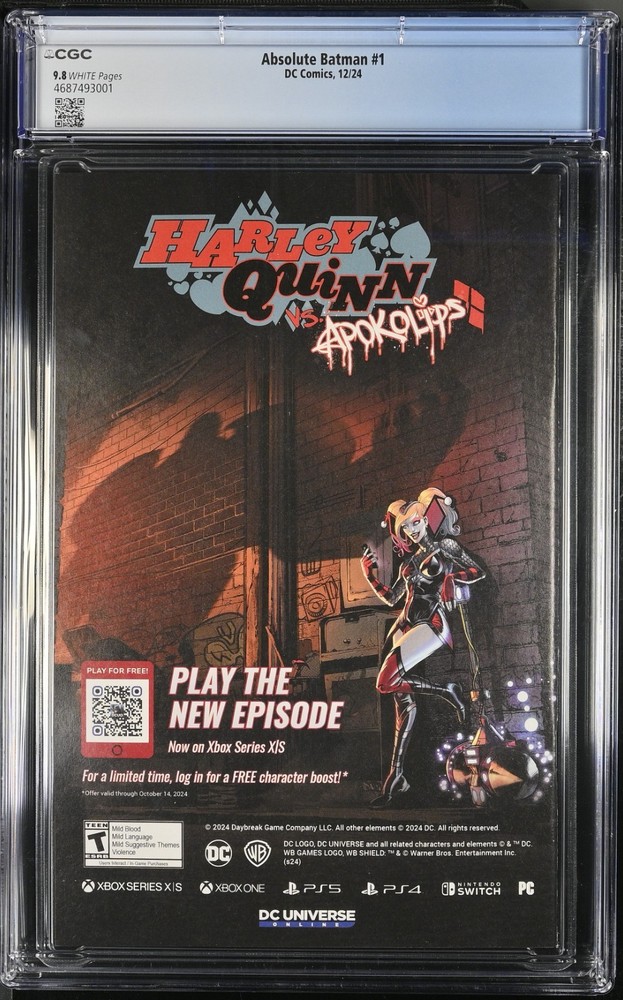 Absolute Batman #1 DC Comics – December 2024 CGC Universal Grade: 9.8 White Pages Story by Scott Snyder Cover & Art by Nick Dragotta This is a professionally graded copy of Absolute Batman #1 , part of DC’s ALL IN initiative. Slabbed by CGC with a near-perfect 9.8 grade and White Pages , making it a premium collector copy. A strong modern Batman key with high collector demand — especially in 9.8 condition. CGC Certification #: 4687493001 Grade: 9.8 (Universal) Page Quality: White Pages Case is in excellent condition with no visible cracks or damage. 📦 Shipping Ships via USPS Priority Mail Package will be prepared professionally to insure no to minimum damage to comic book.
