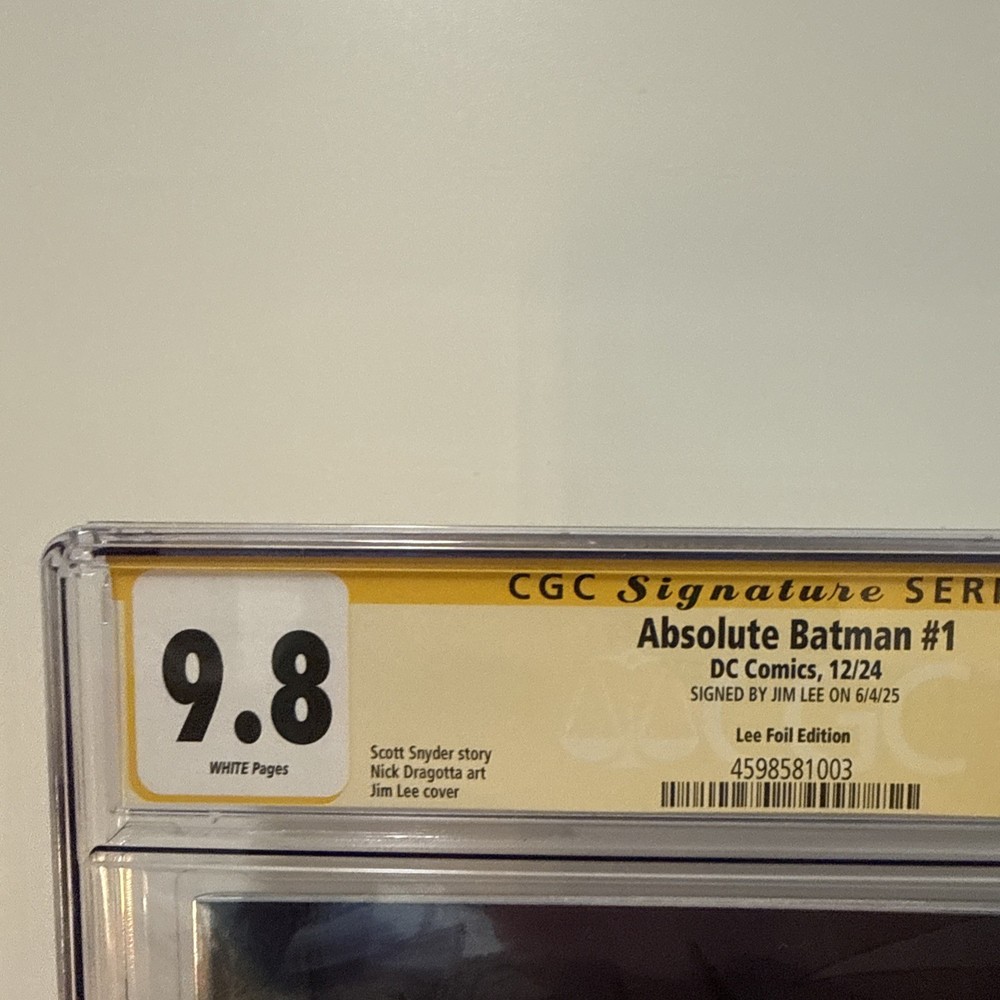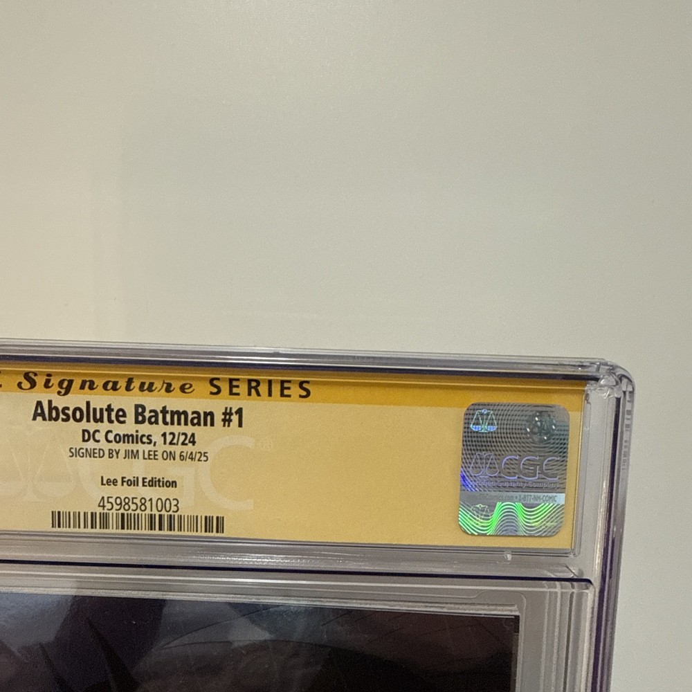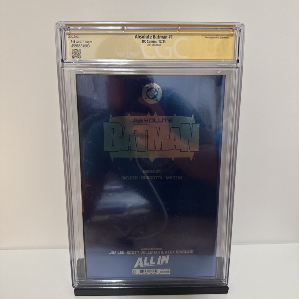 The product is a highly collectible Absolute Batman #1 comic book featuring artwork by renowned artist Jim Lee. This first print issue is signed by Jim Lee himself and has been professionally graded by Certified Guaranty Company (CGC) as a 9.8 Near Mint/Mint. The comic is part of the DC Universe and showcases the iconic superhero Bat-Man as part of the Justice League of America. It is a single issue in English language with vibrant color artwork, making it a sought-after item for fans and collectors alike.