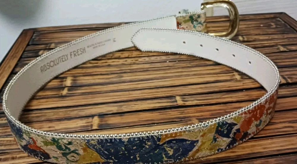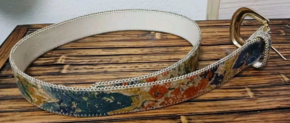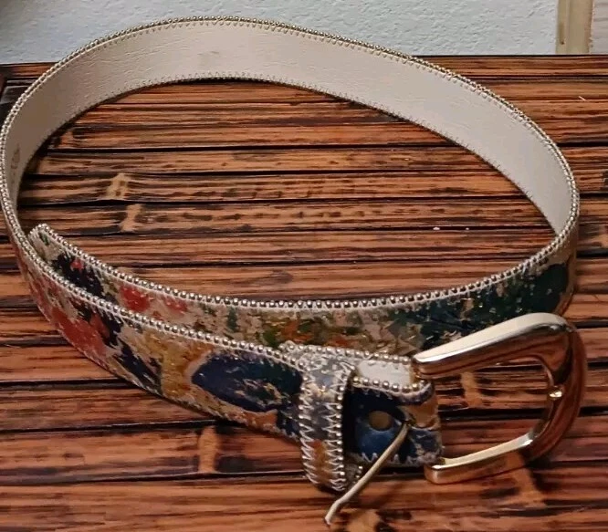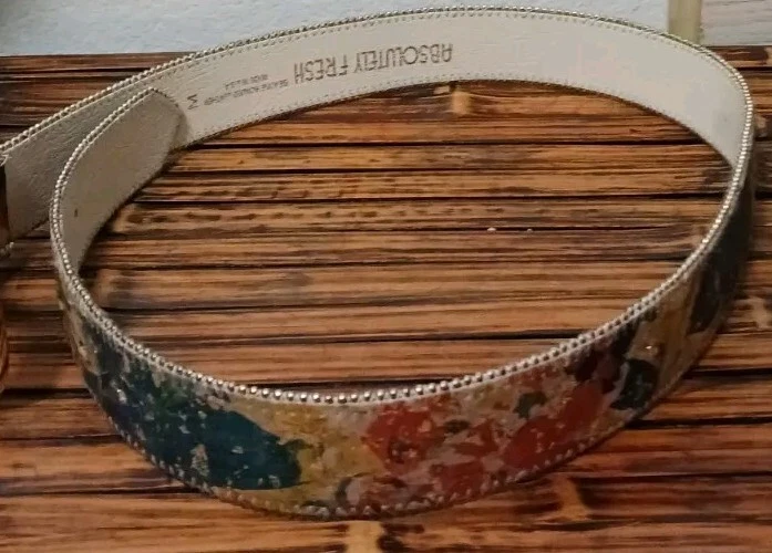 Add a touch of nature-inspired beauty to your wardrobe with the Absolutely Fresh Floral Spackle Painted Beaded Edge Women's Leather Belt. This medium-sized, fashion belt boasts a stunning multicolor floral pattern that brings a fresh and artistic vibe to any outfit. The belt is crafted from high-quality leather and features an array of chic accents, including studded and beaded details, along with a sophisticated gold-plated buckle. Designed for women who appreciate a blend of elegance and edginess, this belt is perfect for both casual and formal occasions. The normal belt width ensures a comfortable fit, while the belt's durable construction and timeless style make it a versatile addition to your accessory collection. Whether paired with a dress or tailored trousers, this belt is sure to enhance your look with its unique pattern and chic accents.
