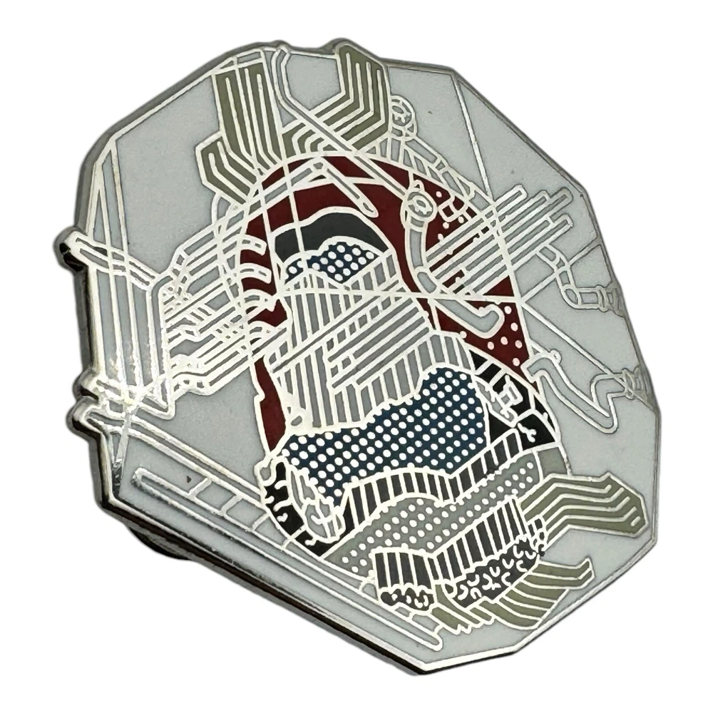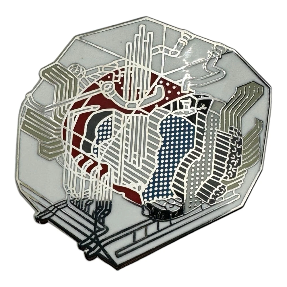 This unique 1.25-inch collectible pin features intricate line art with accents of red, blue, and white, creating a captivating abstract design. Perfect for art lovers and pin collectors alike, this piece is an excellent addition to any collection. • Size: 1.25 inches • Detailed abstract line art with striking colors • Sturdy clasp backing for secure wear • Collectible and unique design