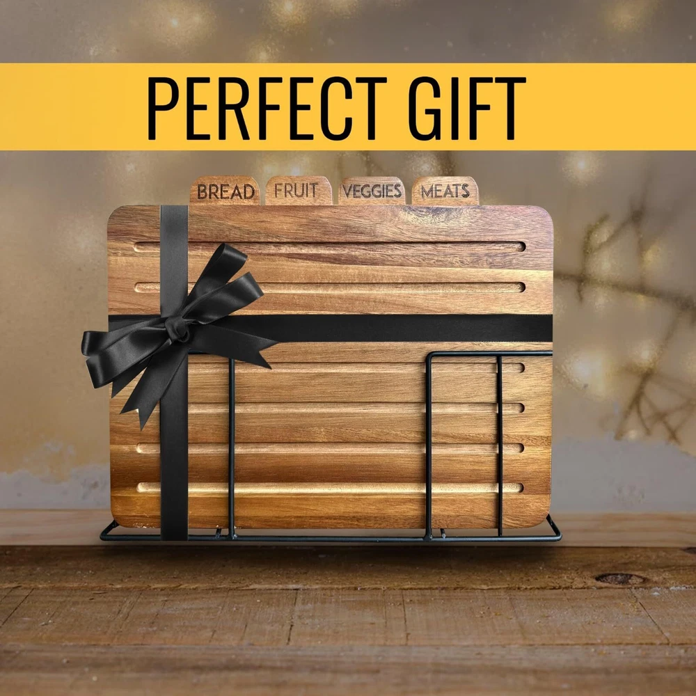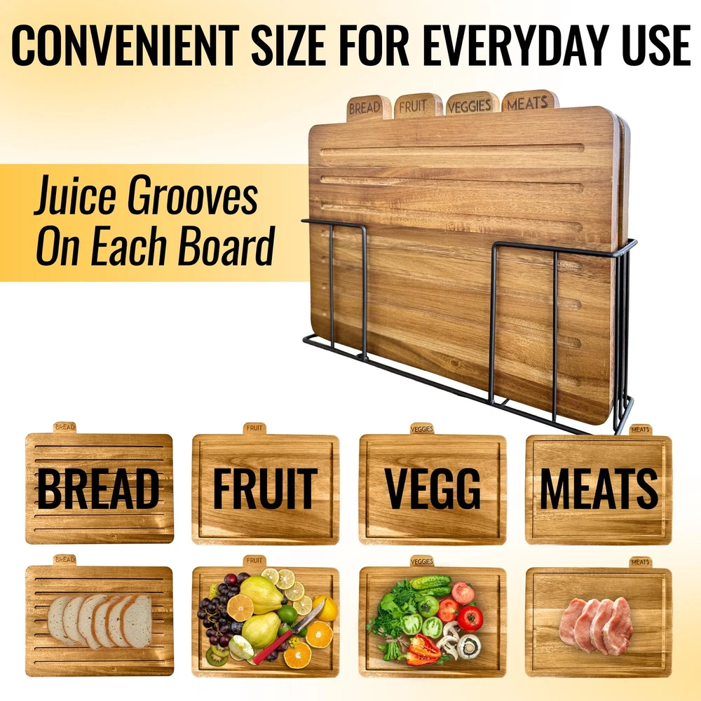 Description Introducing the Acacia Cutting Board Set of 4, the epitome of luxurious functionality for your kitchen. Crafted from durable acacia wood, this set not only provides a sturdy surface for all your cutting needs but also adds a touch of elegance to your kitchen decor. Each wooden chopping block in the set is generously sized, making them perfect for tackling big cutting tasks. Whether you're chopping vegetables for a salad or slicing meat for dinner, these boards offer ample space for all your culinary preparations. Delight your loved ones by gifting them with our premium must have chopping boards!!! Best as a present for a wedding registry, bridal shower, Christmas, Mother's Day, Father's Day, House warming gift, Birthday, Anniversary, or other special occassion! The standout feature of this set is the labeled tabs on each board. With distinct labels for fruit, meat, vegetables, and bread, you can ensure a clean cutting surface for each category of food. This smart feature ensures that your food preparation is not only efficient but also safe and hygienic. The set also comes with a stylish stand for storing and organizing the boards, making them a practical and attractive addition to your kitchen. With the Acacia Cutting Board Set of 4, you get a blend of style, convenience, and safety all in one package. It's a kitchen necessity! SAFE CHOPPING - Our non toxic acacia wood cutting boards come with smart organizer tabs labeled to separate your meat, bread, vegetable, and fish mats from each other; ensuring that your food stays 100% healthy. ORGANIZED STORAGE - Worried about cupboard clutter? With a stand built to store and organize these thin cutting boards on the counter, you'll never have to worry about searching through disorganized drawers and containers to find them. ECO-FRIENDLY - Have peace of mind when you chop with our new non plastic cutting boards made of real sustainable organic wood materials. These materials are biodegradable unlike plastic and don't hurt the environment. PREVENT MESSES - These dark cutting blocks come with a juice groove to keep all extra messes from spilling onto your countertop. Furthermore, the bread board has multiple grooves to collect large and small crumbs and keep your kitchen clean. EASY CLEANING - Because of their non absorbent surface and slick finish, this pack of cutting sheets is extremely easy to clean. Simply rinse with soap and water to clean the boards. These are not dishwasher safe and are best hand washed over sink. KEEP YOUR KNIVES SHARPER - These real wood grain cutting boards add an extra layer of cover between your knives and countertop, protecting your table and keeping your utensils sharp. MULTI-PURPOSE - Because of its simple, versatile design, each mat has multiple uses. It can be used as a butcher block for meat, a serving plate for fruit, a sheet for kneading dough, a charcuterie boards for cheese and crackers, a decorative center piece, and much more! BEAUTIFUL KITCHEN ACCESSORY - Compliment your kitchen with this aesthetic non-plastic wooden cutting board kit. Unlike a plastic cutting board, these wood ones have a natural look that accentuates any modern or rustic kitchen decor. GIVE THE PERFECT GIFT - With their unique organization features, storage rack, and solid design, this acacia cutting board set is sure to please any mom, dad, friend, home cook, chef, or culinary artist. TAKE EVERYWHERE - The board's flat, lightweight design makes them easy to handle, whether you're using them at a restaurant, party, camping, fishing, or cooking from home. Their solid, rigid structure makes them resistant to damages during travel.