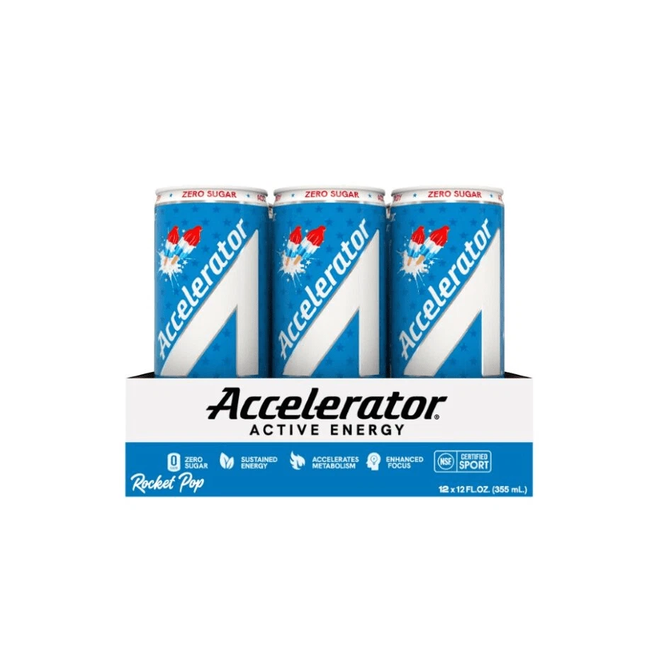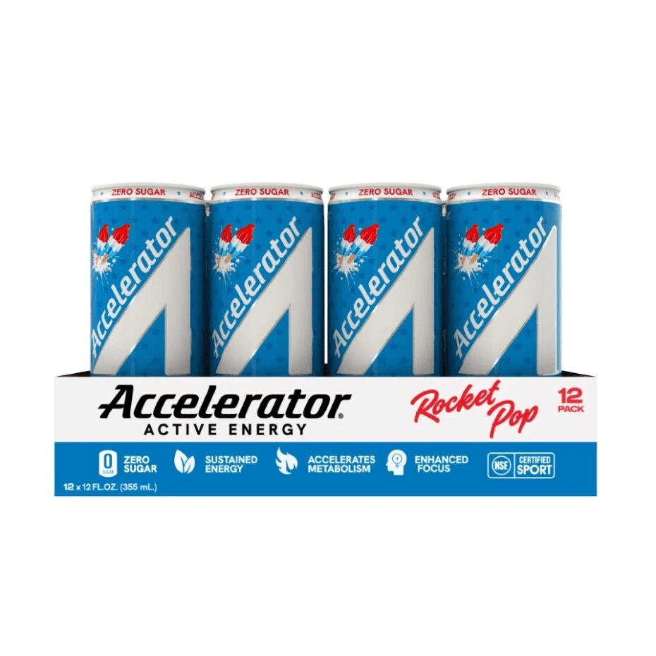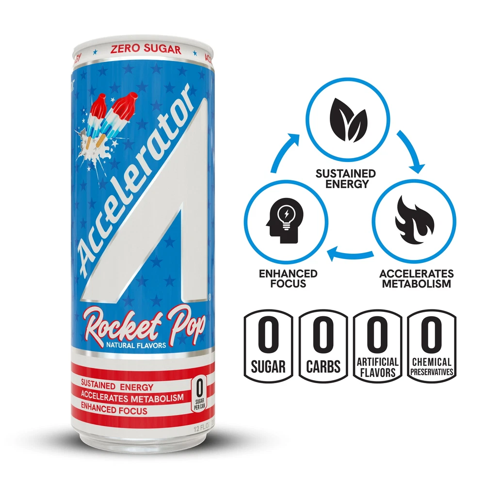 Product details With zero sugar, Accelerator provides sustained energy and enhances focus so you can accelerate your day. With our proprietary blend of natural caffeine, plant-based thermogenics and antioxidants to rev up your metabolism! Try our fan favorite flavor, Rocket Pop, that boasts cherry, lime, and blue raspberry fusion reminiscent of the iconic popsicle. Accelerator energy drinks are fueled by natural ingredients with caffeine coming from Green Coffee Bean & Green Tea Extract to accelerate you throughout the day without the crash and are offered in a wide range of refreshing zero sugar and non-artificial flavors to provide sustained energy for your workout or a needed boost to conquer the day! ROCKET POP: Cherry, lime, and blue raspberry fusion reminiscent of the iconic popsicle ZERO SUGAR & GREAT TASTE: Our proprietary sweetener blend provides 8 best-in-class on-trend flavors with no sugar and no artificial flavors, preservatives, or dyes. SUSTAINED ENERGY: Fueled by natural ingredients with caffeine coming from Coffee and Green Tea to accelerate you throughout the day without the crash. ENHANCES FOCUS: Caffeine, Ashwagandha and COQ10 combine to increase alertness, reaction time and mental clarity ACCELERATES METABOLISM: Our proprietary plant-based thermogenic blend is an easy and great solution to give your metabolism a boost and help you burn more calories. Accelerator’s blend of plant based active ingredients trigger metabolic functions to help you achieve your performance goals.