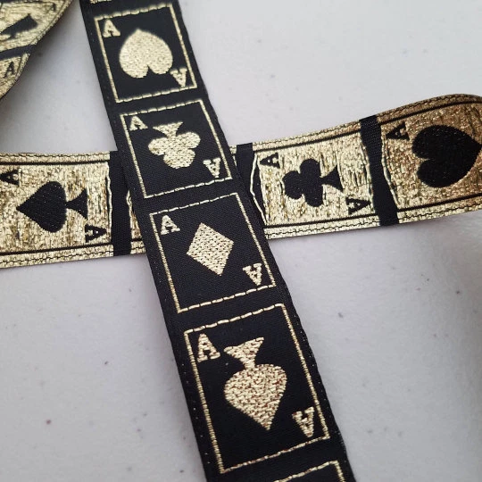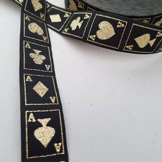 Ace playing card Casino metallic Jacquard Trim 7/8 inch wide Sold by the Yard This is a 7/8 inch wide very metallic lightweight jacquard ribbon like woven trim. SHIPPING COST - Due to my items being very light in weight sometimes Ebay has a hard time calculating the shipping price correctly. I will refund back any overpaid shipping cost. Message me for larger quantities I can create a special orders CONTINUING PIECE OF TRIM - Whenever possible I try to give you a continuing piece of trim. For larger quantities over 5 yards I cannot guarantee continuous yardage. I will message you if I cannot. Sometimes there are splices on the rolls from the manufacturer. I try my best to be accurate in descriptions. Colors do differ on different monitors so please keep that in mind. IF YOU HAVE ANY QUESTIONS, please feel free to contact me. Your satisfaction is extremely important to me. If you receive your package and you are not happy contact me so that I can resolve any problems to your satisfaction. INTERNATIONAL SHIPPING. Please read, I cannot guarantee international shipping. I am happy to ship your package internationally. I ship First Class International using our United States Postal Service. Packages can ONLY be traced in the United States; once it leaves the country I cannot be responsible for your package and are unable to provide tracking information. I have had no problems as of yet. Let me know if you do encounter any problems I am more than happy to work it out with you. Thank You Janet