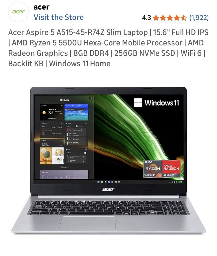 Acer Aspire 5 A515-45-R74Z 15.6" FHD Ryzen 5 8GB 256GB SSD Wi-Fi 6 Win 11 Laptop