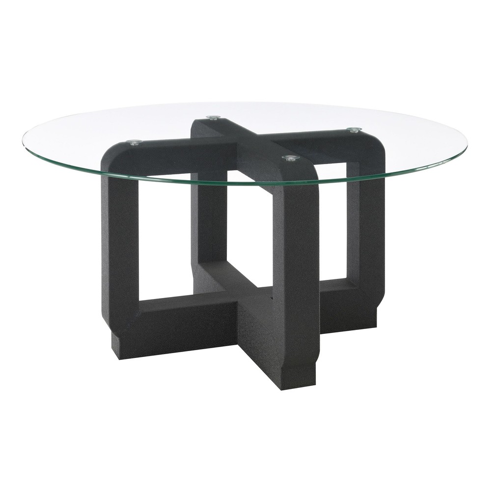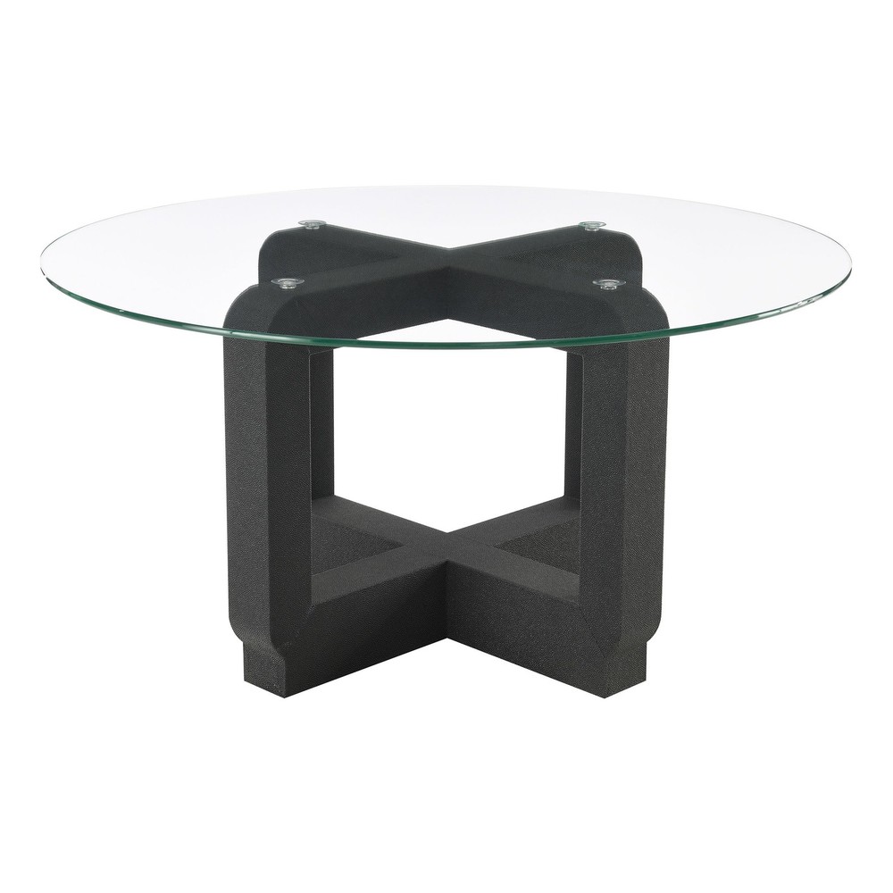 Includes: One (1) coffee table Charming open base brings sculpted flair to a modern coffee table design Features a round glass top that adds light, airy appeal to a decorative base design Base is constructed in MDF and wrapped in black faux leather to create alluring texture and depth Four C-shaped legs create a compelling geometric crossing silhouette for an open base The overall weight limit of this mirrored coffee table is 50 pounds