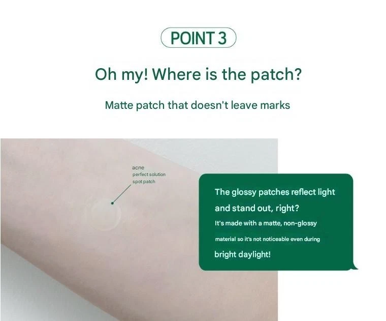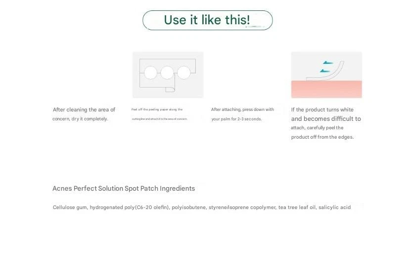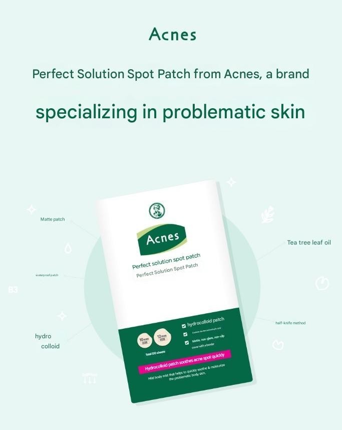 Acnes Perfect Solution Spot Patch A specialized hydrocolloid acne patch designed to soothe, protect, and heal skin problem areas quickly and discreetly. Key Features 🌿 Tea Tree Leaf Oil – Soothes irritated skin and provides gentle care for troubled spots. πŸ’§ High-Adhesion Hydrocolloid – Maintains a moist environment to promote faster healing while protecting against external irritants. πŸ‘» Ultra-Thin & Invisible – Only 0.16mm thick, matte finish makes it barely noticeable, even in bright daylight. 🚿 Waterproof & Long-Lasting – Stays firmly in place throughout the day, even after showering. βœ‚οΈ Half-Knife Sheet Design – Easier and cleaner to peel off without contaminating the patch. 🌟 Flawless Coverage – Blends seamlessly with skin, preventing makeup disruption. How to Use Clean and dry the affected area completely. Peel off the patch from the sheet and apply directly onto the spot. Press gently for 2–3 seconds to secure adhesion. Remove once the patch turns white or after desired usage time. Ingredients Cellulose gum, Hydrogenated poly(C6-20 olefin), Polyisobutene, Styrene/isoprene copolymer, Tea tree leaf oil, Salicylic acid