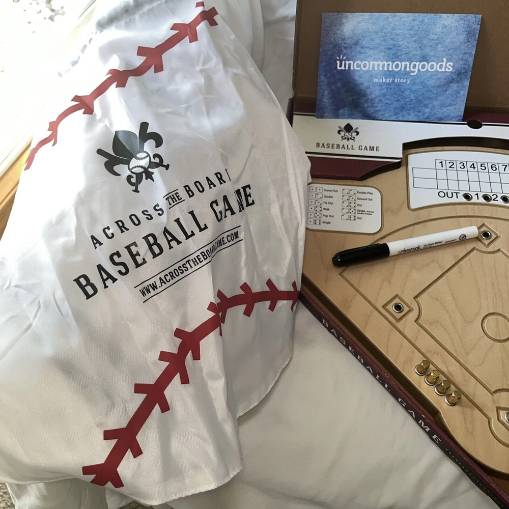 This handcrafted wooden board game sold by Uncommon Goods is a timeless heirloom that will provide hours of entertainment for 2 or more players. The game is themed around baseball and features Across the Board brand components. It was awarded the Best Classic Dr. Toys Winner in 2007 and is suitable for players aged 8 and up. The game board is made in the United States and is perfect for boys, girls, and anyone who loves a good game of strategy and skill. Excellent, preowned condition. Complete game.