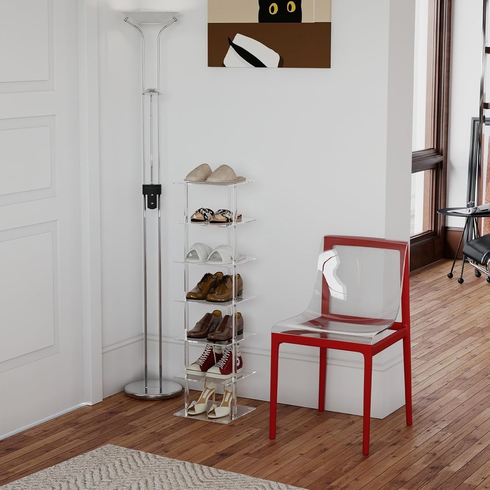 This acrylic shoe rack is a game-changer for small spaces! The sleek, ultra-clear design looks modern while keeping shoes neatly organized. I love how sturdy yet lightweight it is—no wobbling even when fully loaded. The seven tiers fit all my frequently worn shoes perfectly and the vertical design saves so much floor space. It's surprisingly durable for acrylic and wipes clean easily. Perfect for making a cluttered entryway look instantly tidy!