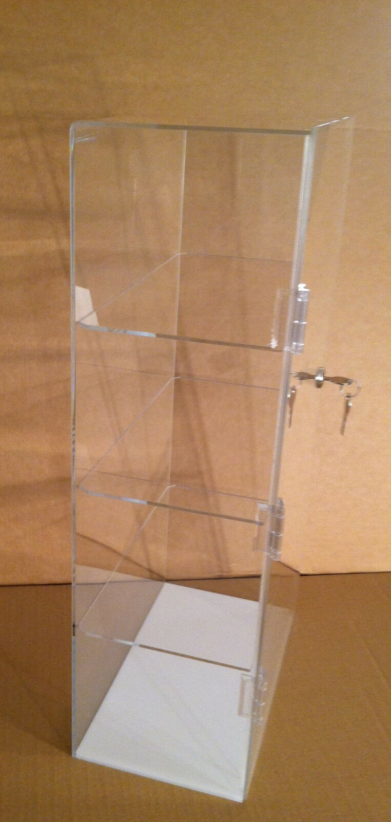 Acrylic Counter Top Display Showcase 12 x 7 x 22.5 Display case....... WITH LOCKING DOOR Great for: Lotions, Makeup, Perfumes, Fragrances, Supplements, Sunglasses, Jewelry 1) 12" wide x 7 " deep x 22.5" tall ......(inside measurements) 2) CUSTOMIZE YOUR DISPLAY......select shelf spacing that works best for you and your product.... if you do not choose.....we will ship you (a) default spacing (a) 5.5", 5.5", 5.5", 5.5" .....as display pictures (b) 8, 7, 7 (c) 6, 6, 5, 5 (d) 11, 11 ...........one shelf in middle (e) add an additional shelf and make it 5,5,4,4,4 (f) 7, 6, 5, 4 (g) YOUR CHOICE JUST LET ME KNOW WHICH SHELF SPACING WHEN PAYING FOR DISPLAY 3..ALL SHELVES GLUED IN PLACE 4) 1/8" Clear acrylic body with 1/4" white acrylic base ( no other display on ebay can compare......the 1/4 thicker acrylic base material is what makes our displays sturdy) 5) Ask about adding rails for bottles 6) UPS Ground shipment to Lower 48 States ONLY ( no HI, no PR, no AK) 7) Additional display cases .......multiple shipping discount 8) Display is Hand-Made in Katy, Texas. I have been building Acrylic Displays for 30 years. If you want one of my customized displays......professionally crafted.....you are at the right place !! 9)I am building these custom displays one at a time to order. 10) If you are looking for a mass produced display which uses thinner acrylic body and thinner acrylic base......we are not for you !! 11) 100% Guarantee that your custom display will arrive unbroken. We take great pride in wrapping your fragile display in lots of bubble wrap and kraft paper. Jewelry Display, Necklace Display, Watch display, Bracelet Display, Ring Display, Knife Display, Knives Display, Collectible Display, Collectable Display, Coin Display, Antique Display, Video Game Display, Electronic Cigarette Display, E Cig Display, E Cigarette Display, Cigarette Display, Phonecard Display, Cell phone Display, Smart Phone Display, Verizon Display, ATT Display, T Mobile Display, Cricket Display, ipad Display, iPhone Display, Vitamin Display, Supplement Display, Gun Display, Pawn Shop Display, Perfume Display, Nail Polish Display, Countertop Display, Revolving Display, Revolving Showcase, Lockable Display, Acrylic Showcase, Plastic Display, Clear Display, Tiered Display, Pen Display, Sunglass Display, Lotion Display, Tanning Lotion Display, Doll Display, Electronic Display, Ink Display, Cartridge Display, Hard Drive Display, Body Jewelry Display, CD Display, DVD Display, Jerky Display, Candle Display, Mary Kay Display, Cosmetic Display, Makeup Display, Lipstick Display, Lexan Display, Display Case, Showcase, Plastic Box