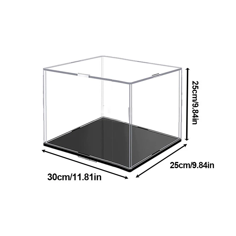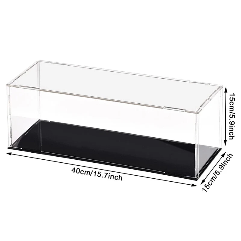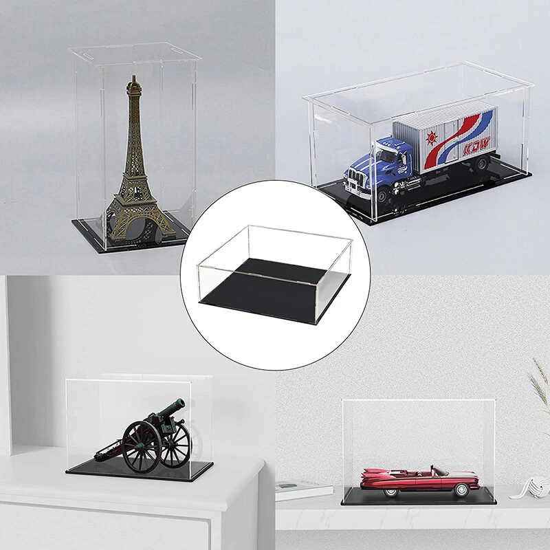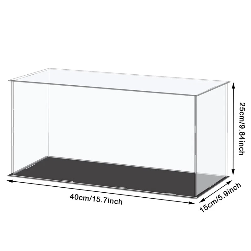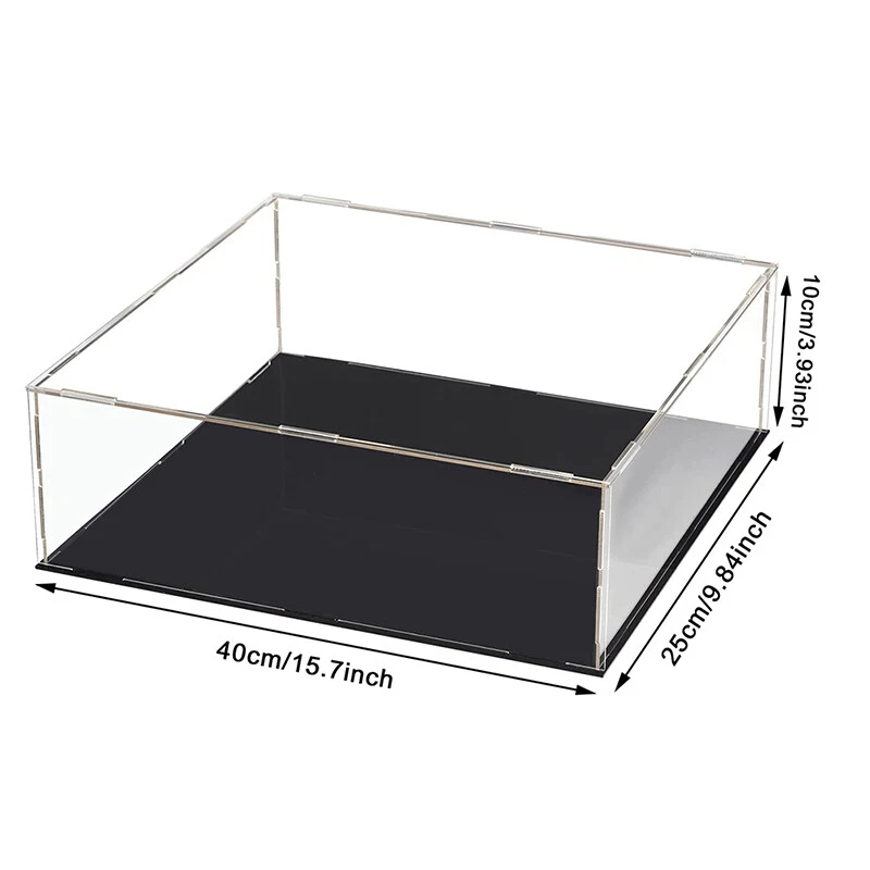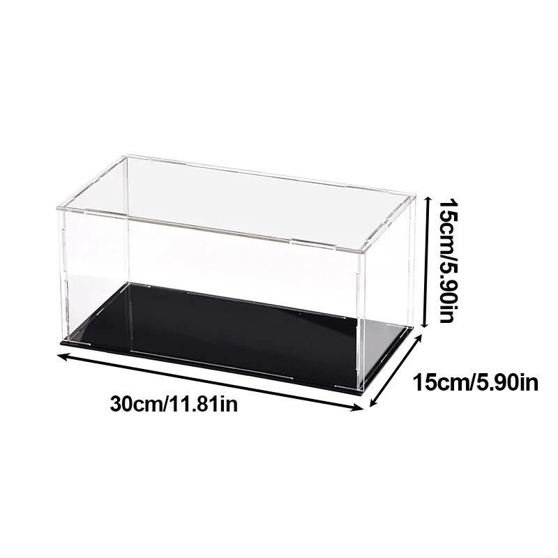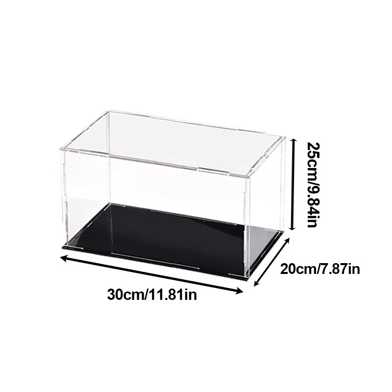 Describe Product Name: Model Display Box Material: Acrylic Color: Black Base, Transparent Box Shape: Rectangular Horizontal Section Thickness: black base 3mm, transparent plate 2mm Uses: for displaying figurines, jewelry, collectibles, glassware, and more. Features: - The display case is easy to assemble without glue and is wrapped on each side to prevent scratches during shipping. - Dustproof and extremely clear for use on figures, action figures, figure models, car models and more. - It's suitable for giving your collection a stylish look and protecting your keepsakes or dolls from dust and odours. - These display boxes are great for anything you want to display, store your art materials, collectibles, and more. Keep your collection dust-free, reduce sunlight and UV radiation, and delay plastic aging. - Sturdy and easy to clean. It's well-balanced and sturdy enough not to be knocked over easily. - Protect and display your favorite collectibles such as figurines, models and more. - It's suitable for displaying figurines, jewelry, collectibles, glassware, and more. Package includes: 1Pcs Model Display Box Notes: 1. When splicing display boxes, you need to use rubber bands to secure the connecting parts, otherwise the connection will not be firm. 2. Manual measuring, please allow 1 ~ 3mm error,thank you. 3. Due to the difference between different monitors, the picture may not reflect the actual color of the item. We guarantee the style is the same as shown in the picture.