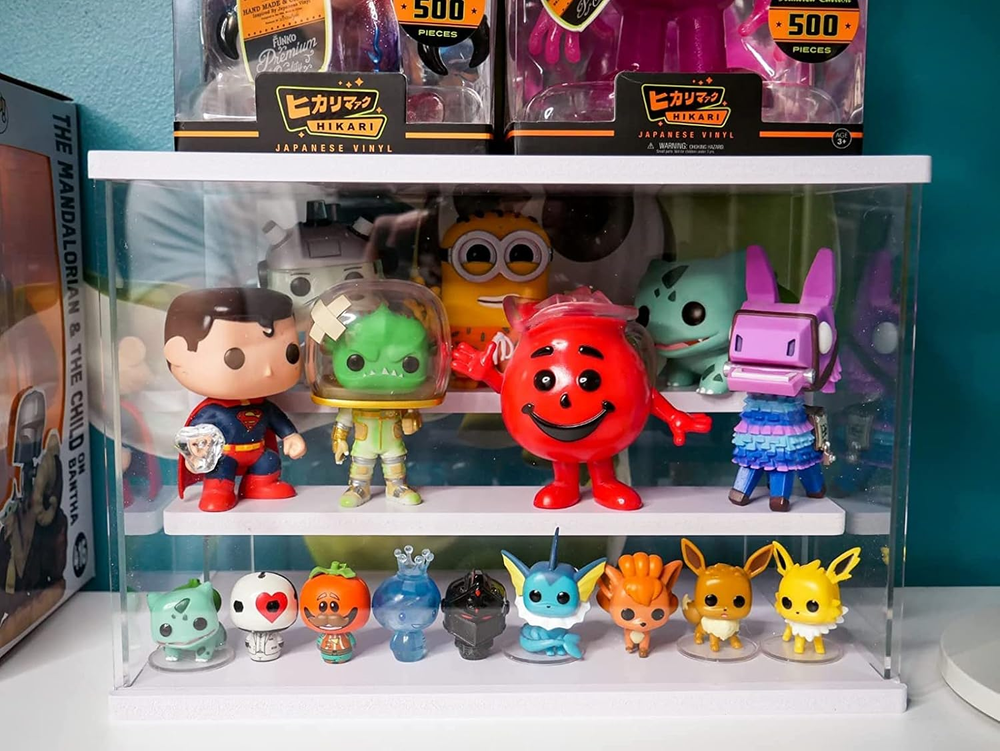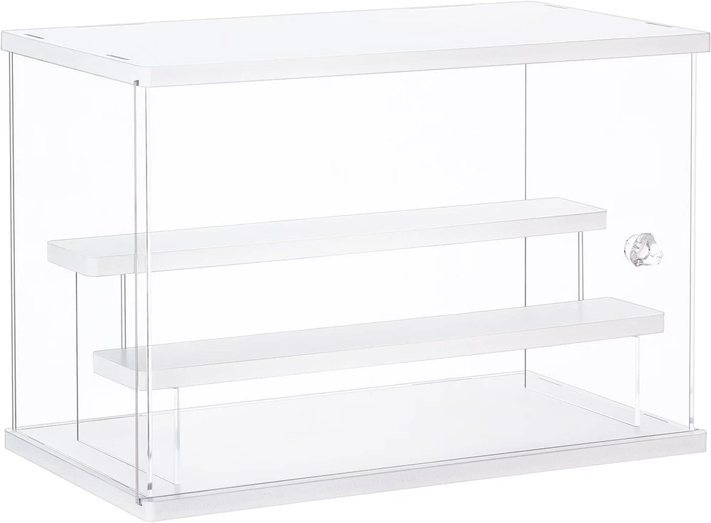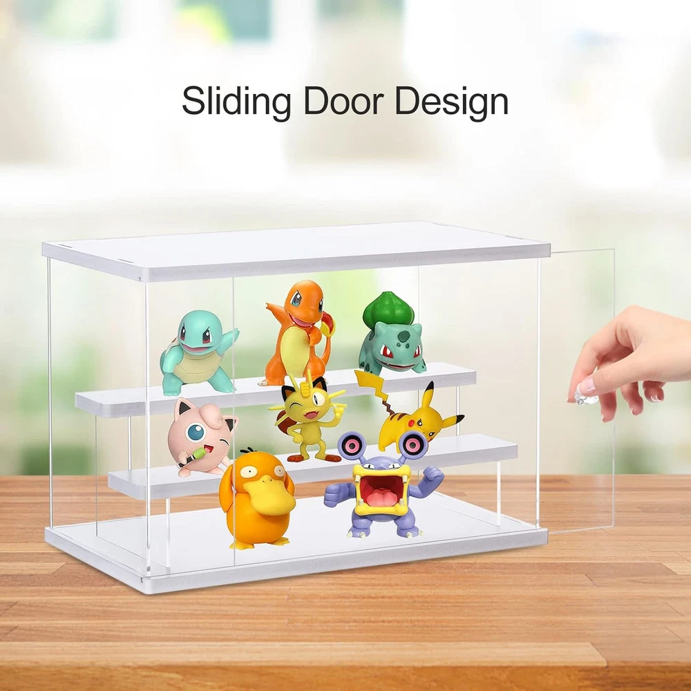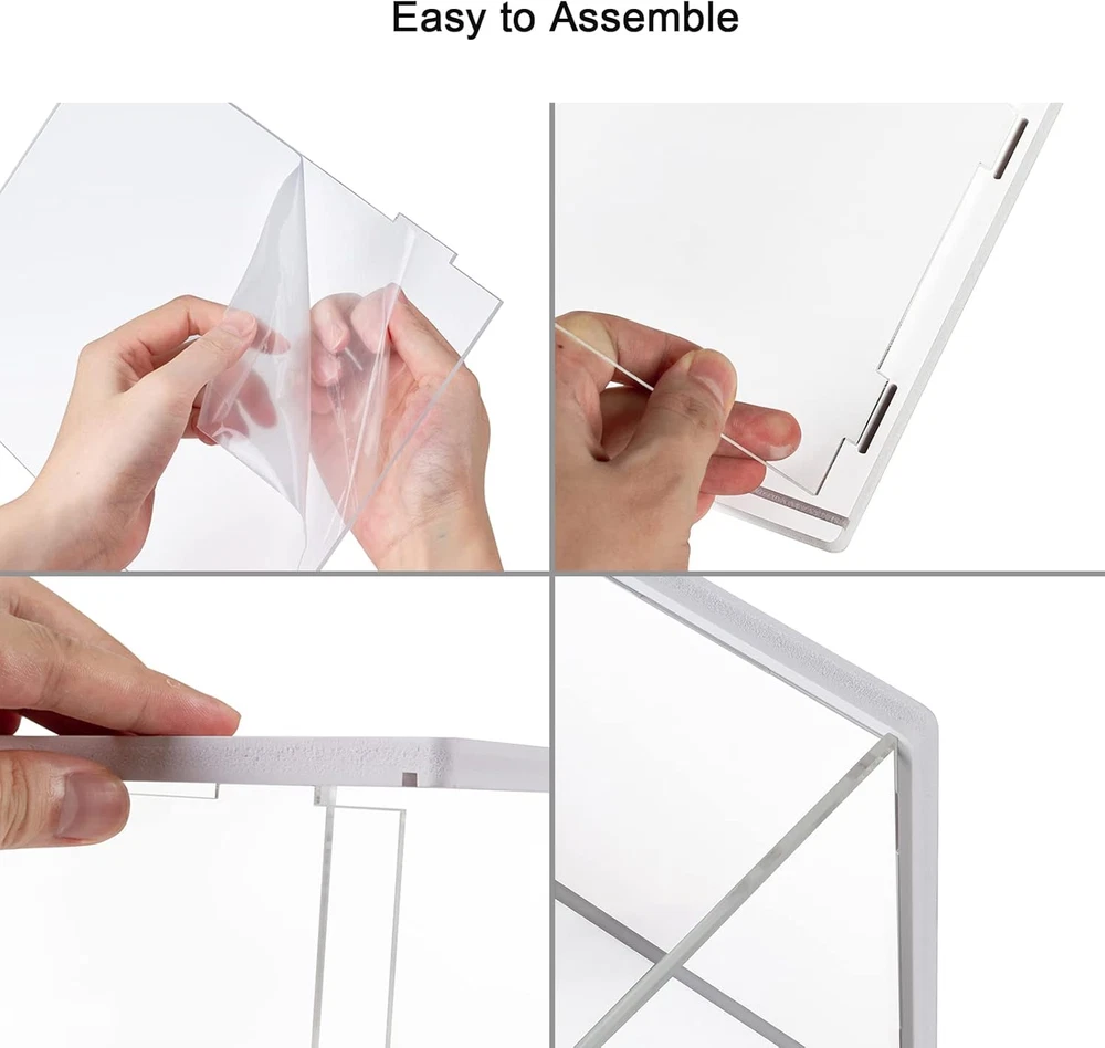 【Material & Dimension】Overall: 12.4 x 8.6 x 7 inches The display case is made of premium acrylic and chevron board. With double layers of protective film on the surface to protect the acrylic board from dust. 【Multi-Use】The display box is perfect for collectibles including personalized jewelry, handmake artist, car models, lego models, figurines, funko pop, action figures collection and display 【High transparency】The clear display case adopt premium and transparent acrylic material. Make the display effect artistic and beautiful. A pair of disposable gloves and clean cloth are provided to prevent dust and fingerprints. 【Removable Double Ladder design】This display case bottom and top side is white, 4-sided transparent design that makes the content visible, Inside equipped with a removable double-layer ladder, can be use it with ladder or without ladder. 【Easy to Assemble】Please remove the protective film before assembly. Just need to connect the sides, bottom and top, only takes few minutes to assemble, no tools needed. Product Description Acrylic Display Case for Collectibles The clear display case is a great showcase for your collections. it will protect your favorite and valuable collectibles form scratches, dust and other damages. Store and display your favorite collectibles such as funko pop, action figures, artifacts, dolls, cars models, airplanes models, small logo models, miniature figurines and so on. The transparent display box and white shelves can display and organize what you want with a modern look and matched well with any kinds of décors. Can be used at home, in retail stores, museums, or trade shows. Sliding Door Design The sliding door design is convenient for you to put in your favorite collectibles or take out and replace new collections. Removable Double Ladder This display case is equipped with a removable double-layer ladder, can be use it with ladder or without ladder. You can put it on the top of the box or inside of it. Package Include: 6x Clear Acrylic Board 4x White Chevron Board 1 Pair of Glove 1x Microfiber Cleaning Cloth 1x User Manual Easy to Assemble Following the provided instructions, you can assemble the display case within few minutes. Notes : The double layer protective films must be torn off from the acrylic surfaces (both sides) before assembly.