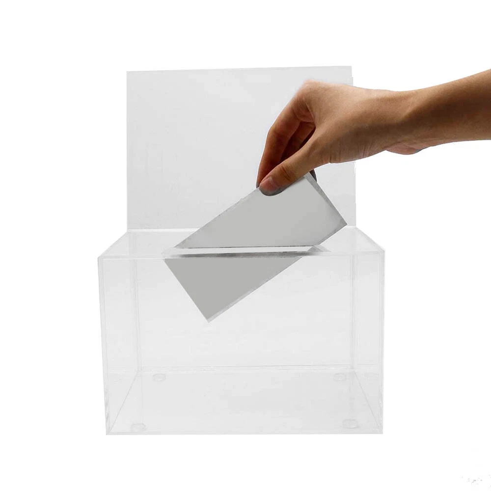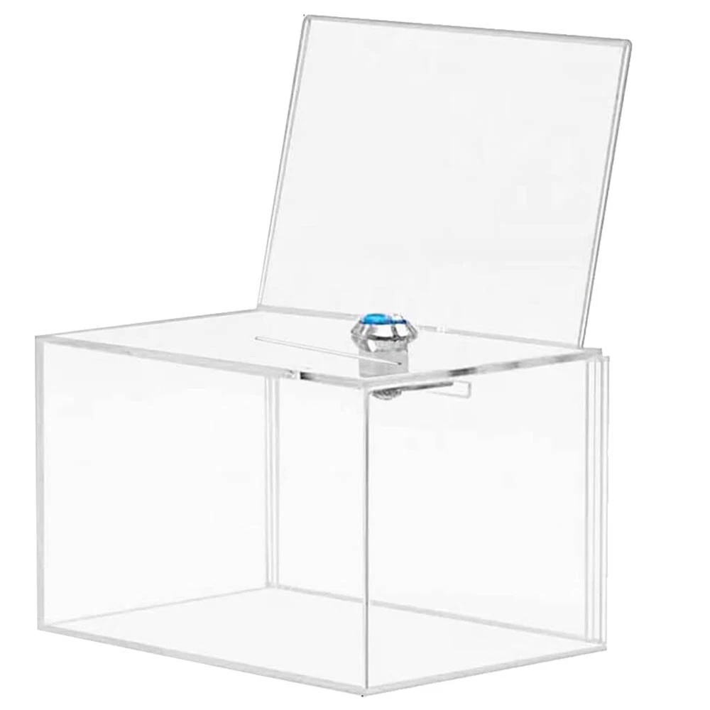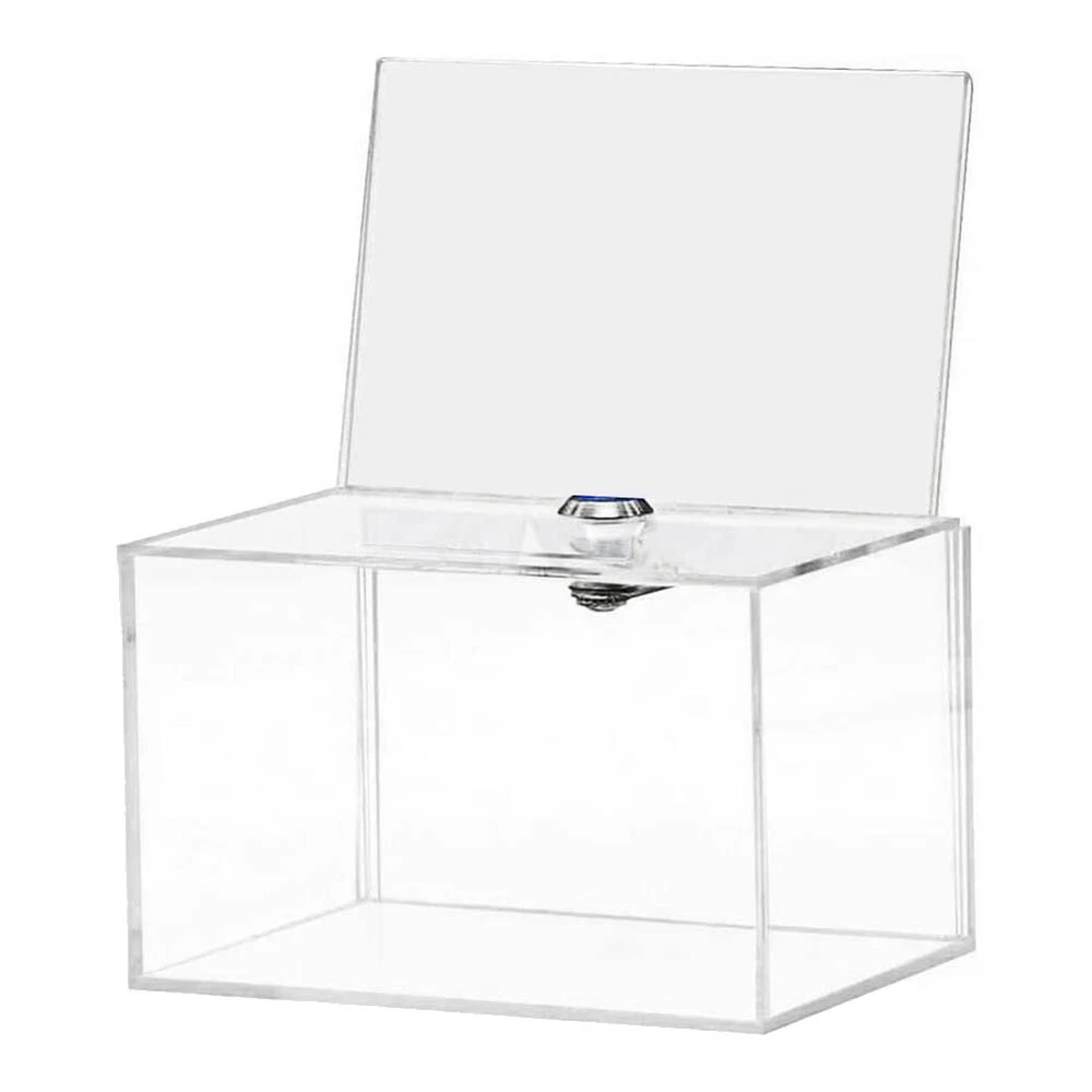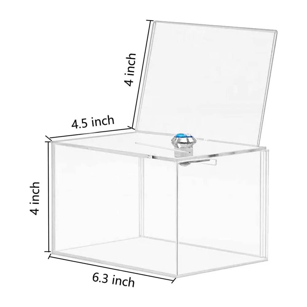 Acrylic Donation Box - Box for Voting, Charity, Polls, Surveys, Sweepstakes8439 Material: Made of clear high quality acrylic Size: The transparent ballot box is 6.3inch x 4.6inch x 3.9inch(L*W*H) Safe Storage: is equipped with a sturdy lock and two keys to keep the contents inside safe and secure. Our clear donation box has 4 brackets on the bottom to fit any desktop tablet. Great Display: Visual Sign Stands easy to switch between graphic or informational sections on a regular basis Colour:transparent Material:acrylic Size:12 x 15.9 x 10.2cm Package Contents: 1 x Donation Box