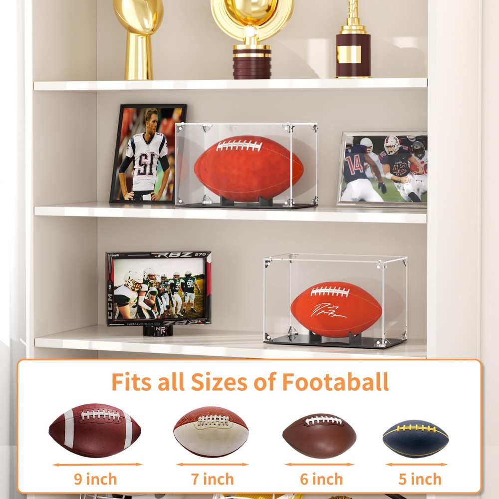 Not:Assembly is required.Instruction is come with the package. It is a good quality acrylic football display cover with a black plastic base. There was a small inserted pedestal in the bottom of the case to “cup” the bottom of the football, to prevent it from rolling around in the case and to keep the football in the correct position for display. Very optically clear with no distortion and the glass is UV protective in case your footballs are displayed near a window. Displays a football and keeps of clean from dust. Keeps the football protected from UVs It is light and easy to use to display a football. This was a perfect fit for my autographed full size football. It will do the trick of keeping the dust and finger prints off the balls when sharing with friends and other fans. It was easly to pull apart and put back together. Nice tight fit. Assembly Required-- You have better watch the video before assembly.It will make you assembly go quickly and easily. Clear To Display -- Made of acrylic,create a clear display visual to viewer.The the signatures on the football could stand out due to the bottom of the case being black.Great display case to show off your collection. Well Protection For Football-- The cube case is sturdy and the football fit built-in cradle perfectly.It keep football safe and sound inside.Also it well protect dust and fingerprint from kids. Fit All Size -- The interior size is 12×7.2×8 inch(L×W×H).football box is big plus to fit for all size of football,including Seniors footballs,basic football,standard football,college football. Nice Gift -- The football case can be nice birthday or festival present to your kids to protect and display their autographed football.