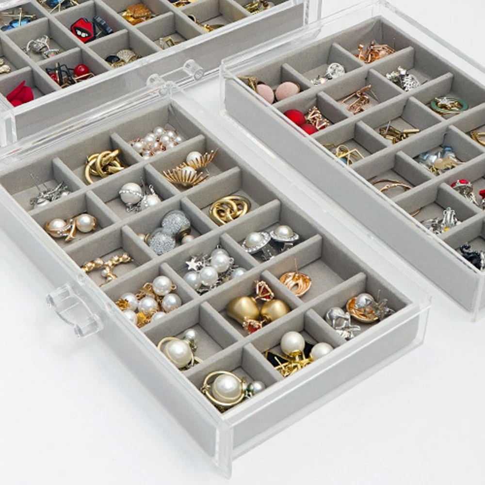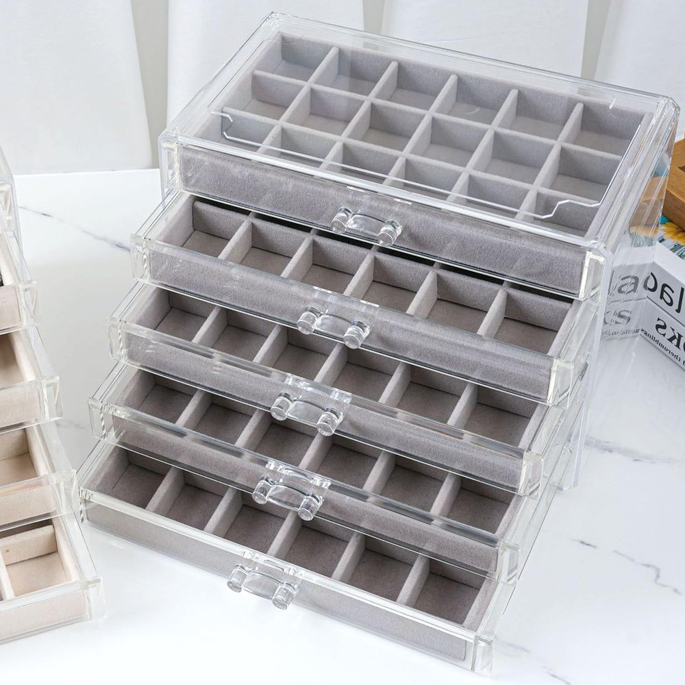 Large Capacity: Jewelry box size 23.5 x 13.6 x 17 cm, 5 drawers of the same design with 90 compartments See Through Design: With the transparent shell, you can easily view and access for matching pair earrings Customize Velvet Tray: You can flexibly adjust the dividers of the tray to store jewelry of various sizes Smooth Track: Smooth slide rail, convenient for pulling and replacing drawer positions Awesome Gift: Gorgeous clear jewelry box organizer is a ideal gift for earring lover or collector