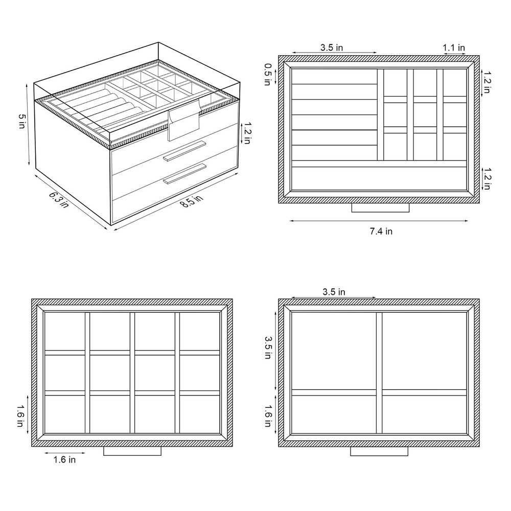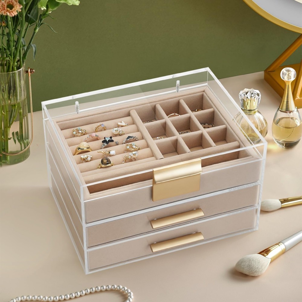 Acrylic Jewelry Box, Three-Layer Jewelry Organizer with 360° Transparent Lid, Suitable for Earrings, Rings, Bracelets, Necklaces, Stud Earrings, Bracelets, Watches (Transparent) - Buy Now with Fast Shipping! Acrylic Jewelry Box, Three-Layer Jewelry Organizer with 360° Transparent Lid, Suitable for Earrings, Rings, Bracelets, Necklaces, Stud Earrings, Bracelets, Watches (Transparent) Product Details Color: Transparent Brand: ESSDIAR Material: Acrylic Style: Acrylic Special Feature: Waterproof, Adjustable, Scratch Resistant Recommended Uses For Product: Necklace, Bracelet, Ring, Watch, Earring, Bangle Product Dimensions: 6.3"D x 8.5"W x 5"H Target Audience: Women Shape: Cuboidal Finish Type: Polished Color: Transparent Brand: ESSDIAR Material: Acrylic Style: Acrylic Special Feature: Waterproof, Adjustable, Scratch Resistant Recommended Uses For Product: Necklace, Bracelet, Ring, Watch, Earring, Bangle Product Dimensions: 6.3"D x 8.5"W x 5"H Target Audience: Women Shape: Cuboidal Finish Type: Polished Inner Material: Flannel Number of Drawers: 2 Number of Compartments: 12 Jewelry Storage Type: Jewelry Box Manufacturer: ESSDIAR Occasion: Valentine's Day Mounting Type: Table Top Item Weight: 3.83 pounds Finish: Polished Special Features: Waterproof, Adjustable, Scratch Resistant Batteries Required?: No Date First Available: July 5, 2024 Key Features ✅ [3-Tier Jewelry Organizer] This clear acrylic jewelry box offers triple-layer storage (flip-top + 2 drawers) to effortlessly organize earrings, bracelets, necklaces, and watches. The ingenious design ensures instant visibility, while the earring organizer slots and dedicated ring holders maximize space efficiency. ✅ [Flexible DIY Storage] Customize every inch with removable dividers! Build compartments for chunky bracelets, delicate chains, or bulky watches. This jewelry organizer for women adapts to growing collections, letting you redesign layouts as trends evolve. ✅ [Cozy & Crystal Clear] Anti-yellowing acrylic maintains pristine clarity, combined with breathable flannel-lined interiors that gently cradle your everyday jewelry a laid-back organizer blending casual charm with reliable protection. ✅ [Perfect Gift Option]: Delight your loved ones with this elegant jewelry box for birthdays or anniversaries. It's not just a jewelry organizer; it's a luxurious gift that adds a touch of sophistication to any dressing table. ✅ [Versatile Use]: Designed for use in bedrooms, vanities, or bathroom counters, this clear jewelry organizer is perfect for storing earrings, rings, bracelets, necklaces, and watches, making it a versatile addition to your accessory collection. Product Description