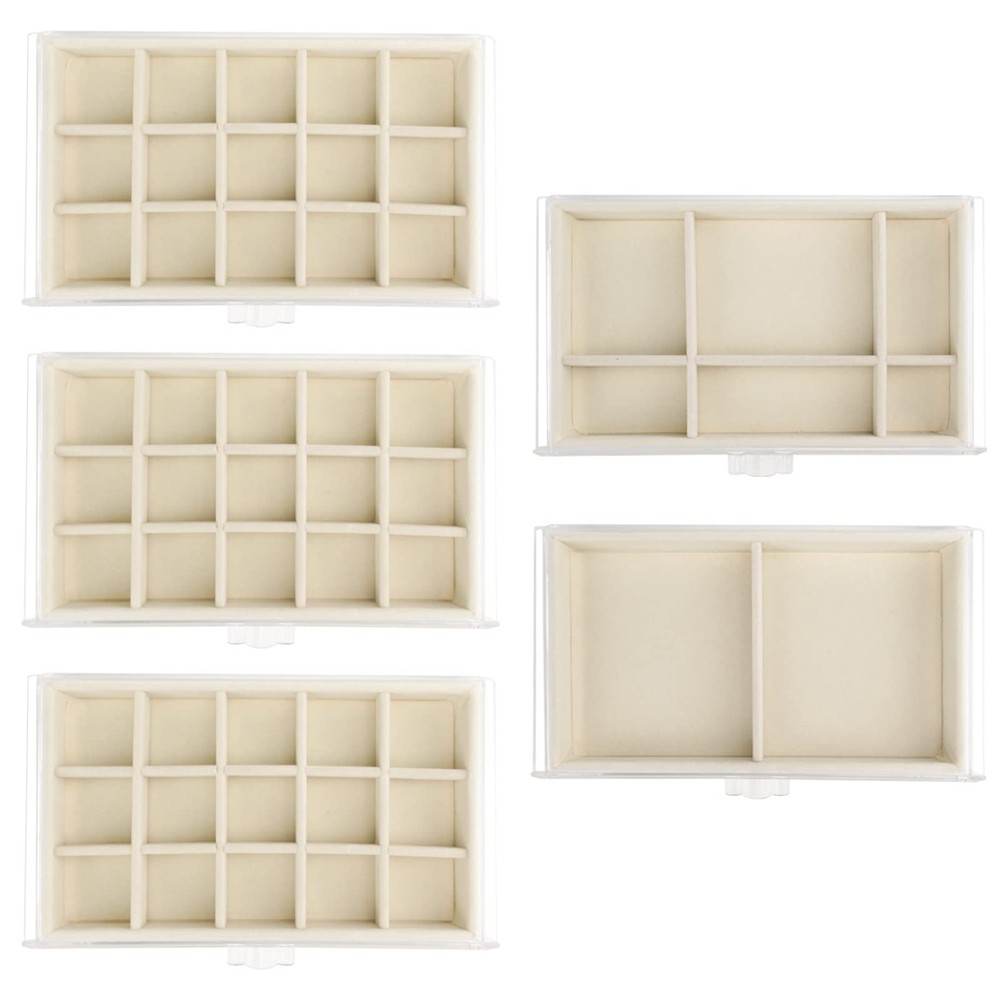 STACKABLE JEWELRY BOX: Acrylic jewelry organizer with 5 removable drawers, it's slide out smoothly and handles are easy to grip, you can rearrange the drawers and trays according to your need CUSTOMIZE VELVET TRAY: The velvet tray can be separated from the drawer and use as drawer inserted. Also, you can flexibly adjust the dividers of the tray to jewelry of various sizes EXTRA LARGE CAPACITY: 5 velvet trays of various sizes for storing different jewelries, this earring storage box has 15 small slots in each of the first 3 drawers, 6 medium compartments in the fourth drawer, and 2 larger compartments in the last drawer ACRYLIC AND VELVET MATERIAL: The clear acrylic outward keeps your favorite jewelry dust-free and makes you see what is inside on the top. And the fully lined interior to make it a stylish look and provide your jewelry better protection AWESOME GIFT FOR WOMEN: Gorgeous clear jewelry box organizer keeps clutter away on the vanity, dresser and makes a beautiful display. If you are troubled about gifts, this jewelry box is the first choice for your lover