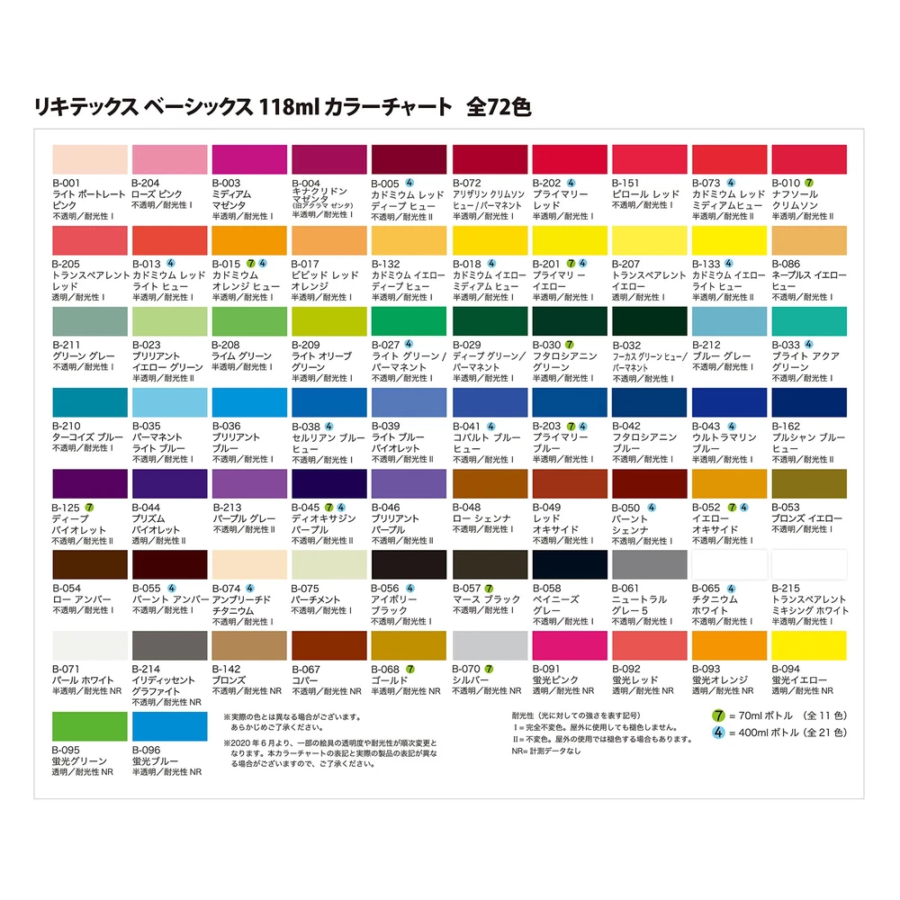 The "Rikitex Basics" has a large capacity and reasonable price. Affordable and economical acrylic paint recommended for beginners. Works with all Likitex Colors and Likitex Medium. A large capacity of 4.6 fl oz (118 ml) and a uniform price for each color. Large capacity, so it is recommended for large projects and live painting. Easy to use one-touch cap type. Prevents lost or forgetting to close the cap Acrylic paints are water-soluble paints that are easy to handle with water. Once dry, it is water resistant and will not dissolve in water and will not bleed through the color of the underneath, giving you a beautiful finish. Acrylic paint dries fast and allows for smooth creation Dries to a flexible coating film that won't crack under thick coats. Dilute with water to create a wide range of expressions such as bleeding and blurring like watercolors, or use it to create a thick and raised look like an oil paint. In addition, it is great for drawing not only paper and canvas, but also for a variety of materials, such as fabric, wood, stone, concrete, etc. Likittex acrylic paints offer a full line of colors to meet a wide range of needs from professionals to light users. Main Materials: Pigment, acrylic resin Features: Water soluble, water resistant, quick drying Primary Country of Manufacture: France Volume: 4.1 fl oz (118 Uses: For large production and introduction to