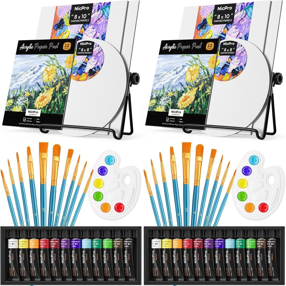 Acrylic Paint Canvas Set for Adults & Kids, 80PCS Art Painting Supplies Kit with 2*12 Colors Paint, 6 Canvas, 2 Table Easel, 2*10 Brushes, 2 Paper Pad, 2 Palette for Artist Beginner Students Complete Painting Supplies Kits: Each acrylic paint set includes everything you need to get painting, times two! 2 sets of 12 colors acrylic paint, 2 sets of 10 paint brushes, 6 painting canvas(4pcs 8"x10" canvas and 2pcs 8"x8" round canvas), 2 table easel, 2 plastic palette, 2 * 12 sheet A5 acrylic painting paper, 2 color wheel Acrylic Paint & Painting Brushes: 12 vibrant colors artist grade acrylic paint with buttery consistency for easy mixing and coloring (12 ml / 0.4 fl.oz). 10 different sizes paint brushes provide different functions, cover all your painting needs Painting Canva & Paper Pad: There are 6pcs blank paint canvas with 100% cotton canvas, 4pcs square and 2pcs round shape for different styles painting. 12 sheets of acrylic paper with thick texture for better painting results(140lbs / 300gsm) Multi-functional Table Easel: In this art painting kit, the steel wire table easel is lightweight and foldable, easy to carry. It can be used for table top painting, also display stand for painting, ipad or crafts Perfect Gift Choice: This canvas and paint set is designed for two individuals to create side by side, sharing the joy of painting with a friend or loved one! With beautiful packaging outside, the canvas painting kit is a great gift for artists, kids, students and painters of all levels