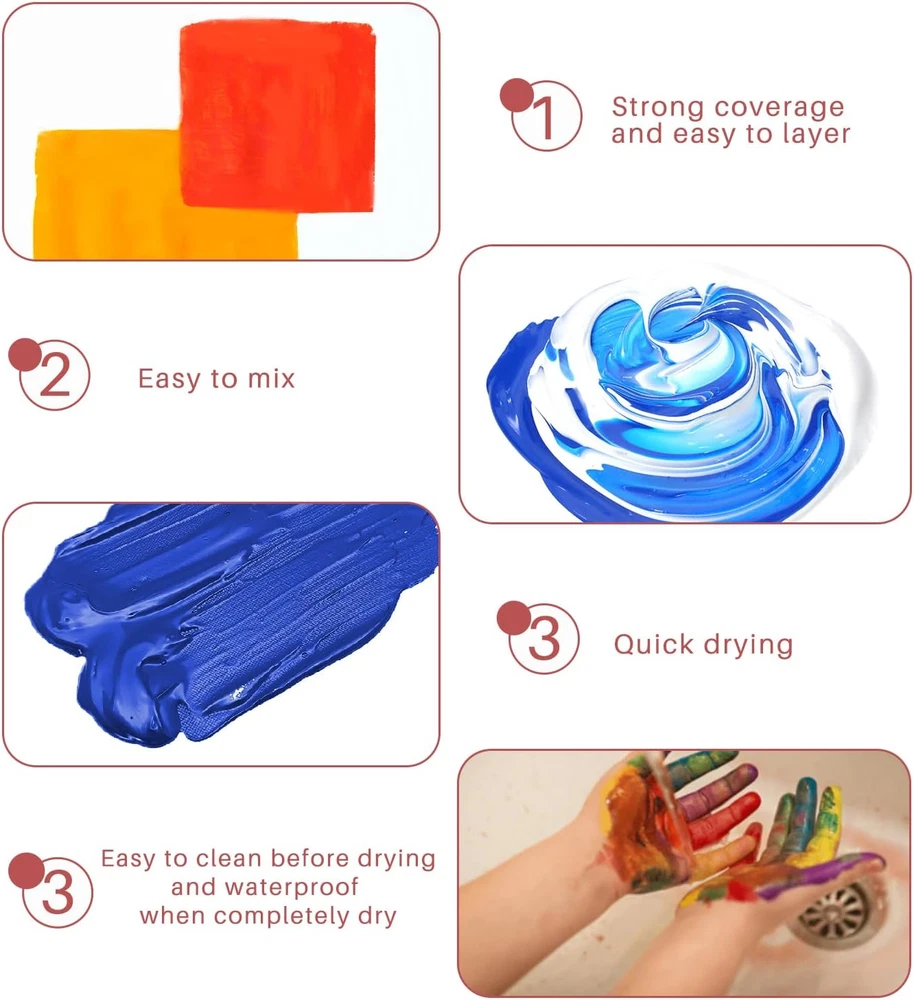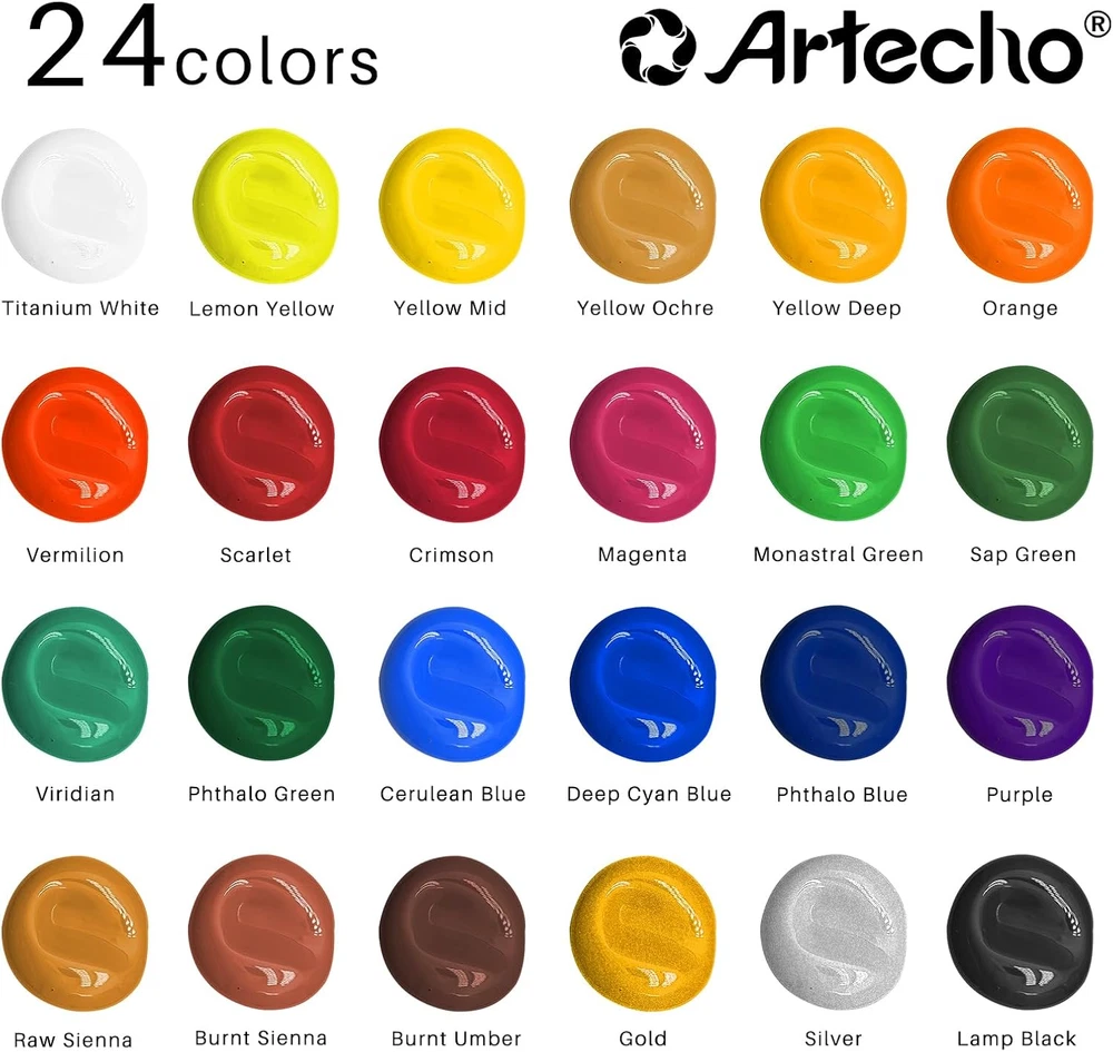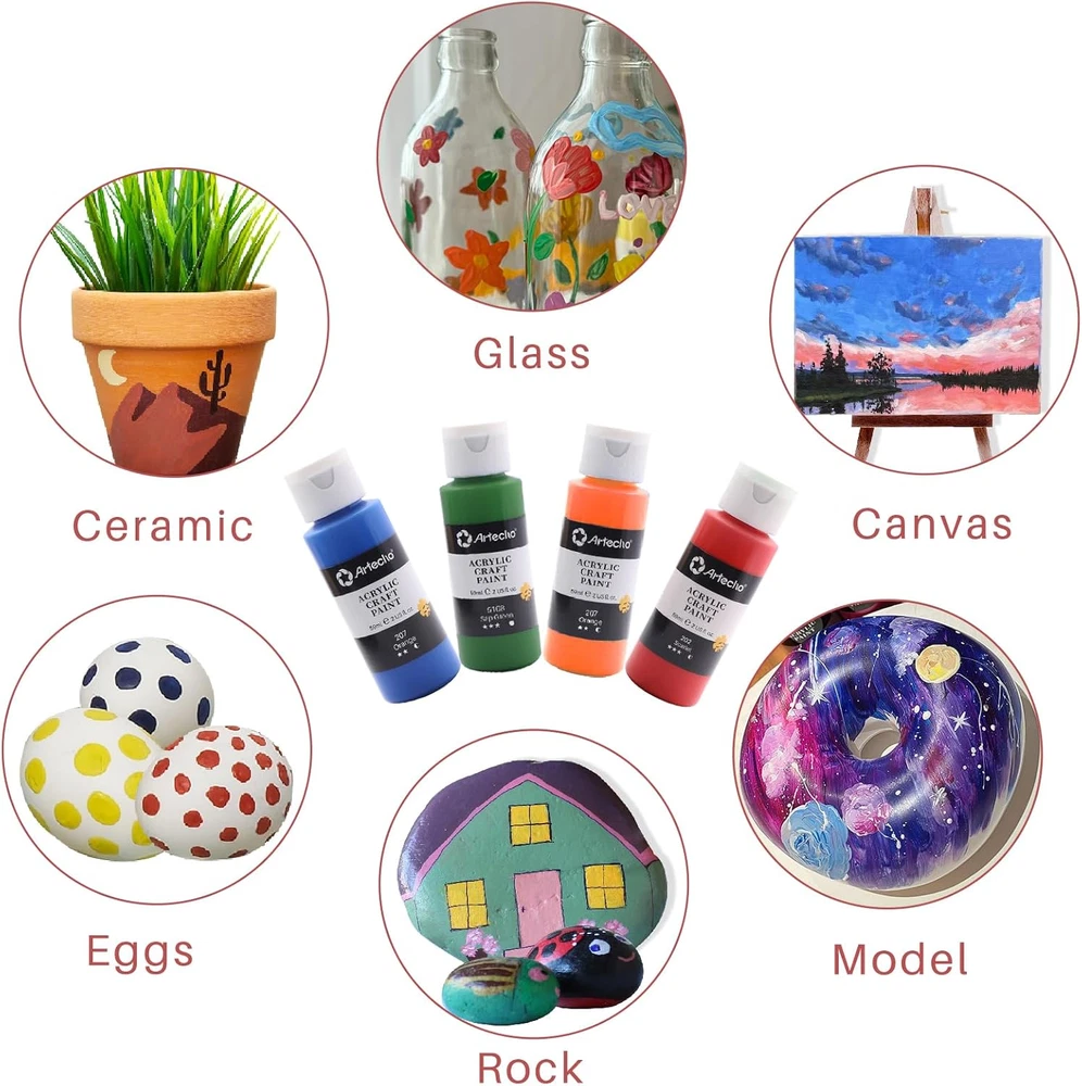Store New Arrivals Add to Favorite View Feedback Contact Fast deliveries to the customer's home Quality customer service John Make the customers happy! Acrylic Paint Set 24 Colors 2Oz/59Ml with 12 Brushes, Art Craft Paints Kit, Paint for Canvas, Rocks, Wood, Fabric, Ceramic and Art Supplies, Non Toxic Paint for Artists and Beginners Description Premium Art Supplies: 24 colors acrylic paint in 60ml/2oz bottles, providing the most commonly used colors: Titanium White, Lemon Yellow, Yellow Mid, Yellow Ochre, Yellow Deep, Orange, Vermilion, Scarlet, Crimson, Magenta, Monastral Green, Sap Green, Viridian, Phthalo Green, Cerulean Blue, Deep Cyan Blue, Phthalo Blue, Purple, Raw Sienna, Burnt Sienna, Burnt Umber, Gold, Silver, Lamp Black. Easy to Mix & Strong Coverage: You can easily mix multiple colors to get new color, perfect for Painting Crafting and DIY. Strong Coverage and Easy to Layer: Helps to control pigments better, ensure that your artwork stands out. Quick Drying & Easy to Clean before Drying: It takes about 3-12 hours to dry completely. Once dried, acrylic paints become water-resistant and durable. Water-bases, Non-Toxic and Acide Free paint can be easily cleaned with soap and water before completely dry. Widely Used: Suitable for Canvas Paint, Rock Painting, Craft Paint, Ceramic Paint, Wood Paint, Clay Paint, Glass Paint, Leather Paint, Fabric Paint and Wood Paint. Acrylic paint set for adults, students, artists and beginners. Perfect Gift for Art Lovers: Artecho acrylic paints make a great gift for both beginners and professionals. They are perfect for hobby paint, Christmas decorations, indoor and outdoor decorations, and make an ideal gift for birthdays, Christmas, Thanksgiving, and more. Product Description Easy to Mix You can easily mix multiple colors to get new color, perfect for Painting Crafting and DIY. Quick Drying It takes about 3-12 hours to dry completely. Once dried, acrylic paints become water-resistant and durable. Strong Coverage, Easy to Layer Helps to control pigments better, ensure that your artwork stands out. Easy to Clean Before Drying Water-bases paint can be easily cleaned with soap and water before completely dry. Artecho Art Supplies Add to Cart Add to Cart Add to Cart Add to Cart Add to Cart Customer Reviews 4.6 out of 5 stars 52 4.7 out of 5 stars 5,172 4.8 out of 5 stars 239 4.7 out of 5 stars 5,172 4.0 out of 5 stars 2,023 Price $29.99 $ 29 . 99 $6.99 $ 6 . 99 $12.99 $ 12 . 99 $21.99 $ 21 . 99 $9.99 $ 9 . 99 Volume 2oz(59ml) 120ml(4oz) 500ml(17oz) 2oz(59ml) 20ml(0.7oz) Colors 24/48 Multicolor Multicolor 12 8 Type Basic, Metallic Basic, Metallic, Glow&Neon Basic, Metallic Metallic Glow&Neon Non-toxic ✔ ✔ ✔ ✔ ✔ Acid-free ✔ ✔ ✔ ✔ ✔ Style 24Colors with Brush Coverage Strong Dry Time In Hours 12 Unit Count 48.0 Fl Oz Batteries Required? No Item Volume 48 Fluid Ounces Age Range (Description) Adult Package Information Bottle Item Form Gel Specific Uses For Product Interior/Exterior Paint Type Acrylic Included Components Brush Indoor/Outdoor Usage Outdoor, Indoor Water Resistance Level Water Resistant Item Weight 4.82 pounds Surface Recommendation Fabric, Canvas, Rock, Craft, Ceramic, Wood, Clay, Glass, Leather, Plastic Special Features Non Toxic, Low Odor, Quick Drying Special Feature Non Toxic, Low Odor, Quick Drying Full Cure Time 12 Hours Color 24 Colors 2oz with 12 Brushes Package Dimensions 8.27 x 5.71 x 4.25 inches Is Waterproof True Model Name Acrylic Paint Set 24 Colors Size 48 Fl Oz (Pack of 1) ABOUT US We offer the best prices around on high quality products. Our E-store includes media such as books, movies, music and games while offering electronics, toys, sporting apparel, clothing, tools, general home, garden items and more. SHIPPING We are always working hard to ensure your package arrives as soon as possible. Please understand that some factors like weather, high postal traffic, and the performance of shipping companies are outside of our control. We offer free shipping to the lower 48 states and ship within 2 business days of payment, usually sooner. We do not accept P.O. Boxes. Please provide a physical address. For shipping outside of the continental USA, we only use eBay's Global Shipping Program. The item is shipped to KY and then sent to the rest of the world. International customers are responsible for all duties and taxes. Continue to 'check out' to calculate costs for shipping the item to your country. Messages regarding eBay's Global Shipping Program MUST be directed at eBay EXCLUSIVELY. RETURNS We offer a 30-Day Return Policy on items in which you are not completely satisfied with. You have the option of a full-refund or an exchange of the item. No returns are available on items shipped outside of the USA PAYMENT We accept PayPal. CONTACT US This page content is yet to come Please ad us to your favorite seller and visit again later Thank You CUSTOMER SATISFACTION We try our very best to make sure every customer is completely satisfied. If there's a problem, message us! We're happy to help. WE ACCEPT