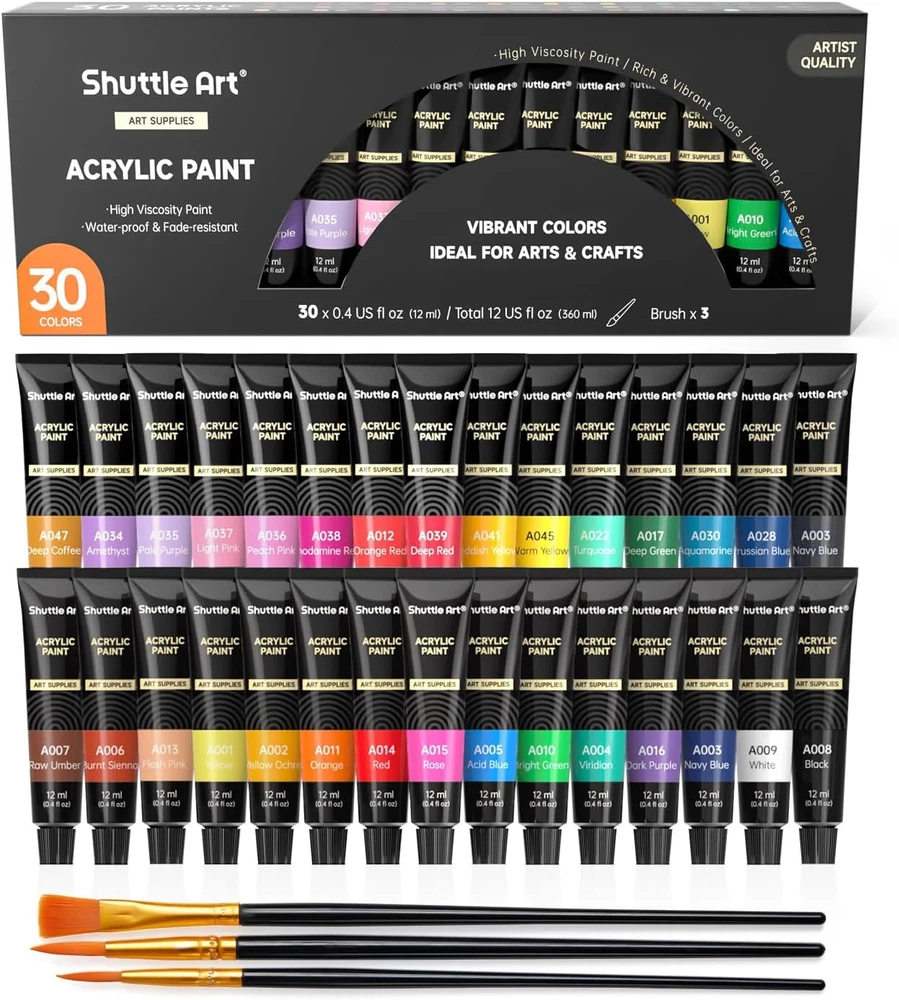 Free Shipping! VIBRANT ACRYLIC PAINTS : Shuttle Art 30 Acrylic Paint Set consists of 30 vibrant assorted colors and with BONUS 3 FREE PAINT BRUSHES. Each tube is filled with 12 ml (0.4 oz) paints with rich pigments that are professional artist quality VERSATILE PAINTS : Paint lay down is creamy and vivid. Great for teens, beginners or artists for wide range of surfaces, such as canvas, ceramic, wood, fabric, clay, walls, nails, crafts and more. Children use acrylic paints in art class and leisure time to develop imagination skills and adults paint to relax and boost creativity, great for creating decorative art for your home DURABLE PAINTS : Acrylics dry very quickly. Paint stays on surface extremely well and is durable and long lasting. It’s permanent, waterproof and fade-proof HIGH QUALITY THICK PIGMENTS : When acrylic pigments are thin, artwork will appear watery and difficult to achieve vibrancy. We have developed a thick and rich pigment that provides superior coverage and maintain smoothness while painting. Conforms to ASTM-D4236, non-toxic and acid-free SERVICE GUARANTEE : Your satisfaction is our top priority, please rest assured to purchase our products. If you are not satisfied with our products or have any questions, please feel free to contact us at any time Product Description 1 PAINT 2 MARKERS 3 PENS 4 PENCILS 5 SCHOOL&OFFICE Artist Quality Acrylic Paint Convenience Tubes Each tube is filled with 12 ml of acrylic paint, making it easy to carry around for storage and giving good control over the amount of paint used during application. Artist Quality Paint These rich, vibrant pigments feature smooth, highly pigmented colors that blend easily to produce true, consistent shades. Ideal for Painting & Crafting Suitable for Kids and Beginners Our acrylic paints are suitable for all ages and skill levels. Whether painting or crafting, these tubes are the perfect introduction to the world of painting. Multipurpose Paint Our acrylic paints are suitable for most surfaces, including canvas, wood, rocks, fabric, ceramic, pumpkin painting, clay, craft and more. Acrylic Paint Guide