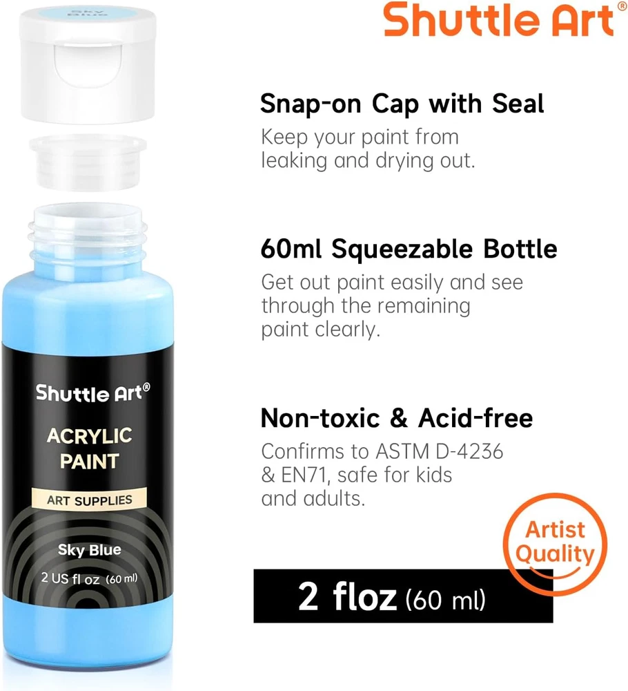 Store New Arrivals Add to Favorite View Feedback Contact Fast deliveries to the customer's home Quality customer service John Make the customers happy! Acrylic Paint Set, 36 Colors Acrylic Paint with Brushes & Palette, 2Oz Bottles, Rich Pigments Non-Toxic Paint for Artists Kids & Adults, Art Supplies for Canvas Rock Ceramic Wood Painting Description 36 VIBRANT COLORS: Shuttle Art 36 colors acrylic paint set contains 36 unique colors highly pigmented paints, including classic metallic gold and silver, also comes with 10 brushes and 1 palette, when you receive this art painting kit you can paint right way! ARTIST QUALITY & STURDY PACKAGE: Creamy acrylic paints are easy to blend, mix and layer, providing great coverage and true, consistent shades for detailing, texturing and coloring. Art projects will stay as beautiful as the day they were painted. Strengthened cardboard package protects paints well and works as an organizer, safe and convenient. WIDE APPLICATION & EASY TO CLEAN: Dry fast, water-proof and fade-resistant, acrylic paint is suitable for most surfaces, such as wood, rock, canvas, ceramic, fabric, glass, clay, leather, plastic and more. Water-bases paint can be easily cleaned with soap and water before completely dry, perfect for kids, students, beginner art lovers and professional artists for painting and crafting. NON-TOXIC & ACIDE FREE: This paint set is conformed to ASTM-D4236, non-toxic and acid-free. Safe acrylic paint set for kids, teens and adults to do art projects with the water-based paints. SERVICE GUARANTEE: Your satisfaction is our top priority, please rest assured to purchase our products. If you are not satisfied with our products or have any questions, please feel free to contact us at any time. Product Description 1 PAINT 2 MARKERS 3 PEN 4 PENCILS 5 SCHOOL&OFFICE 2oz BOTTLE SET ARTIST PAINT 2oz Bottles for Daily Use The right amount for all kinds of creations, enough to go around and not to waste! Labled for Color Recognition For quick selection, the name of each color is labeled on the bottle and cap. MULTI-PURPOSE PAINT Ideal for Canvas Painting Rich pigmented acrylic paint has a creamy texture, and are easy to mix and layer. Ideal for Craft Painting Suitable for most surfaces like glass, rocks, nails, walls, canvas, leather, ceramic, wood, clay, crafts and more. Canvas Panel & Stretched Canvas Add to Cart Add to Cart Add to Cart Add to Cart Customer Reviews 4.8 out of 5 stars 2,165 4.8 out of 5 stars 2,165 4.7 out of 5 stars 467 4.7 out of 5 stars 627 4.7 out of 5 stars 342 4.8 out of 5 stars 334 Price $27.99 $ 27 . 99 $21.59 $ 21 . 59 $24.99 $ 24 . 99 $24.99 $ 24 . 99 $29.99 $ 29 . 99 $29.99 $ 29 . 99 100% COTTON ✔ ✔ ✔ ✔ ✔ ✔ Canvas Type Canvas Panels Canvas Panels Stretched Canvas Stretched Canvas Canvas Panels & Stretched Canvas Panels Size 5x5, 6x6, 8x8, 10x10 inch 5x7 inch, 8x10 inch 11x14 inch 5x7 inch, 8x10 inch 5x7, 8x10, 9x12, 11x14 inch 5x7, 8x10, 9x12, 11x14 inch Quantity 52 Pack - 13 of Each 36 Pack - 18 of Each 12 Pack 20 Pack - 10 of Each 34 Pack 50 Pack Color White White White White White White Item model number SA MAP36 Age Range (Description) kid,teen,adult Cutting Diameter 32 Micron Batteries Included? No Unit Count 72.0 Fl Oz Batteries Required? No Finish Gloss Color Code #001 Model Name SA AP36 Package Information Bottle Item Form Liquid Specific Uses For Product Interior/Exterior Paint Type Acrylic Item Package Quantity 1 Coverage Depends Water Resistance Level Waterproof Assembled Diameter 32 Micron Item Weight 6.65 pounds Surface Recommendation Canvas,Cardboard,Ceramic,Fabric,Glass,Plastic,Wood Special Features Non Toxic Special Feature Non Toxic Part Number SA MAP36 Item Volume 2 Fluid Ounces Color 36 Colors Finish Type Gloss Is Waterproof True Included Components Brush, Palette Size 2 Fl Oz (Pack of 36) ABOUT US We offer the best prices around on high quality products. Our E-store includes media such as books, movies, music and games while offering electronics, toys, sporting apparel, clothing, tools, general home, garden items and more. SHIPPING We are always working hard to ensure your package arrives as soon as possible. Please understand that some factors like weather, high postal traffic, and the performance of shipping companies are outside of our control. We offer free shipping to the lower 48 states and ship within 2 business days of payment, usually sooner. We do not accept P.O. Boxes. Please provide a physical address. For shipping outside of the continental USA, we only use eBay's Global Shipping Program. The item is shipped to KY and then sent to the rest of the world. International customers are responsible for all duties and taxes. Continue to 'check out' to calculate costs for shipping the item to your country. Messages regarding eBay's Global Shipping Program MUST be directed at eBay EXCLUSIVELY. RETURNS We offer a 30-Day Return Policy on items in which you are not completely satisfied with. You have the option of a full-refund or an exchange of the item. No returns are available on items shipped outside of the USA PAYMENT We accept PayPal. CONTACT US This page content is yet to come Please ad us to your favorite seller and visit again later Thank You CUSTOMER SATISFACTION We try our very best to make sure every customer is completely satisfied. If there's a problem, message us! We're happy to help. WE ACCEPT