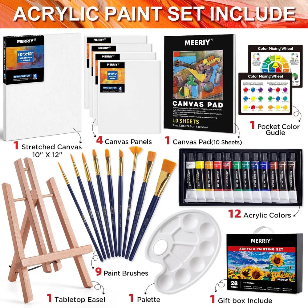 Store New Arrivals Add to Favorite View Feedback Contact Fast deliveries to the customer's home Quality customer service John Make the customers happy! Acrylic Paint Set, Art Painting Supplies Kit with 12 Paints, 10"X 12" Stretched Canvas, Table Easel, Professional Premium Paint Set for Students, Artists and Beginner Description 【Complete Art Painting Supplies】: This set includes everything you need to start creating beautiful masterpieces immediately. The set has 1 wood easel(12in), 9PCS brushes, 12 color tubes (12ml, 0.4oz) acrylic paint, 1Pc 10"x 12" Stretched Canvas, 4PCS 8”x10” Canvas Panels, 1 Palette, 1 Color Mixing Guide and a gift box. Perfect Acrylic Painting Kits for artist of all ages and Skill Levers. 【Multi-function Tabletop Easel】:There is a Versatile table top easel in the Painting kit. This Simple and practical tripod easel is Made of Solid Beech wood with a Smooth, Natural Finish. It mentioned 7.5" wide by 12" high, and the easel angle is adjustable. It can be used as Display or Painting Easel or Ipad stand. No assembly is required. 【Premium Quality Materials】: We understand the importance of using reliable and durable materials for your artwork. That’s why our painting set is carefully curated with premium quality supplies. From the brushes made with fine bristles to the vibrant and long-lasting paints, every item in our set is designed to deliver exceptional performance and ensure your artwork stands the test of time. 【Great Gift Idea】: This complete acrylic painting kit come with a beautifully designed gift box. It's a excellent gift for back to school, birthday, Christmas, festival for your children and friends. It is perfect gift for artists,students, teens, adults kids, and painters of all levels. Great for family fun, bonding time with parents and sisters brothers or at school, it can be an awesome gift where you will never be forgotten. 【Quality Assurance Guaranteed】: At MERRIY, We firmly stand behind the quality of our products. Each product is carefully inspected to ensure it meets our rigorous quality control guidelines before it reaches your hands.Your satisfaction is our top priority. If you're not fully pleased with your paint set, please Simply return the paint set for a no-hassle refund or replacement. Product Description Versatile Display & Painting Easel This Simple and practical tripod easel is Made of Solid Beech wood with a Smooth , Natural Finish. No assembly is required, as the 7.5" wide x 12" high easels tilt back when the third leg is adjusted back.It can be folded flat for easy storage. This reusable easel is perfect for beginners, students, kids' art classrooms, art parties, and wine and painting classes. 9 Professional Paint Brushes 9 size professional paintbrushes with a variety of shapes make mixing color more easy, perfect for artists, adults, students, teens, kids, children and painters of all skill levels. Wonderful gift idea for your friends and families who have fun in painting! Intended for long time use. 4 pack Canvas Panels &1 Stretched Canvas Professional quality canvases for painting. Each art canvas is pre-primed acid-free acrylic gesso, so the painting canvas is easy to color and not easy to crack, the good quality make it possible to keep your cherished paintings for long time. 9" x 12" 10-Sheets Canvas Paper Pad This is is a 8-Ounce triple primed acid-free canvas paper pad,total of 10 sheets in this pad, that are the same material as a traditional canvas without the frame. Top bound pages can be removed for easy framing. Bonding time with family Encourage your child’s creativity and spend time with them by painting together,this allows for meaningful conversations and bonding experiences that you and your child will cherish forever. So grab your paintbrushes and join your child in the wonderful world of art with our acrylic painting set. You’ll be amazed at what you can create together! Perfect Gift Ideal ! This complete acrylic painting set makes an perfect gift for all ages. This painting kit is a great birthday gift or holiday surprise for anyone. Better gift choice for all kinds of festival (Easter, Christmas, Valentine, Halloween, Thanksgiving, New Year).It’s a thoughtful and practical present that will inspire creativity and provide hours of fun and relaxation. Style With H-Frame easel and More canvas Color Assort colors Required Assembly No Material Beech Material Type Beech Item Weight 0.4 Ounces Easel Type H Frame Easel ABOUT US We offer the best prices around on high quality products. Our E-store includes media such as books, movies, music and games while offering electronics, toys, sporting apparel, clothing, tools, general home, garden items and more. SHIPPING We are always working hard to ensure your package arrives as soon as possible. Please understand that some factors like weather, high postal traffic, and the performance of shipping companies are outside of our control. We offer free shipping to the lower 48 states and ship within 2 business days of payment, usually sooner. We do not accept P.O. Boxes. Please provide a physical address. For shipping outside of the continental USA, we only use eBay's Global Shipping Program. The item is shipped to KY and then sent to the rest of the world. International customers are responsible for all duties and taxes. Continue to 'check out' to calculate costs for shipping the item to your country. Messages regarding eBay's Global Shipping Program MUST be directed at eBay EXCLUSIVELY. RETURNS We offer a 30-Day Return Policy on items in which you are not completely satisfied with. You have the option of a full-refund or an exchange of the item. No returns are available on items shipped outside of the USA PAYMENT We accept PayPal. CONTACT US This page content is yet to come Please ad us to your favorite seller and visit again later Thank You CUSTOMER SATISFACTION We try our very best to make sure every customer is completely satisfied. If there