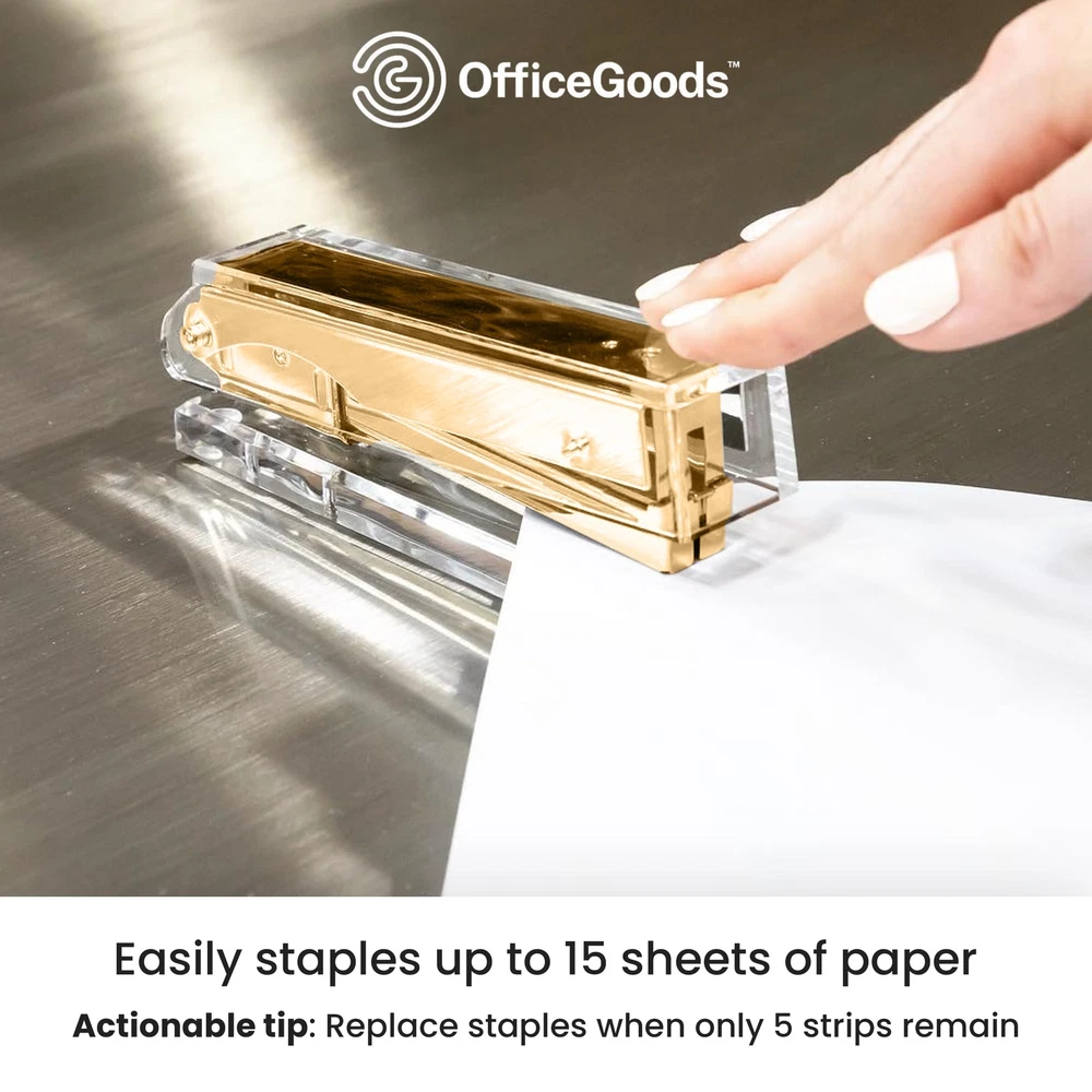 The Acrylic Stapler is elegantly designed with a high transparent luster and a crystal-like appearance with smooth, shiny edges that looks great on anyone's desk. Bring style to your home or office with our gold- or silver-accented acrylic stapler; this handmade product enhances any décor. This cool desk product makes a great gift; create a set with a matching tape dispenser and pencil holder (sold separately). Using standard staples (not included), you can easily attach 12-15 sheets, while non-skid feet help reduce movement and provide stability. This one-hand stapler will shine on your desktop or is small enough to fit in a drawer conveniently. Made with heavy acrylic for daily use and measures 5.25" L x 1.25 W x 2.5" H; clean as needed with a damp cloth. Unique stapler design - Elevate your workspace with a stapler for desk that combines form and function. This manual office stapler unites acrylic and metal for a modern look and aesthetic appeal. Reliable Stapling Performance - Effortlessly staple up to 15 sheets with this sleek stapler for your desk. Measuring 5.30 L x 1.30 W x 2.50 H, it uses standard 1/4" staples for everyday tasks. Multiple use - This long stapler weighs 10.8 ounces; it's a versatile tool that can be used for stapling and holding down paper. For optimal stapling, replace staples when the strip reaches five. A fancy stapler for colorful ideas - choose from these bright colors to complement your style. Available in rose gold, green, purple, pink, blue, silver, golden. Match your - offers acrylic staplers and many more essential office products, creating a stylish and cohesive look, all crafted with the best quality and aesthetic design in mind.