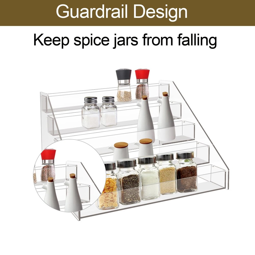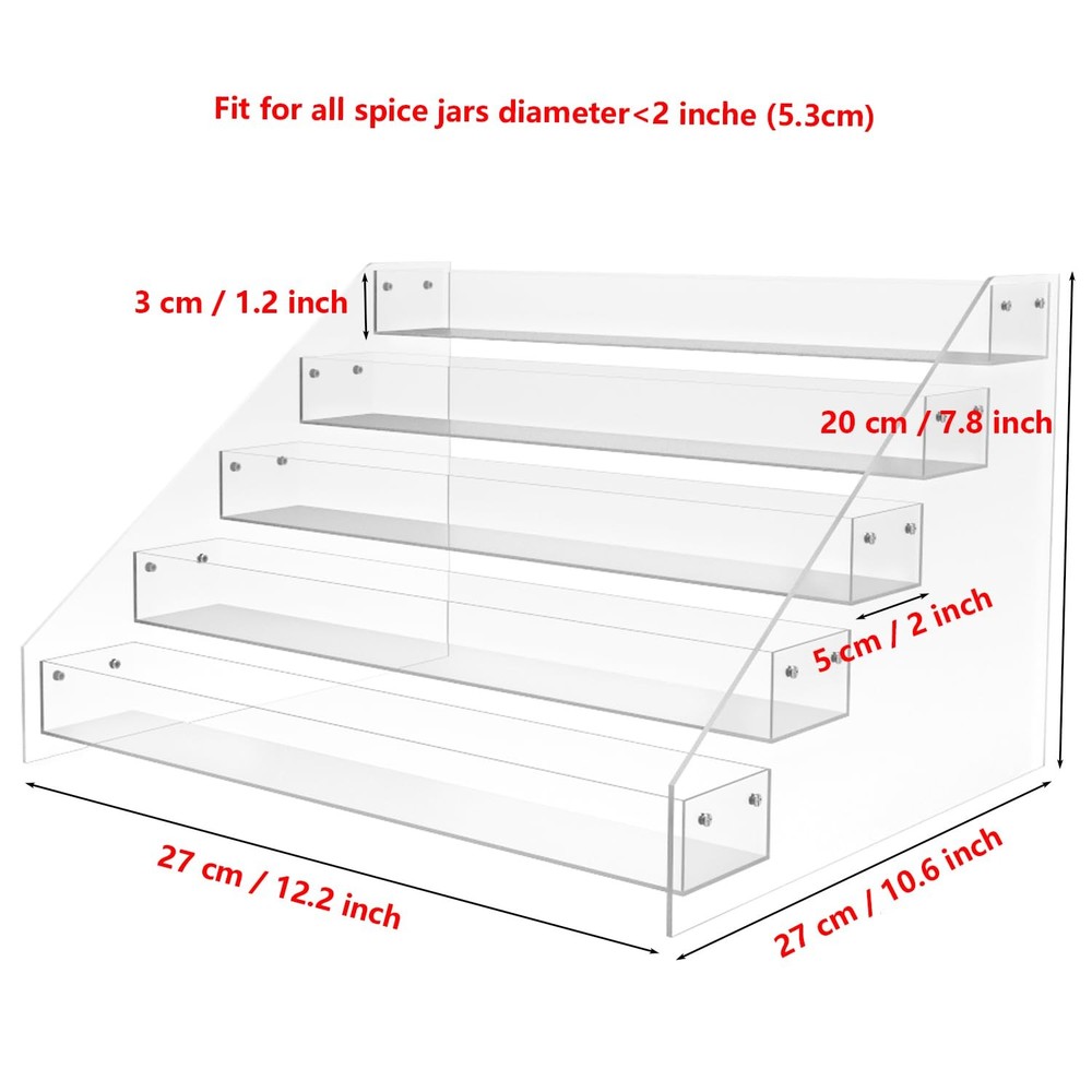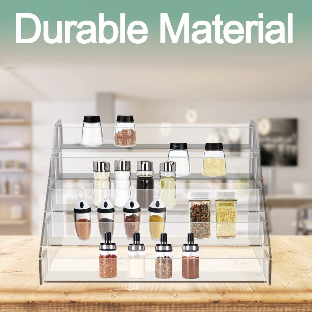 This can organizer helps you save space in your kitchen or cupboard, keeping it tidy and easy to find what you need. It is versatile enough to display perfumes and makeup on the vanity, or everyday toiletries on the bathroom counter. The most important thing is to enjoy your neat and tidy space and enjoy a comfortable life. THREE SPECIFICATIONS LET YOU CHOOSE 3 Tiers ----12.21 x 6.33 x 4.56 inches 4 Tiers ---- 12.21 x 6.2 x 8.1 inches 5 Tiers ---- 12.21 x 7.8 x 10.6 inches 6 Tiers ---- 12.21 x 9.5 x 13.5 inches The height of each tier of acrylic shelf is 1.22 inch . Multiple specifications and multiple choices, just to create better products for you. DIMENSIONS: Each shelf is 12.21 inches long and 2.08 inches wide. The height of each tier of acrylic shelf is 1.22 inch. Multiple specifications and multiple choices, just to create better products for you. EASY TO USE: The tiered kitchen countertop organizer can easily help you organize spice bottles and keep your countertop tidy at all times. Layered transparent spice stairs give you maximum visibility and easy access to spices while cooking in the kitchen. DURABLE MATERIAL: The seasoning organizer is made of high-quality acrylic material, and countertop spice rack is sturdy and durable with a smooth and flat surface. Pantry organization and storage can be easily cleaned with a damp cloth. GOOD ORGANIZER: Pantry organization and storage are not just spice racks, vertical spice rack can be used in cabinets, shelves, counters or pantries. You can also store figurines, skin care products, medicines, essential oils, nail polish, stationery, personal accessories, and more. KEEP SPICE SAFE: Each shelf is surrounded by baffles, which are enclosed on all sides to keep them from slipping when you move the seasoning you need.