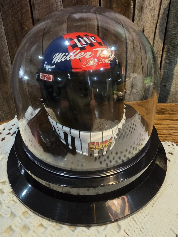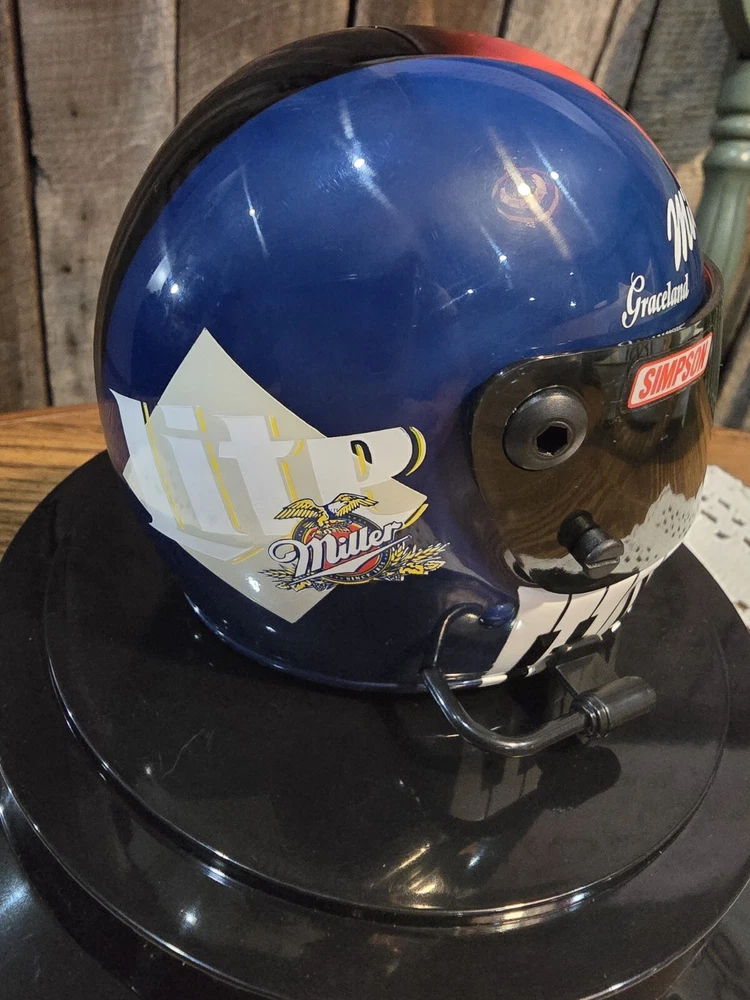 This is a special edition Miller Lite helmet worn by Rusty Wallace in the 1998 NASCAR race. The helmet features a unique Elvis Presley design, as Rusty is a fan of the King of Rock and Roll. This item is perfect for collectors of racing memorabilia and fans of NASCAR. It is a great addition to any sports fan's collection.