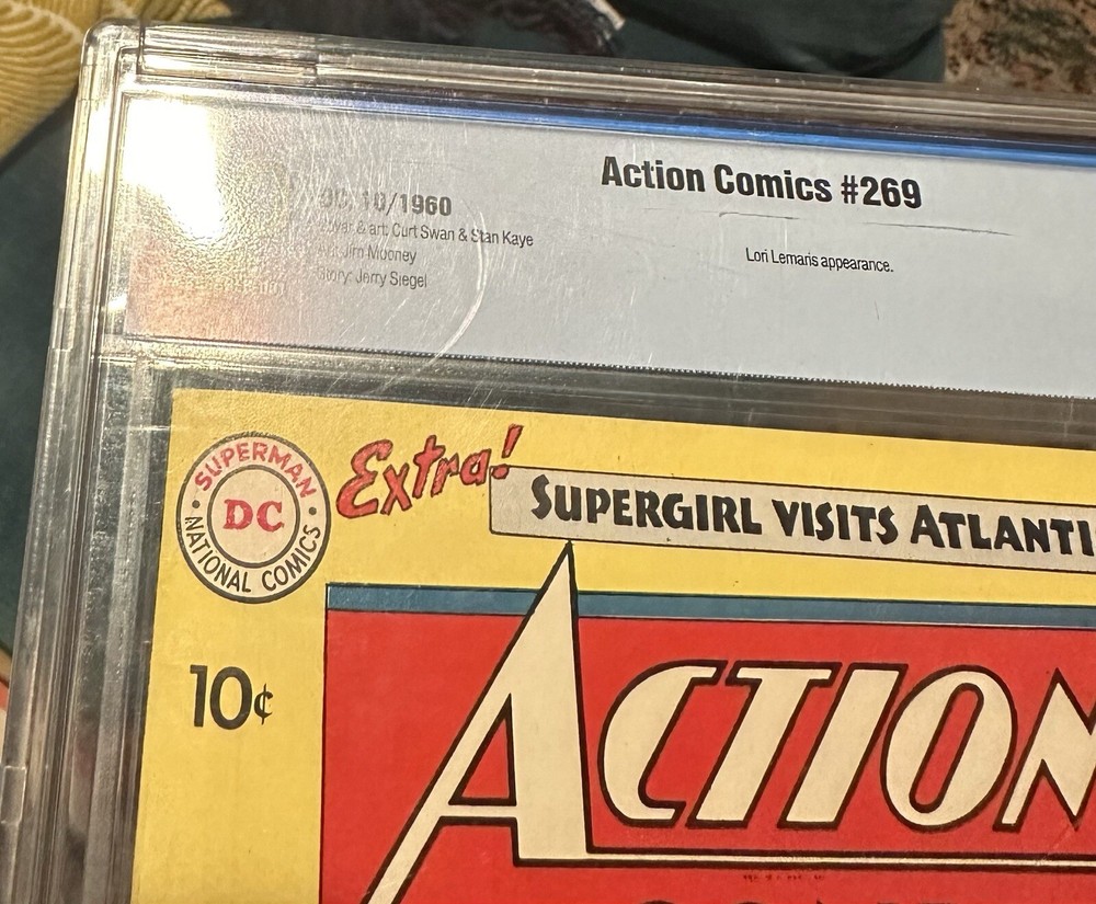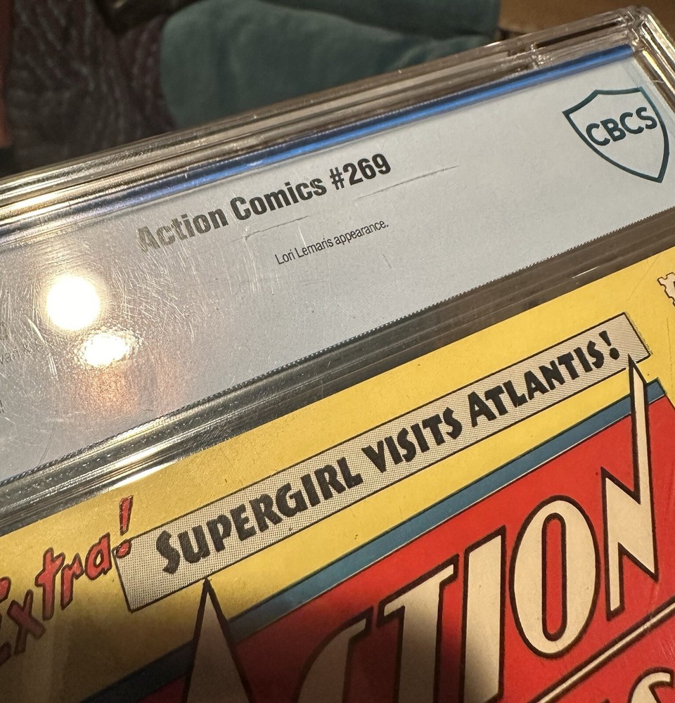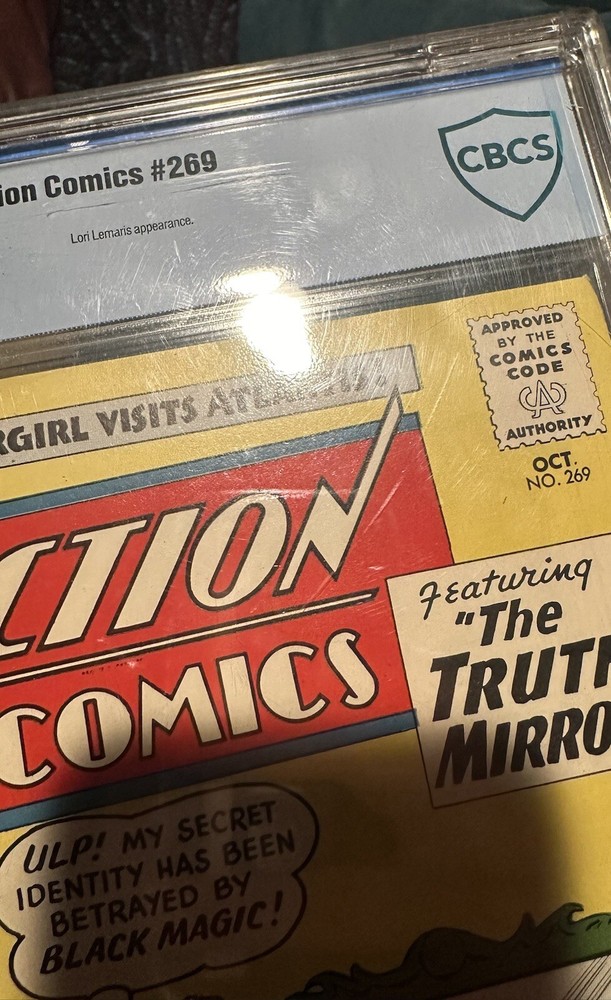Listed is Action Comics #269 (1960). It is CBCS graded at a 7.0 with WHITE PAGES. Lori Lemaris appearance. This issue features "THE TRUTH MIRROR!" - Superman's identity has been betrayed by black magic. Extra! Supergirl Visits Atlantis! There are some small scuffs on the CBCS slab - please review the pictures carefully. This item is sold as-is.