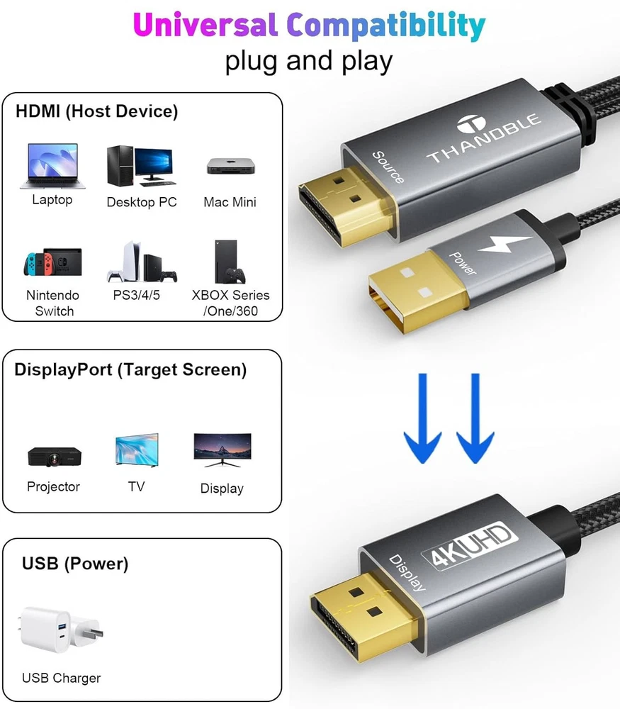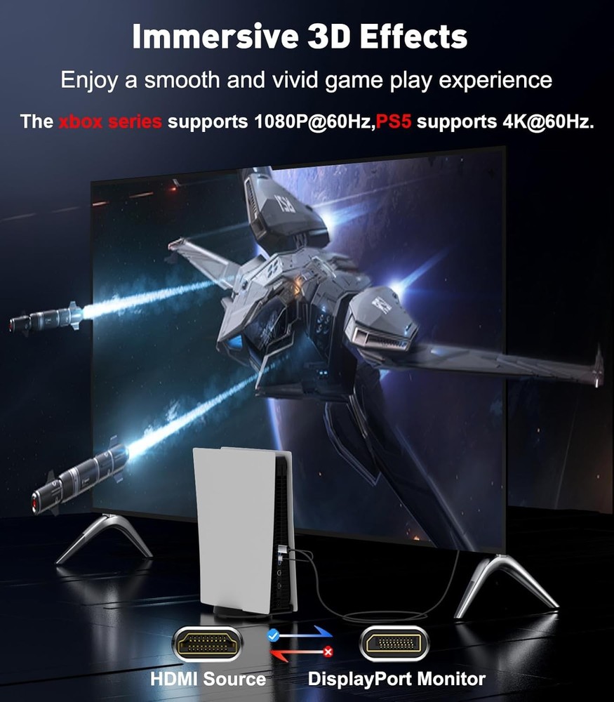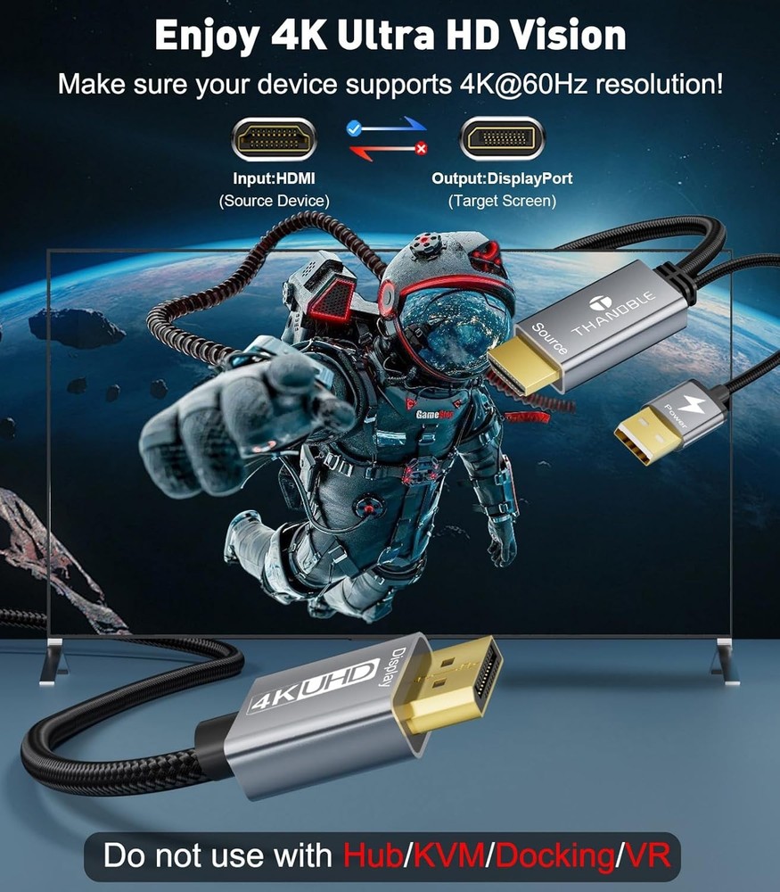 Active HDMI to DisplayPort Cable 6FT (4K60Hz), Uni-Directional HDMI Source to Display Port Monitor Cable, Male to DP Female Compatible PC, Graphics Card, Laptops, PS5 Product Details Package Dimensions : 7.91 x 6.34 x 0.83 inches; 5.29 ounces Item model number : HDMI to DisplayPort Cable Manufacturer : THANDBLE Brand: THANDBLE Connector Type: DisplayPort, HDMI Cable Type: HDMI to DisplayPort cable Compatible Devices: PC, Desktop, Graphics Card, Laptop,Ultrabook,Raspberry Pi, MacBook Pro, Mac Mini, PS 5/4/3, Xbox One/360, Chromebook, TV Box PC, Desktop, Graphics Card, Laptop,Ultrabook,Raspberry Pi, MacBook Pro, Mac Mini, PS 5/4/3, Xbox One/360, Chromebook, TV BoxPC, Desktop, Graphics Card, Laptop,Ultrabook,Raspberry Pi, MacBook Pro, Mac Mini, PS 5/4/3, Xbox One/360, Chromebook, TV Box See more Special Feature: Braided Crystal Clear 4K High Resolution: THANDBLE HDMI to DP cable adapter is a necessity for your home entertainment or out of office, amazing 4K@60Hz UHD resolution can bring you extraordinary visual clarity, and backward compatible with 4K@30Hz, 2K@60Hz,1080P@120Hz/1080P@60Hz, 1080i, 720P resolution.(Note :It is not a bi-directional converter, it can only transfer signals from HDMI to DisplayPort in one direction. not supported 1440P@144Hz and function DDC/CI) Wide Compatibility: HDMI to Display Port cable supports everything from connecting a video source from the HDMI port to the DP port for display, compatible with PCs, desktops, graphics cards, laptops, AMD, NVIDIA, Raspberry Pi, MacBook Pro, ps5/4/3, Xbox One/360 and other devices with HDMI output port ( Note: Switch and Xbox series only support 1080P@60Hz resolution display) The Best Material Structure Design: HDMI to DisplayPort cable adopts multi-layer signal shielding structure, effectively shielding electromagnetic interference, transmission is smoother, one-piece aluminum alloy shell can give full play to the advantages of heat dissipation, so that you no longer need to worry about heat-induced problems, and to reduce signal transmission loss to achieve lossless transmission, gold-plated ports are able to transmit more stable signals. Plug and Play, Safe and Simple: Easy to install, plug and play, plug in the USB power supply that comes with the cable to power the built-in IC chip before use to achieve the most perfect display effect, no need to install any drivers and software. Easily transfer perfect audio and video signals from HDMI video source device to DP display device at high speed.(Note: Please make sure the HDMI source device and DP display device support 4K@60Hz resolution)