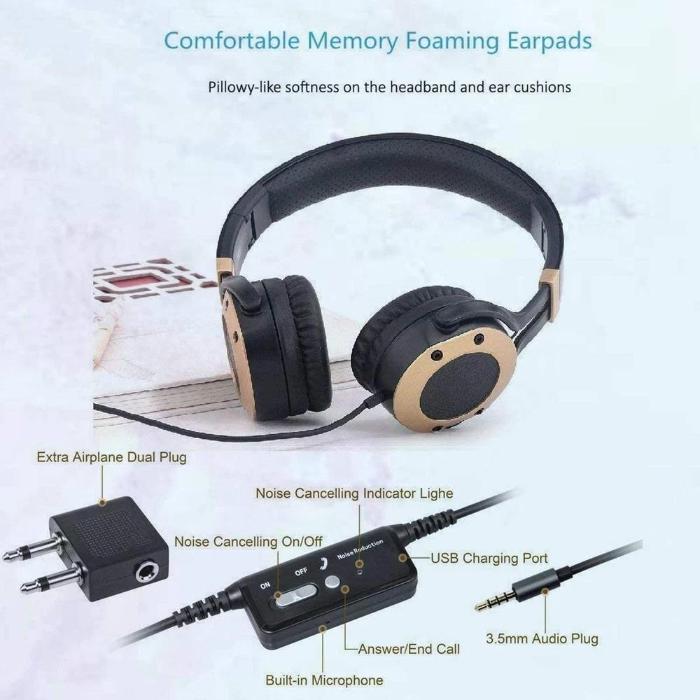 ACTIVE NOISE CANCELLING: Internal precision noise reduction circuitry effectively eliminates up to 85% of background noise. Ideal for use when traveling by airplane,making it a must-have for peaceful sleep and enjoyable audio experience in airplane.or simply when encountering noisy environments in daily life PREMIUM HIFI SOUND: Premium 40mm diameter stereo driver units ensure a high quality auditory experiencefeaturing rich bass, as well as powerful and balanced sound SUPER COMFORTABLE: Adjustable headband, skin texture memory foaming ear pads, lightweight around-ear fit for different head sizes, you can wear all day long. Tips: please take off the headphone in every 2 hours to get your ears relax and to get a better hearing enjoyment LONG BATTERY LIFE: Rechargeable Long-lasting Li-Ion Battery provides up to 20 hours of continuous use DUAL USAGE STATES: Never worry about being out of battery power! The headphones can operate without battery power (with noise cancelling turned off); Packed with a headphone splitter and can also be used to the PC or computer that only had separate microphone and headphone jacks
