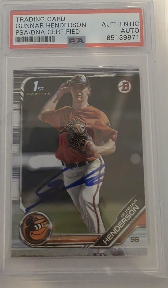 3 of Today's Baseball superstars future hall of famers. When collecting Autographs everyone knows there's nothing better than the actual player's hand writing Signatures! We also know a signature means nothing without certification. Rest easy with the satisfaction of having PSA The leader of grading and certification guarantee! These cards have been given the top Autograph grades of GEM MINT 10. PSA/DNA CERTIFIED JULIO RODRIGUEZ AUTOGRAPH 2020 BOWMAN DRAFT 1ST ROOKIE CARD ON CARD SIGNATURE GUNNER HENDERSON AUTOGRAPH 2019 BOWMAN DRAFT ROOKIE ON CARD SIGNATURE RONALD ACUÑA JR. AUTOGRAPH 2023 TOPPS SERIES 1 ON CARD SIGNATURE