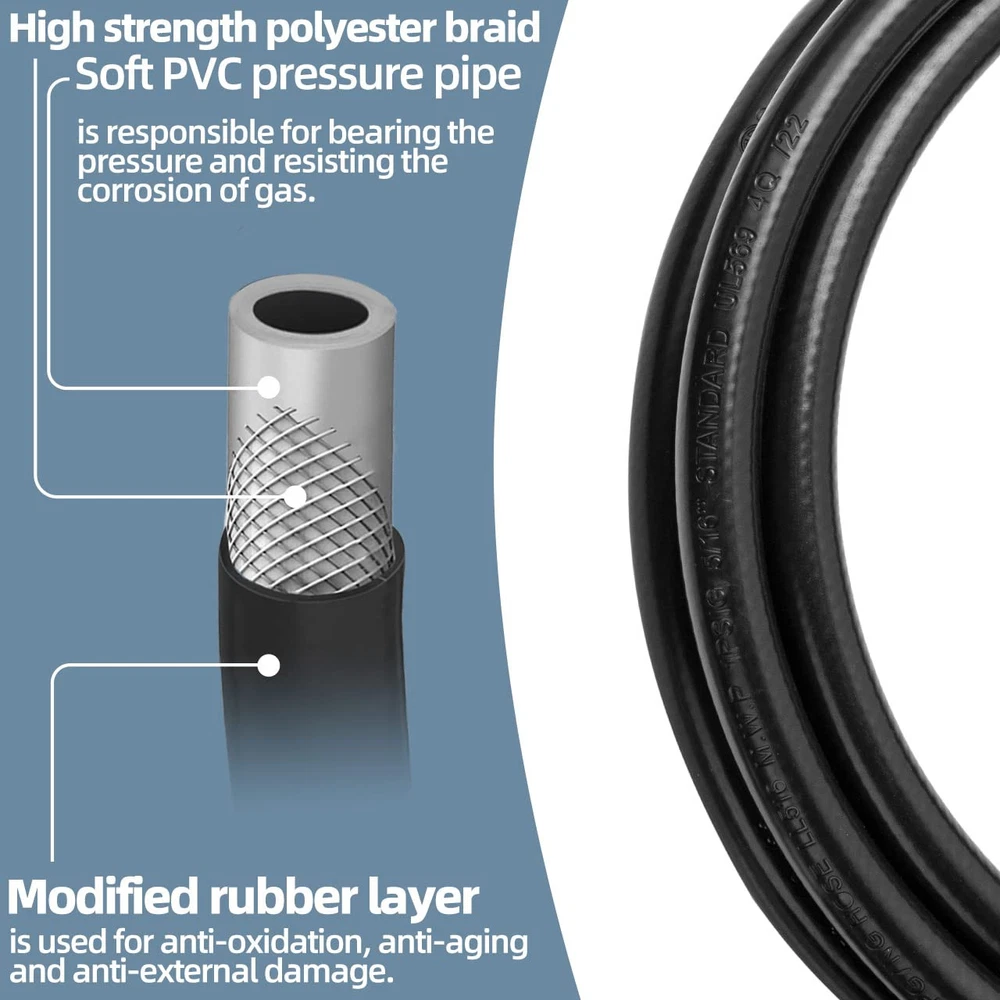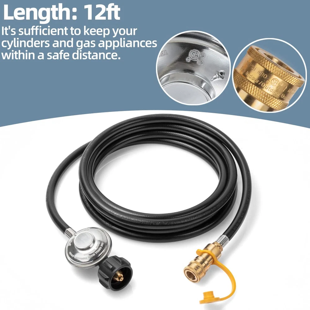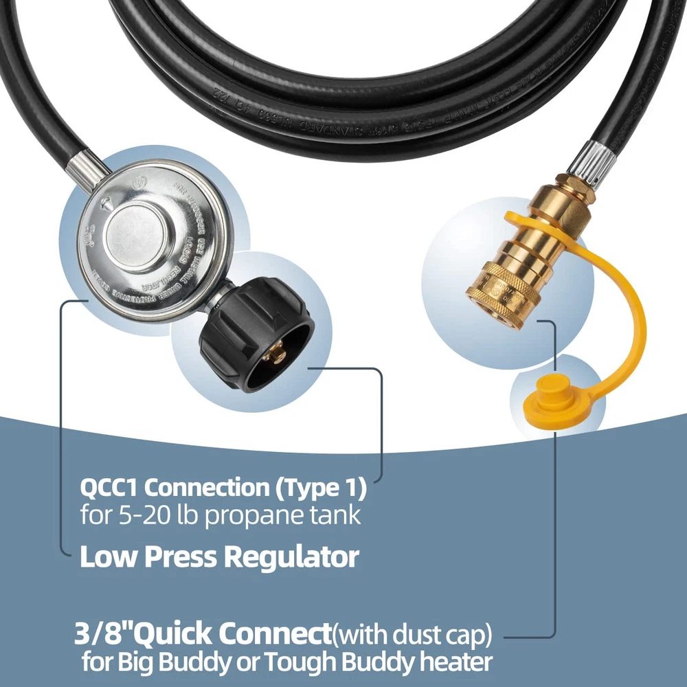 Wide Application: 12ft propane hose with regulator and quick connect is most commonly used to hook a Big Buddy or Tough Buddy heater to a 20 lb. propane cylinder. 12 Feet propane hose provides sufficient connection length to use at a safe distance without the need to approach the heat source. Easy to Install: Includes a regulator with Acme nut for easy installation. Hand wheel for tightening, female quick connect fits any standard 3/8 male quick connect (SAE fitting). Durable Material: Our propane tank adapter hose is made of heavy duty Brass and durable rubber Material. Solid brass provides secure connection between appliance and tank. The rubber hose is leak-proof, explosion-proof, wear-resistant and corrosion-resistant. Double Layers Structure: Inner layer is responsible for bearing the pressure and resisting the corrosion of gas. Outler layer is used for anti-oxidation, anti-aging and anti-external damage. Tested by CSA to meet U.S. and Canadian Standards.