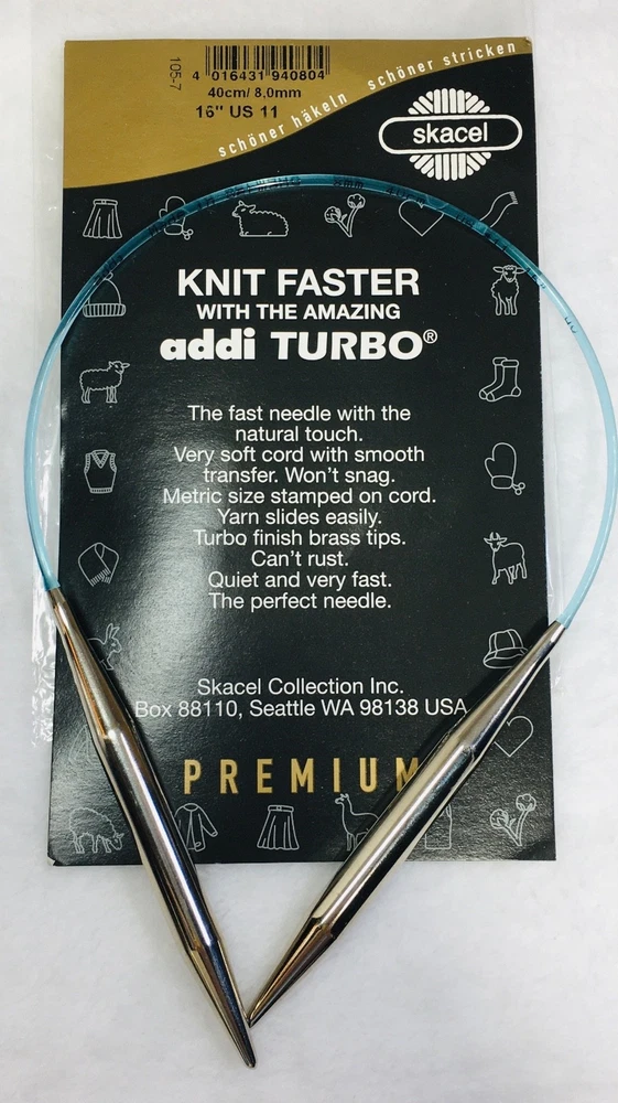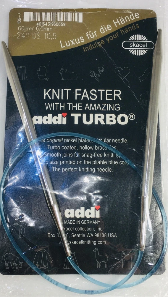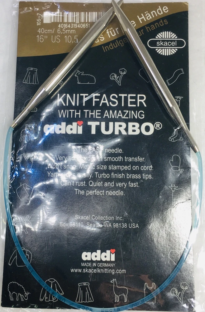 Up For Your Consideration Today: One (1) Pair Of Circular Knitting Needles with Addi quality cords and joins Addi Turbo Original Circular Knitting Needles * Slick addi Turbo nickel-plated finish. * Soft pliable blue cords * Smooth joins for snag-free knitting. * Size stamped on cord on larger sizes. * Hollow, coated brass tips. * Made in Germany Condition: Preowned, in like-new condition. Always stored in my craft room under heat and air. Clean, no spots or stains, and no bad odors. I have a lot of Addi knitting needles for sale in my eBay store right now. I combine shipping, to learn how … please read last photograph. Please see a ll the photos of these needles - click on them to zoom in and make them larger. These photos are the best description of these knitting needles. The last photograph explains how to combine shipping when you purchase more than one listing from my eBay store at the same time. I make every effort to accurately describe items, and photograph the true color, but if I misrepresented an item, please contact me first through eBay, so that I may resolve the situation, before leaving neutral or negative feedback. I strive to keep my 100% feedback rating. Thank you for looking at my listings and being supportive of my efforts. My home is smoke and pet free.