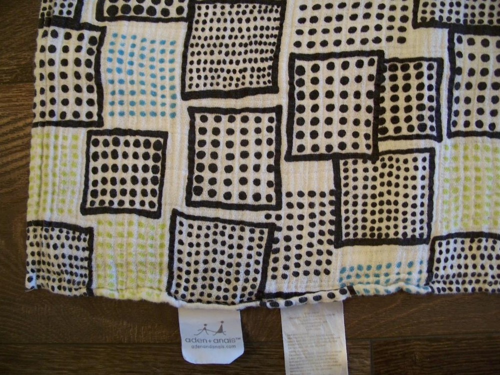 ADEN + ANAIS~100% Cotton Muslin Swaddling Blanket~black~aqua~lime dots squares ADEN + ANAIS~100% Cotton Muslin Swaddling Blanket~black~aqua~lime dots squares Aden + Anais Swaddling Blanket *Size: approx. 43 inches by 49 inches *Fabric: 100% cotton muslin *Color: white/black/aqua blue/lime green *Condition: great, pre-owned blanket; freshly laundered; no stains *We have a smoke-free home. Listing and template services provided by inkFrog