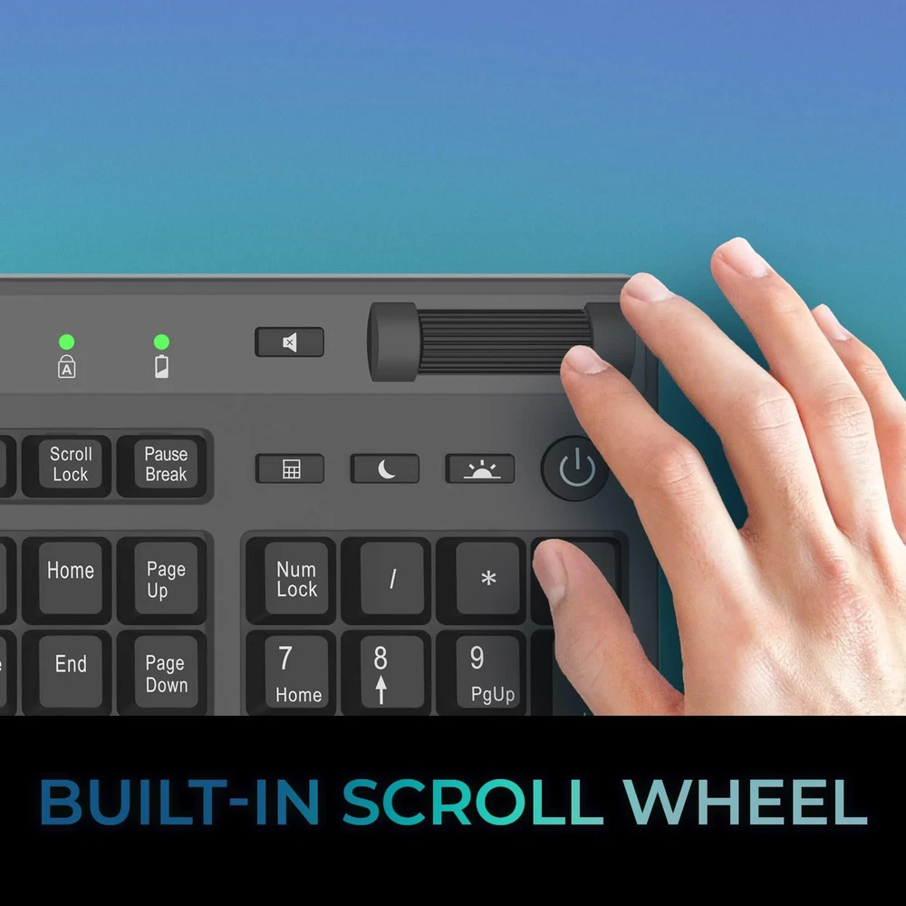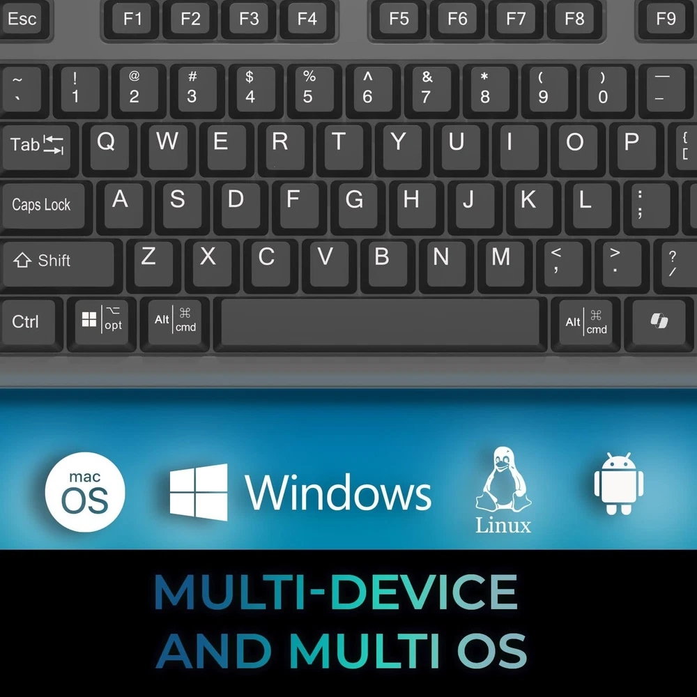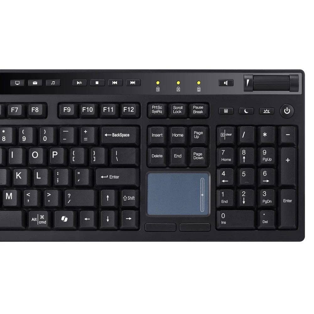 The Wireless Touchpad Keyboard offers a complete solution for those seeking a seamless computing experience with 2.4GHz RF wireless technology and a 30 ft range. Designed for ultimate convenience, it features a built-in touchpad with left and right mouse buttons and a scroll pad, eliminating the need for a separate mouse. The 104-key QWERTY layout provides a familiar and comfortable typing experience, while 13 Internet hotkeys and 8 multimedia hotkeys ensure quick access to essential functions. Its sleek, modern design with chrome accents and a piano finish makes it a stylish addition to any workspace. Compatible with Windows 10 and above, as well as notebooks, iPads, iMacs, and smart phones with USB connectivity, this keyboard is a must-have for those who value efficiency and elegance. Wireless Convenience: Enjoy seamless connectivity with 2.4GHz RF wireless technology powered by 2 AAA Batteries. No cables or line of sight required. Up to 30 ft working range. Integrated Touchpad: Built-in touchpad eliminates the need for a mouse, includes left and right mouse buttons and a scroll pad for effortless navigation of documents and web pages Multimedia Hotkeys: 13 Internet hotkeys for quick access to Home Favorite Back Forward Refresh Stop Search My Computer Email Calculator Sleep Wake Power. 8 multimedia hotkeys for volume and media control Full 104 Key Layout: Standard US QWERTY keyboard layout with membrane keys for a comfortable typing experience. num lock caps lock and battery low indicators for easy monitoring Compatibility: Works with Windows 10 and above PCs notebooks iPads iMacs and smart phones with USB connectivity; nano USB wireless receiver for plug and play setup